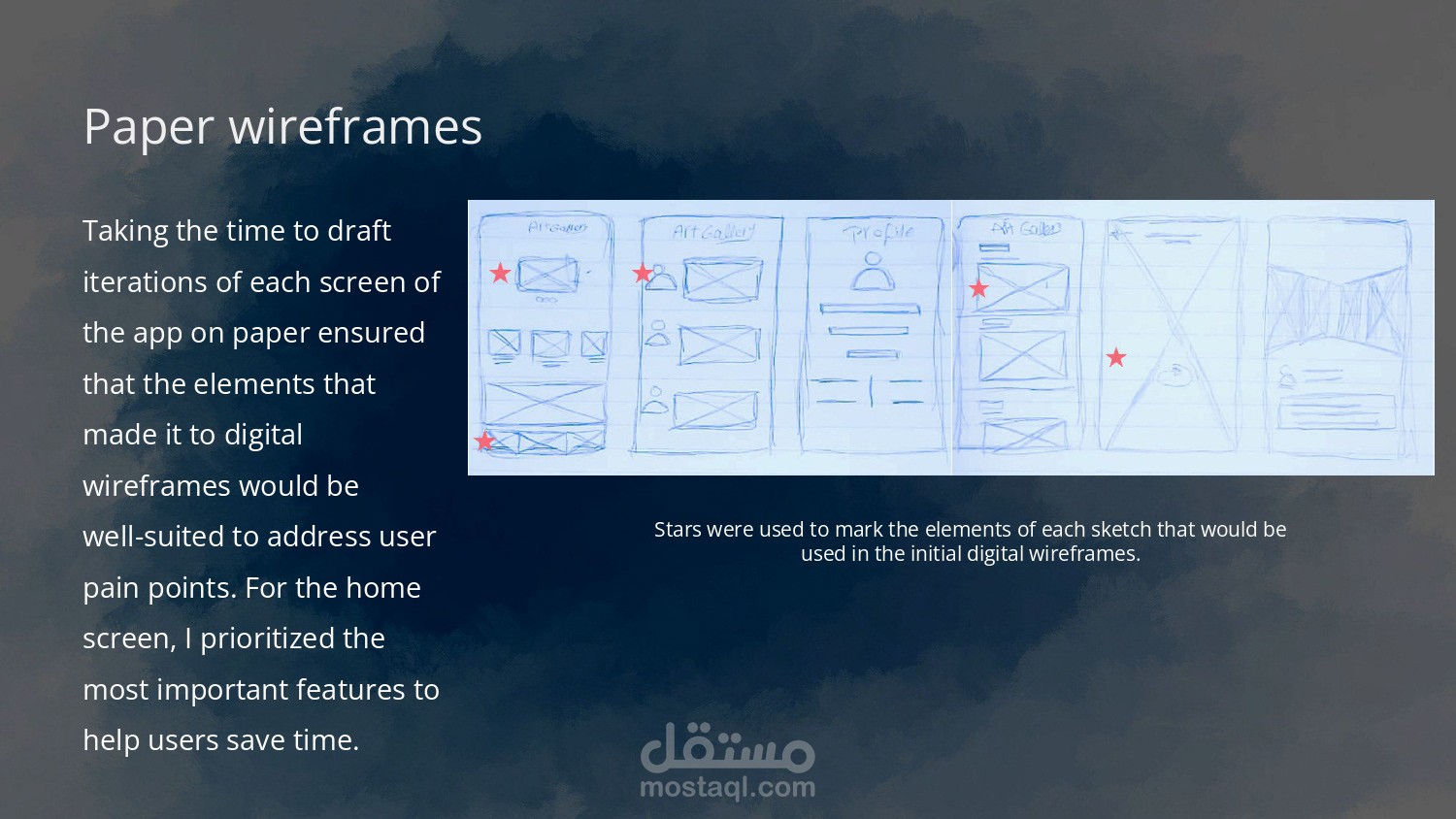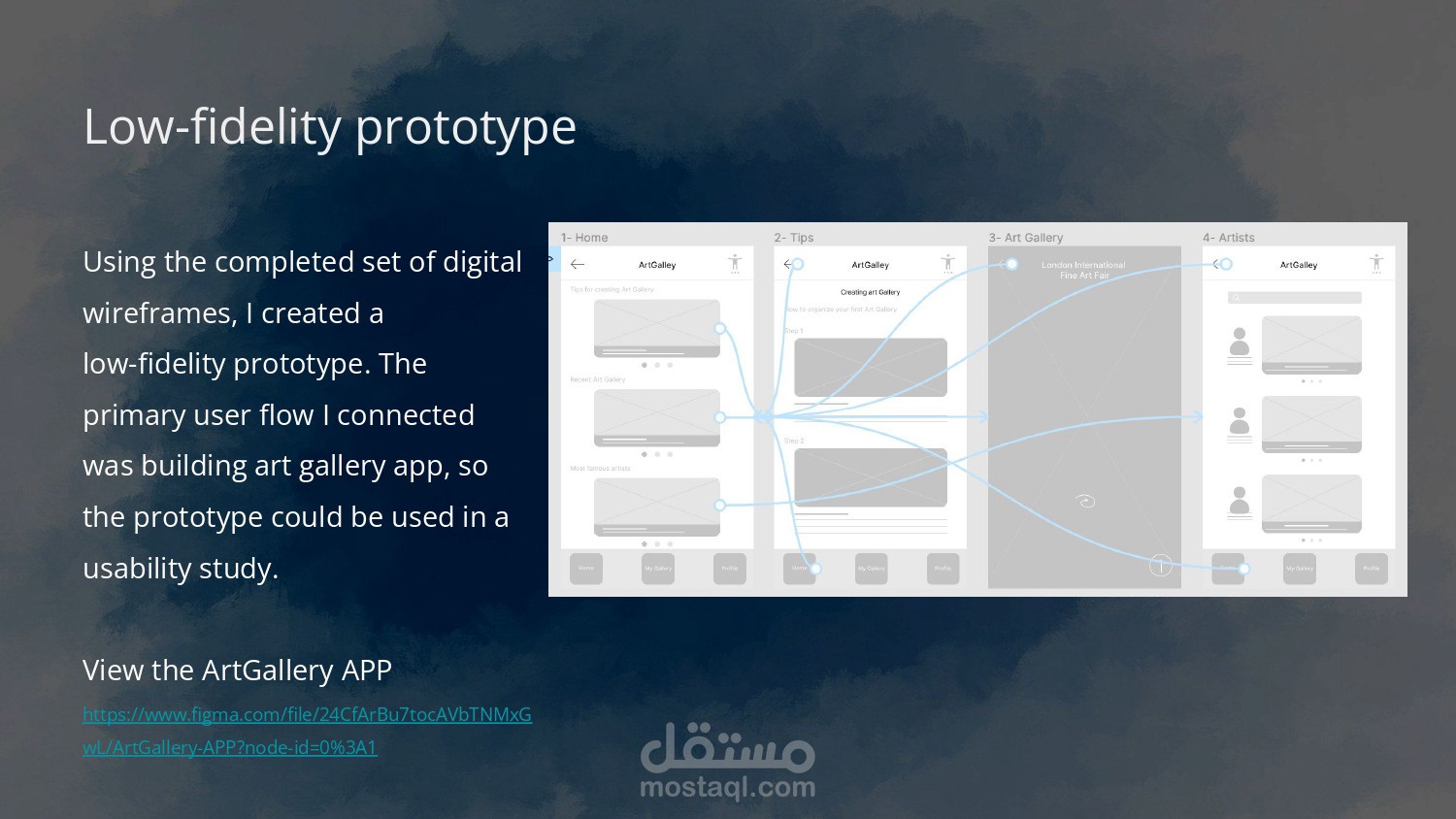 تم تصميم المشروع بالكامل باستخدام Figma، مع التركيز على واجهة عصرية وبسيطة. تم إعداد wireframes لتوضيح رحلة المستخدم، ثم إنشاء نماذج تفاعلية (prototypes) لعرض طريقة عمل التطبيق. ارتكز التصميم على سهولة الاستخدام، وضمان تجربة بصرية جذابة تدعم الإبداع الفني.