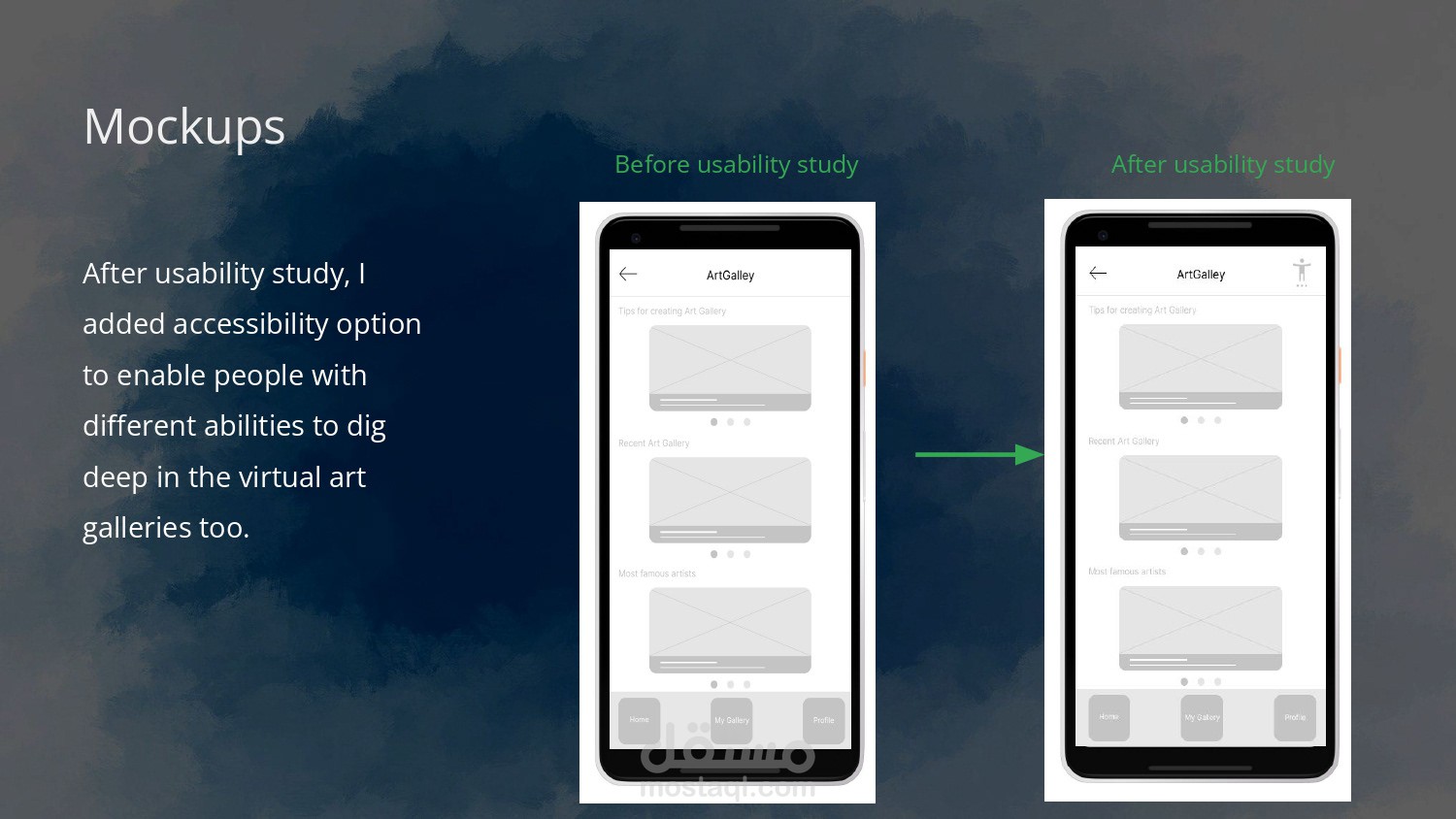 واجهة سهلة الاستخدام تشمل أقسام: الرئيسية، معرضي، والملف الشخصي.