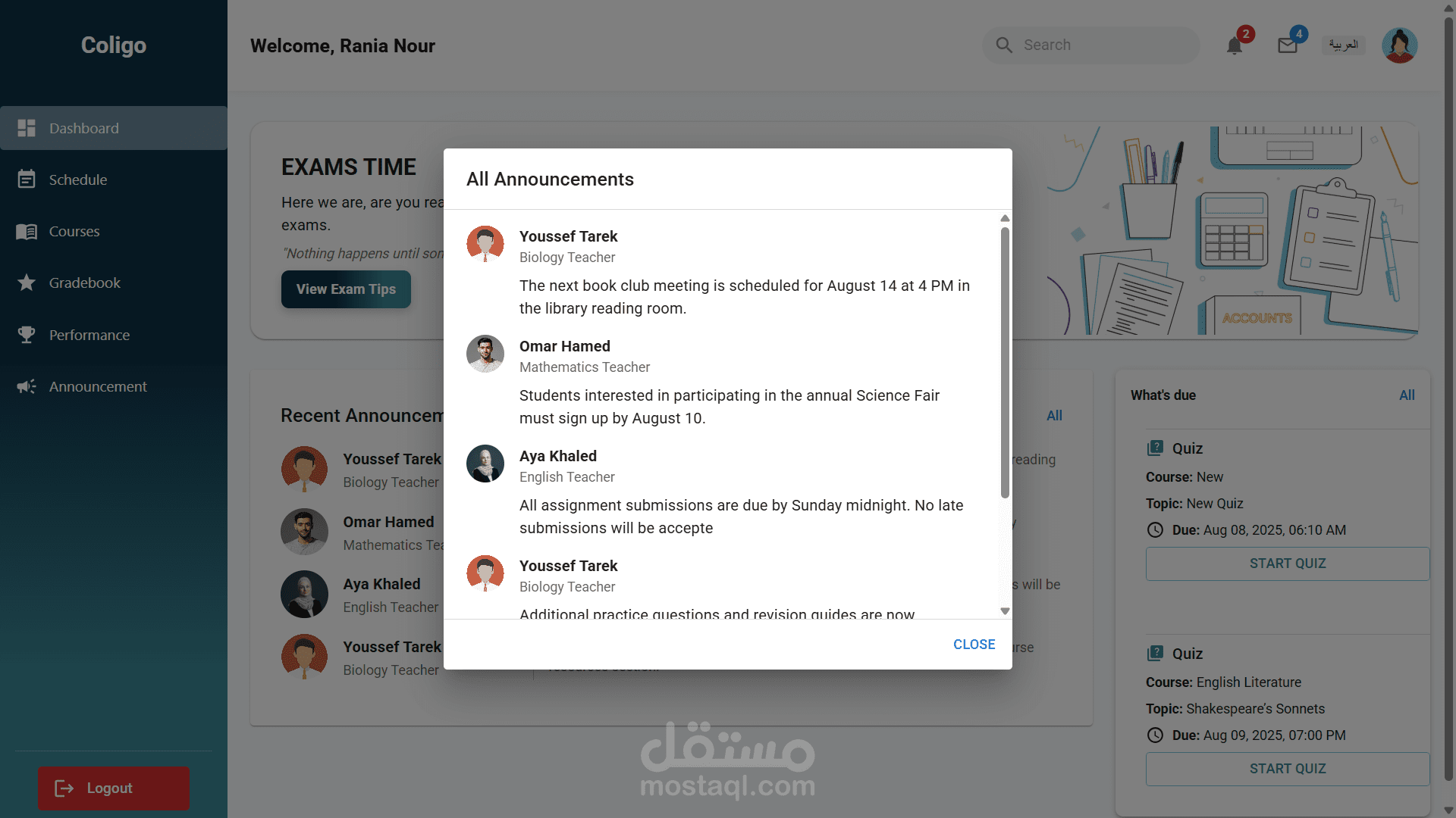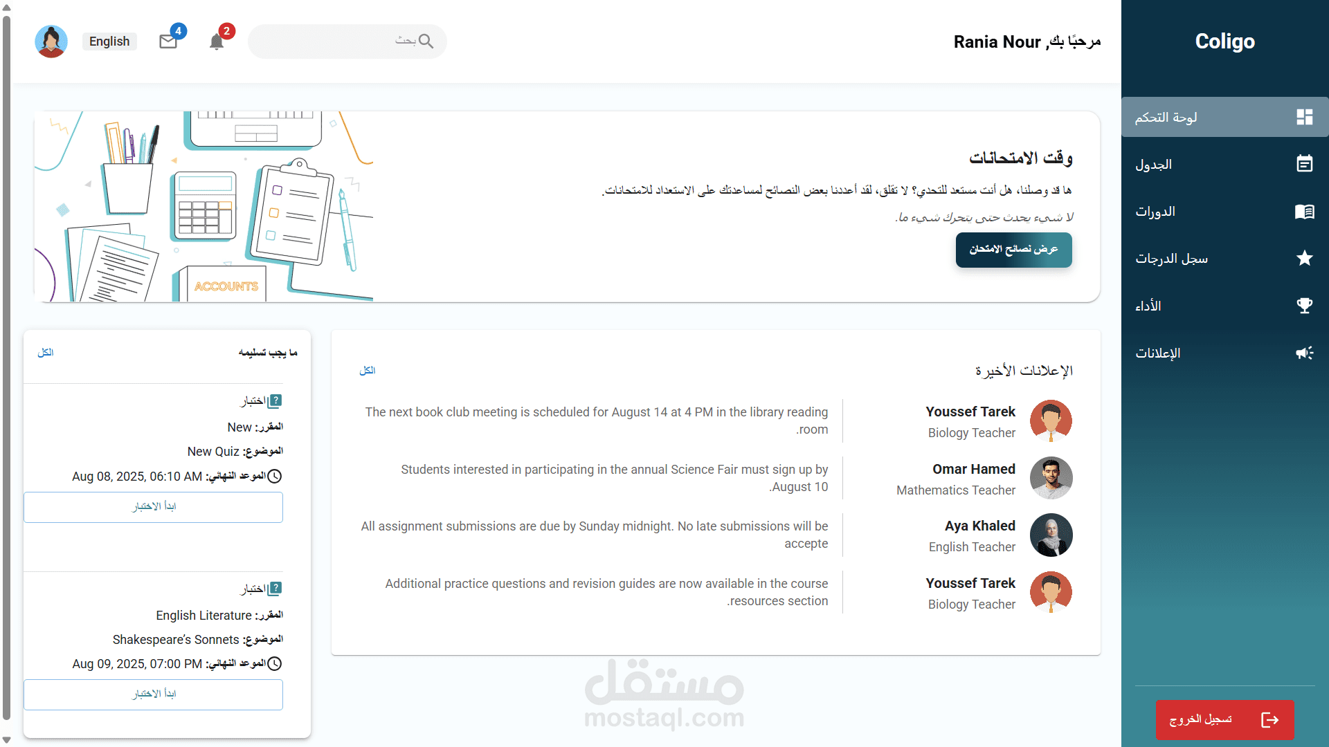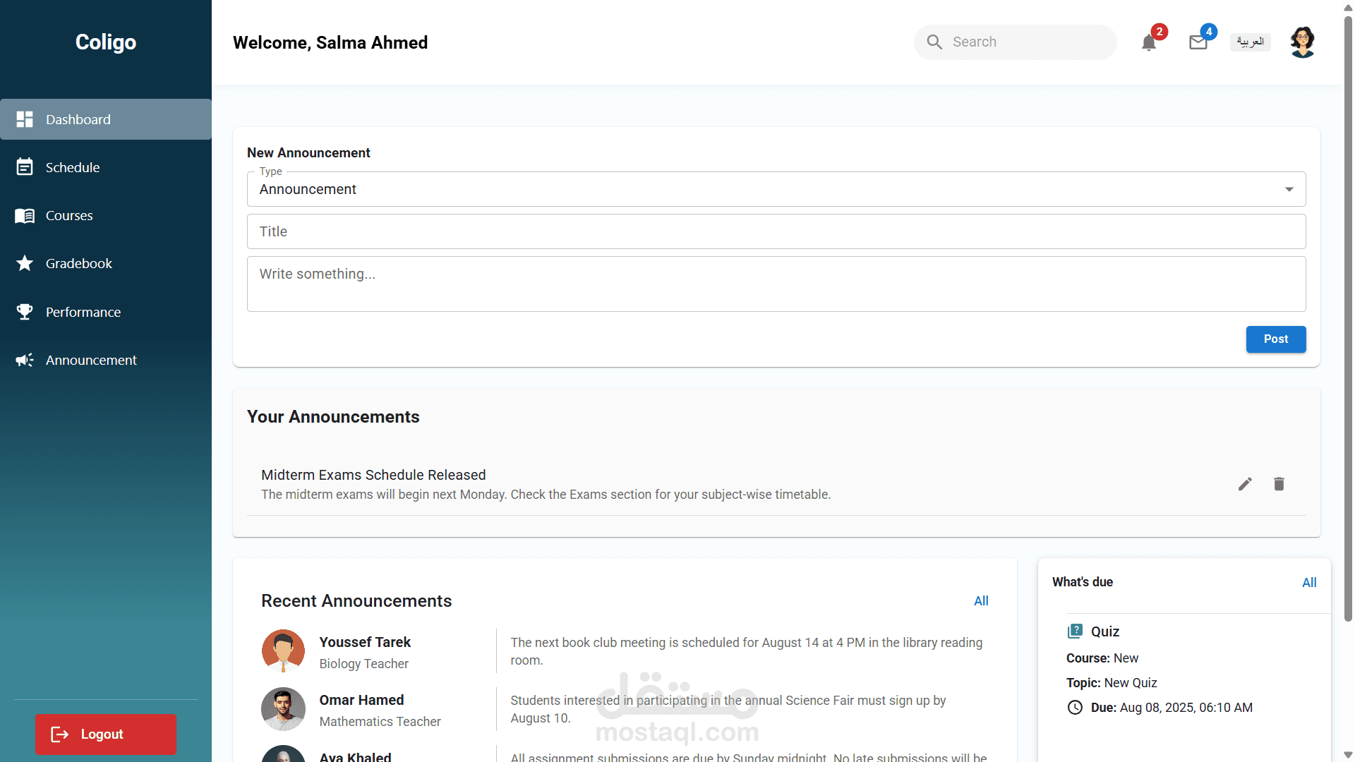 طورت لوحة تحكم تعليمية متكاملة تساعد الطلاب على متابعة الإعلانات والاختبارات الخاصة بالفصل الدراسي، مع لوحة خاصة بالمدرسين لإدارة المحتوى.