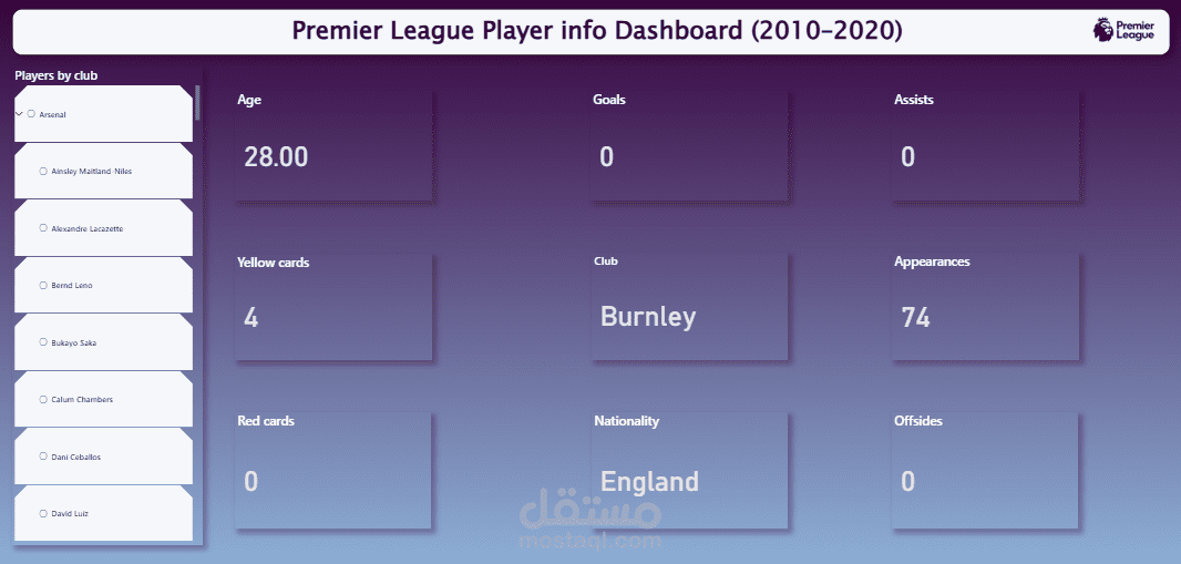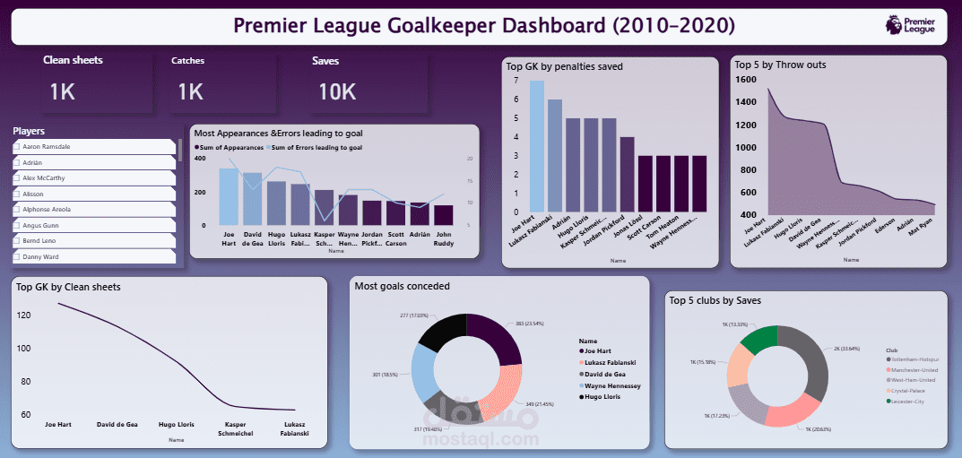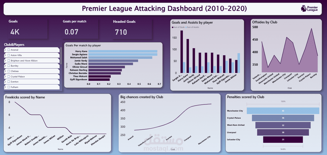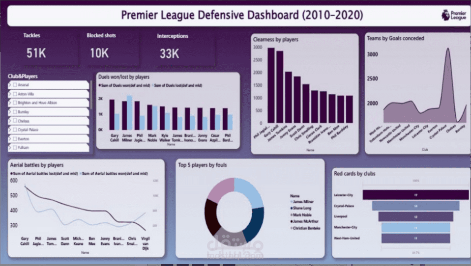 أنجزت مشروع شامل باستخدام Power BI لتحليل الدوري الإنجليزي الممتاز على مدى عشر سنوات، بحيث يغطي كل الجوانب الهجومية والدفاعية مع تقييم أداء اللاعبين والحراس بشكل فردي.