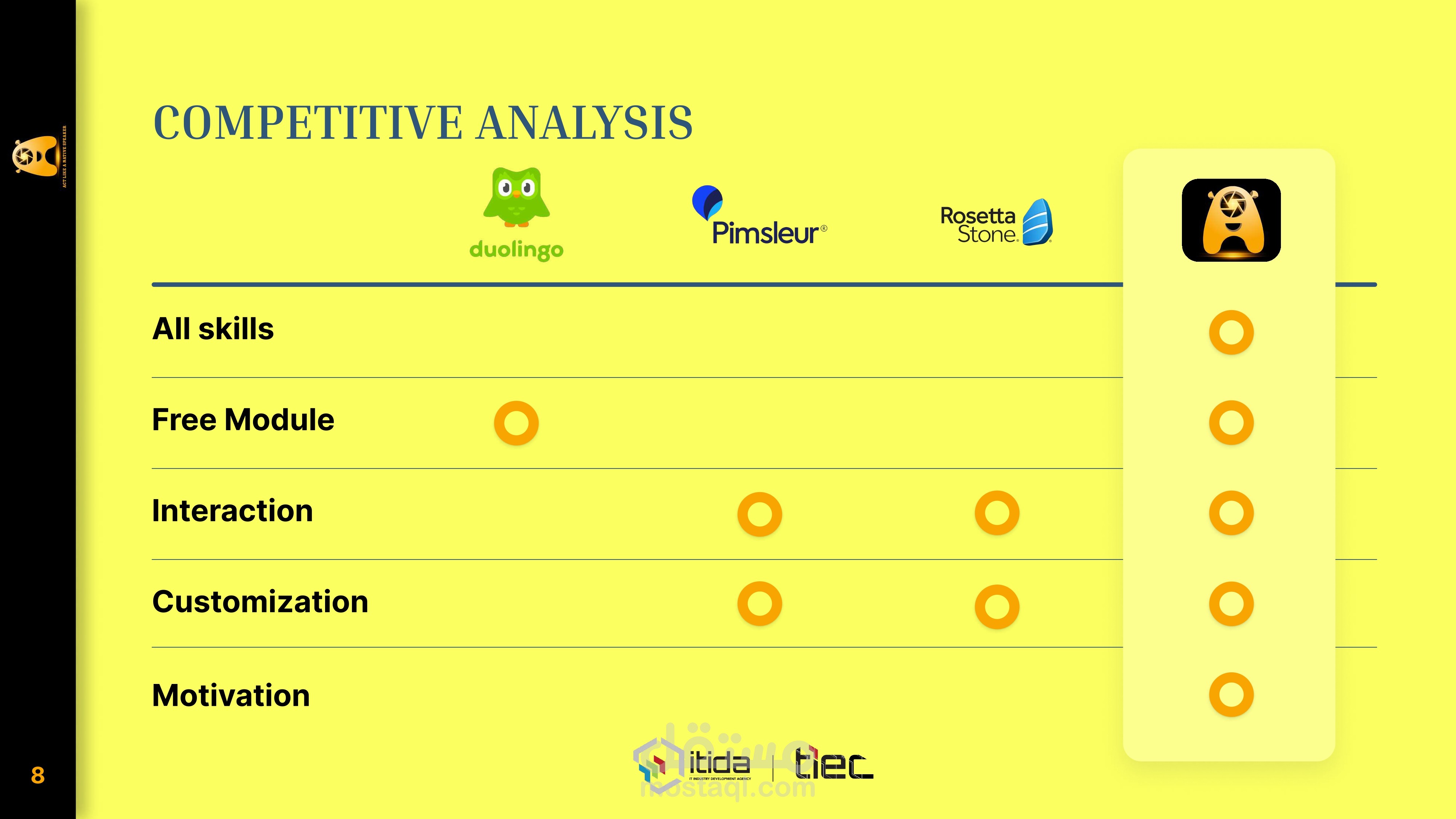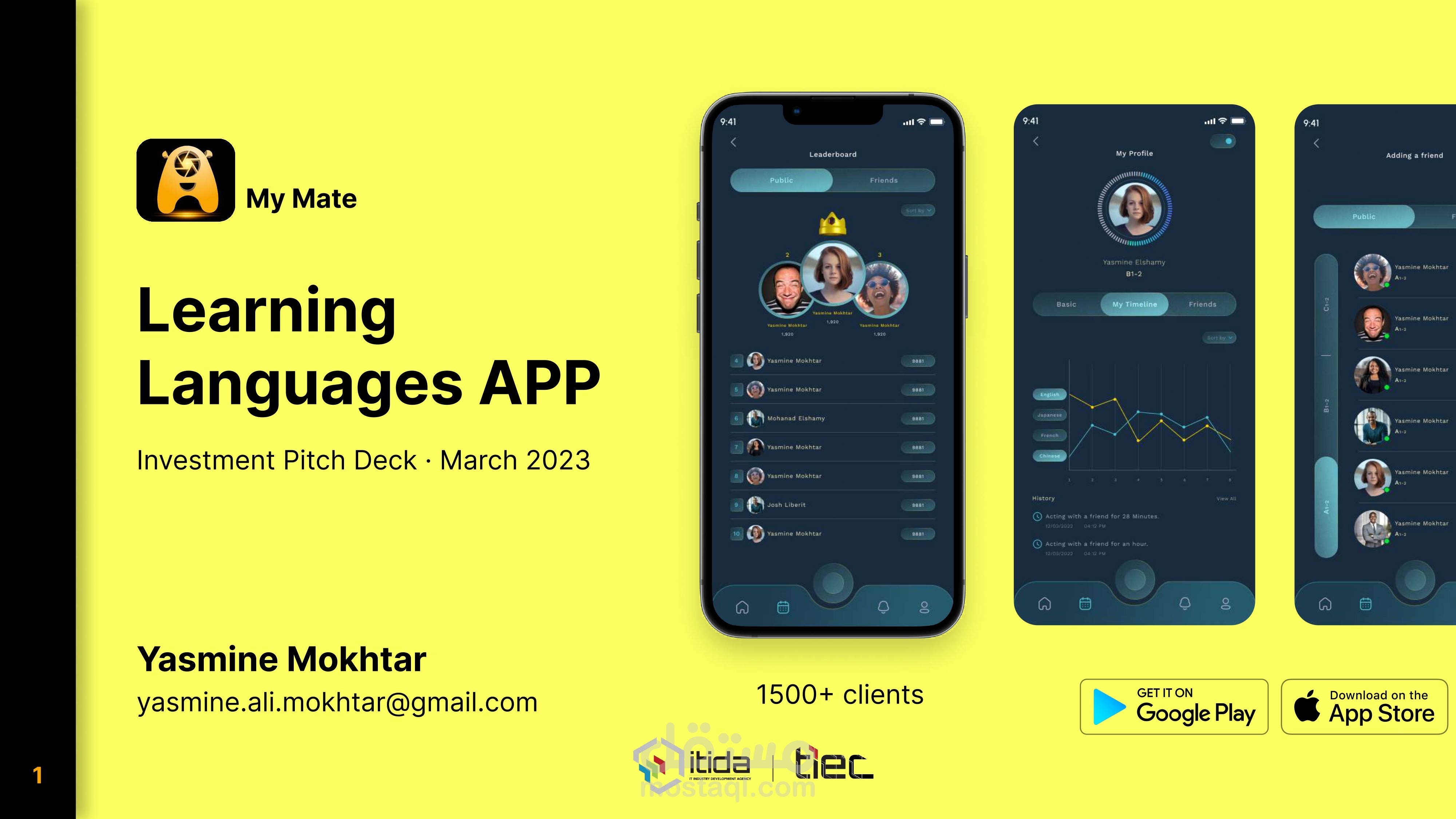 ساهمت في هذا المشروع من خلال قيادة عملية تطوير الأعمال وتصميم واجهات وتجربة المستخدم (UI/UX) للتطبيق. يركز تطبيق My Mate على اكتساب اللغة بدلاً من التعلم التقليدي، وذلك بالاعتماد على العقل الباطن والتجارب التفاعلية الغامرة.