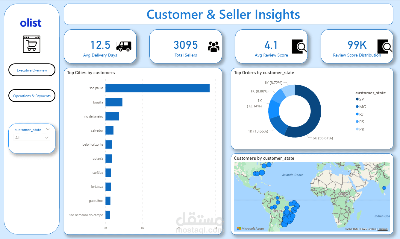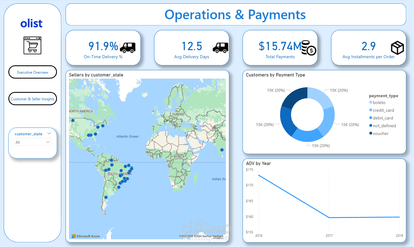 قمت بتنفيذ لوحة معلومات تفاعلية (E-commerce Dashboard) باستخدام Power BI على بيانات متجر Olist البرازيلي.