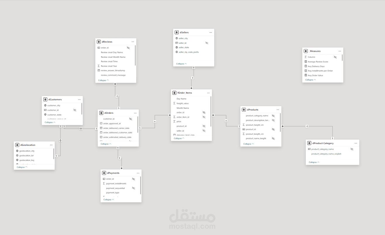تنظيف ومعالجة البيانات من جداول العملاء، الطلبات، المنتجات، البائعين والمدفوعات.