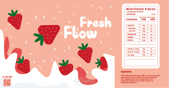Fresh Flow مشروب طبيعي من الفراولة اللذيذة و الحليب و الفانيليا الغنية تم استخدام ال Ilustrations في تصميم الغلاف لتوضيح المزيج بين الفراولة الطبيعية و الحليب الطازج