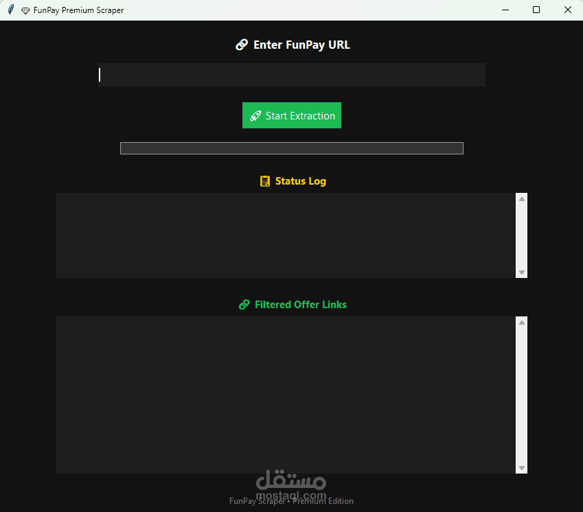تصميم واجهة مستخدم GUI تفاعلية باستخدام أدوات مثل Tkinter أو PyQt لتبسيط تجربة الاستخدام، مع زر "Start Extraction" واضح وحالة تنفيذ حية (Status Log).