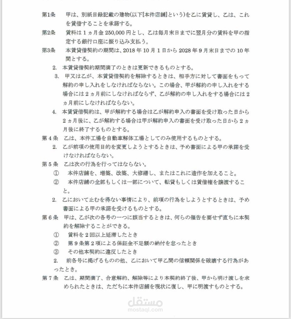 تم إنجاز ترجمة عقد إيجار محل من اللغة اليابانية إلى اللغة العربية بدقة عالية، مع مراعاة الصياغة القانونية الصحيحة والأسلوب الرسمي المستخدم في العقود.