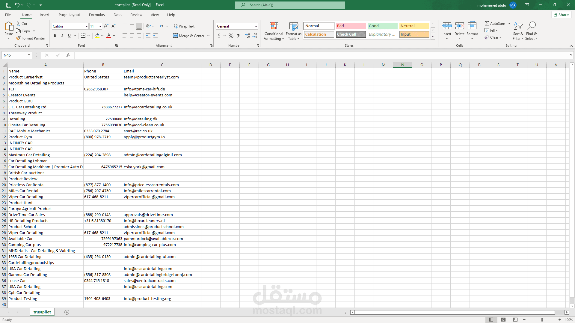استخراج وتجميع بيانات شركات وخدمات من موقع مراجعات العملاء، شمل جمع أسماء الشركات وأرقام الهواتف والبريد الإلكتروني في ملف Excel بشكل منظم.