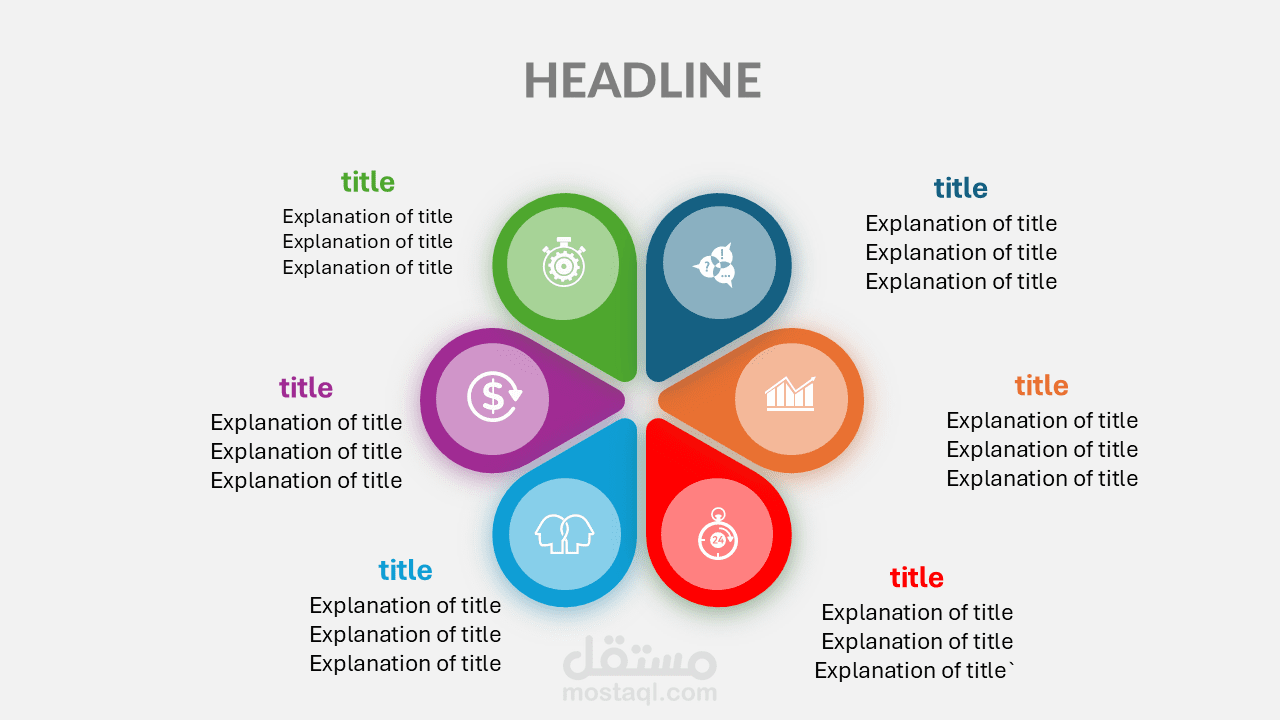 "Explanation of title" (شرح): نص من عدة أسطر باللون الأسود أو الرمادي الداكن لتقديم تفاصيل إضافية عن كل نقطة.