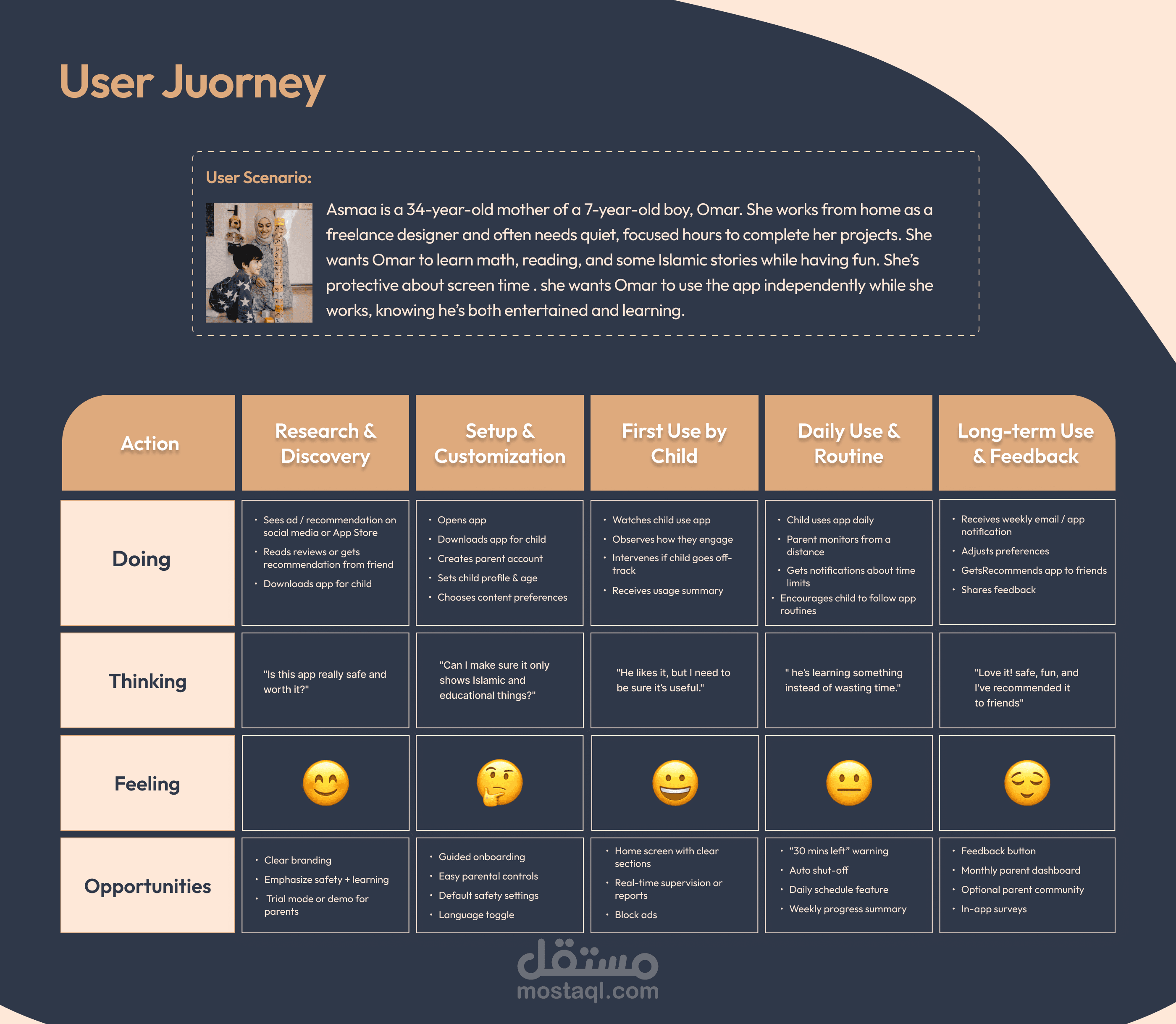 ️ رحلة المستخدم (User Journey): رسمنا السيناريو من لحظة دخول الطفل وحتى خروجه من النشاط.