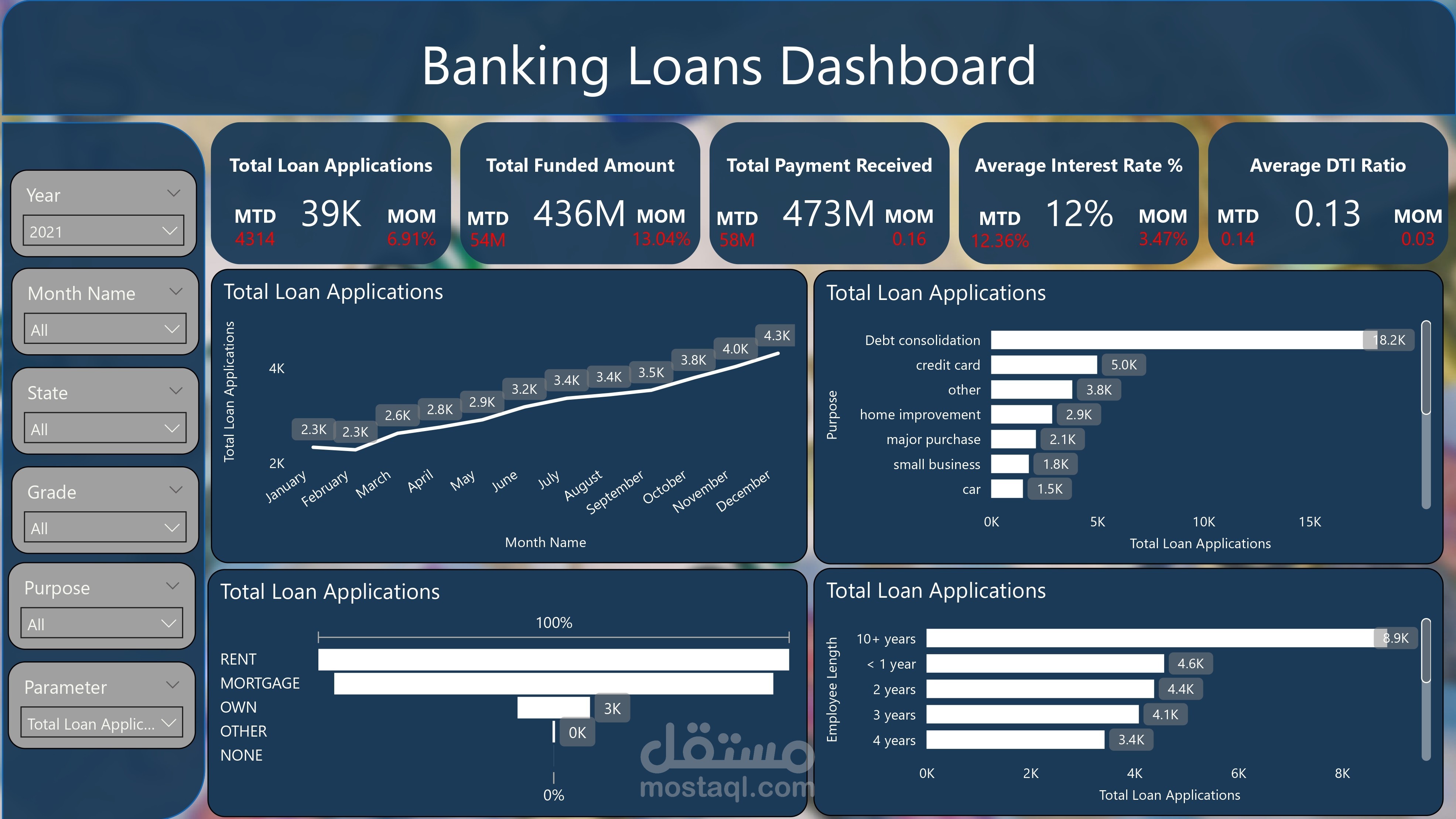 هذا المشروع عبارة عن داشبورد تفاعلي تم تصميمه باستخدام Power BI لعرض وتحليل بيانات القروض البنكية بطريقة احترافية ومنظمة.