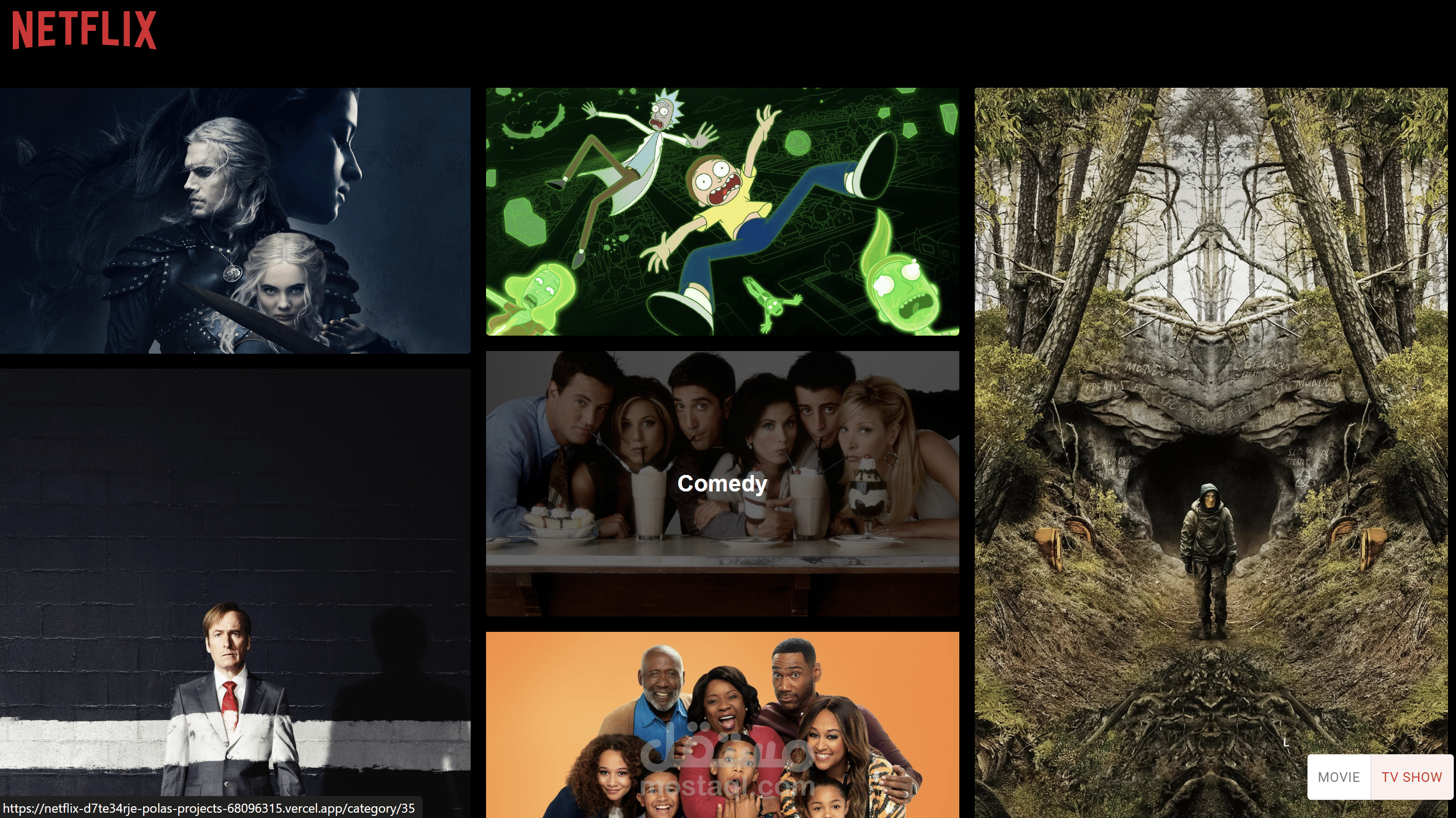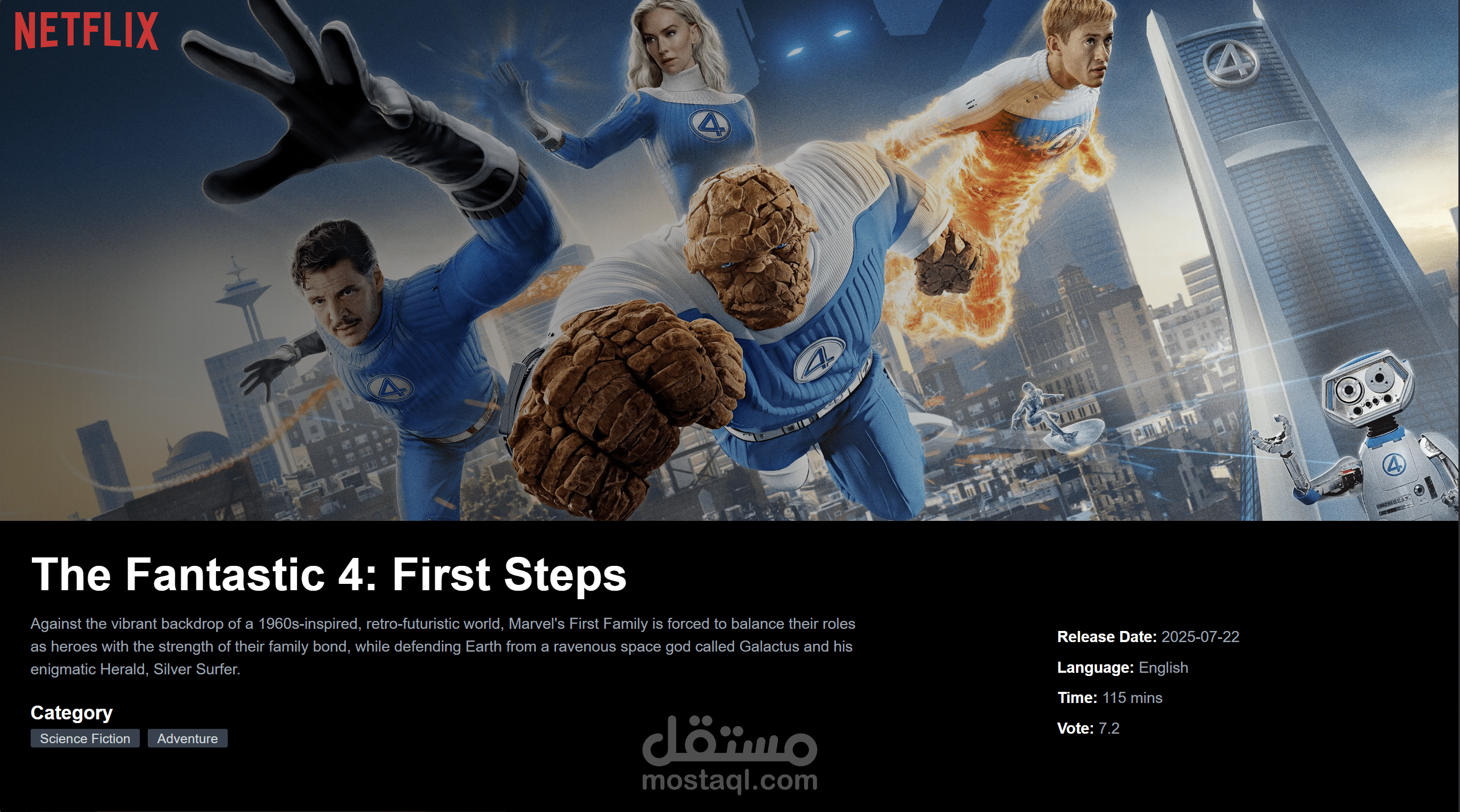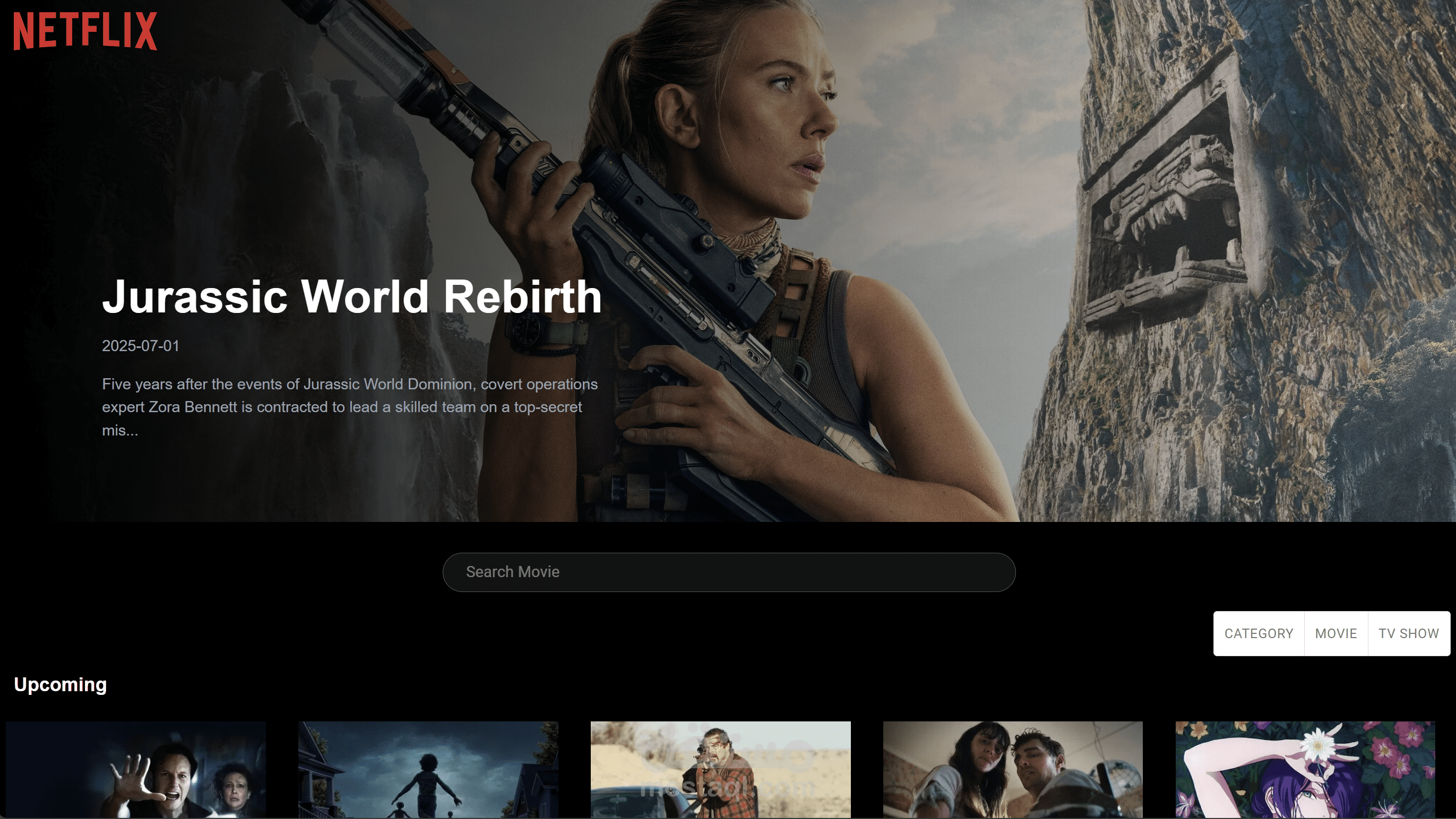 The application offers a full streaming-style browsing experience where users can explore movies and TV shows arranged in multiple categories, similar to the Netflix interface. Every title includes a dedicated details page displaying its description, release date, rating, and full cast list. Users can instantly watch trailers without leaving the page, providing an immersive preview experience.