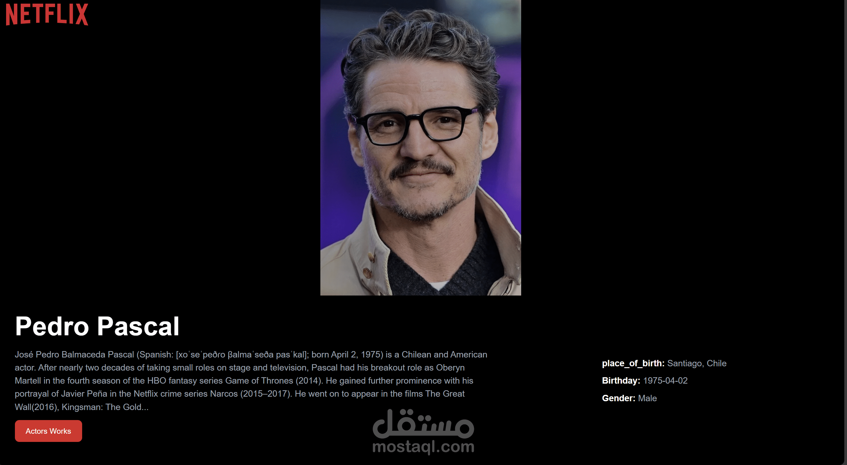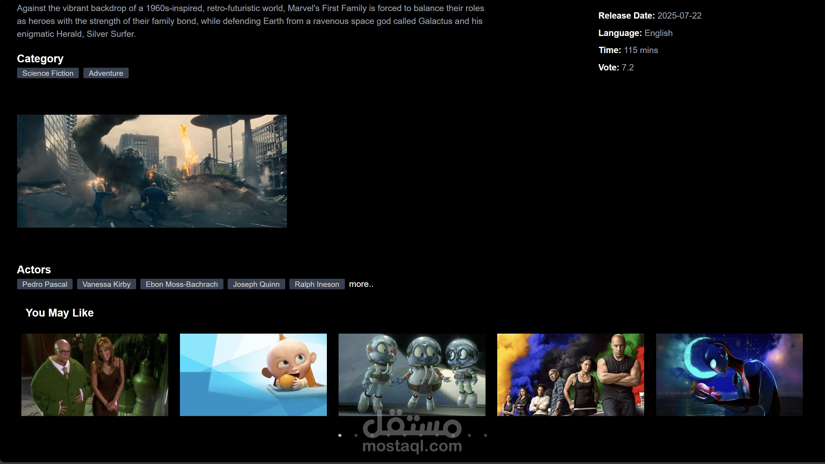 A built-in search feature allows users to find any movie or actor by name. When selecting an actor, the app displays all their film and series appearances in one place, giving users a full overview of their career. Navigation between titles, actors, and trailers is fully dynamic with smooth transitions and no page reloads. The entire interface is responsive and optimized for both desktop and mobile devices to deliver a clean and engaging user experience.