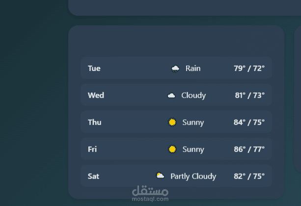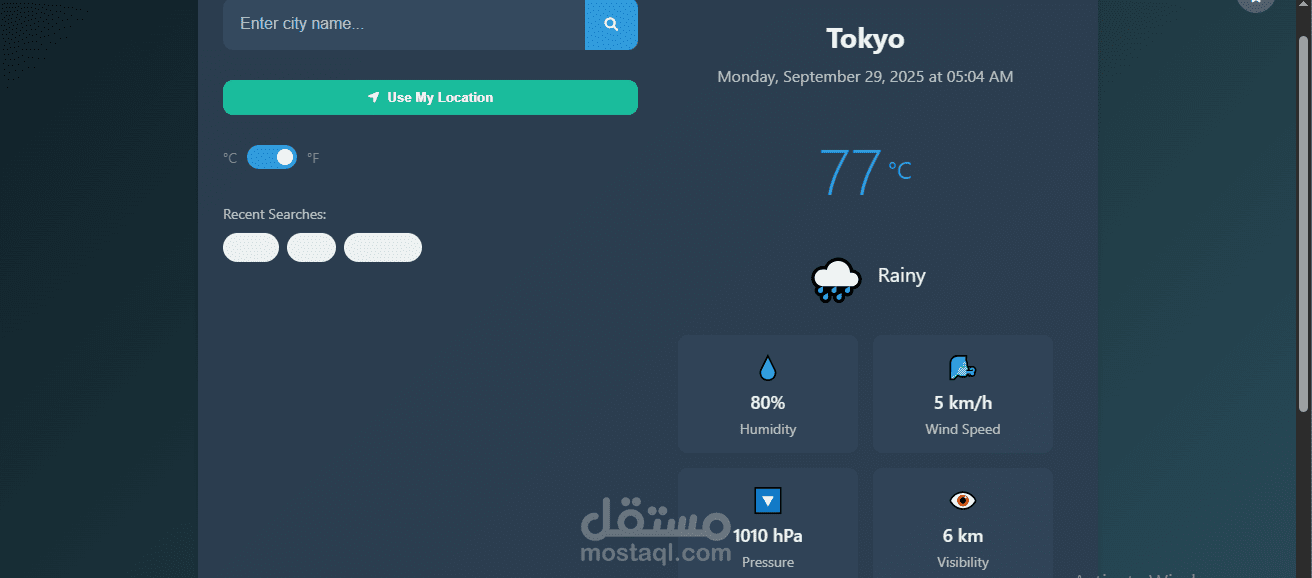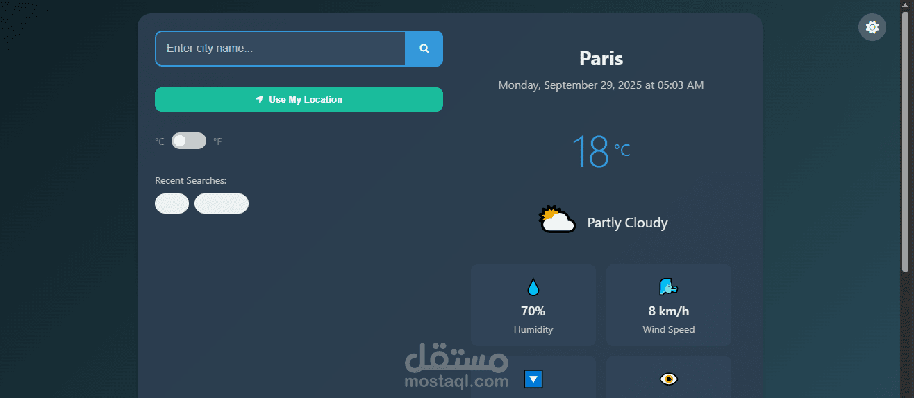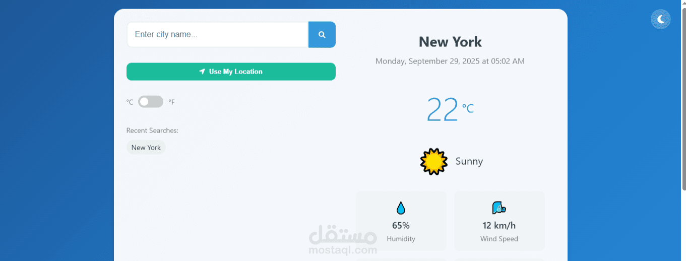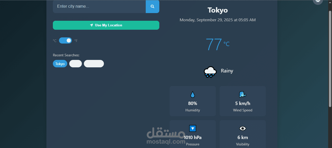 تطبيق ويب تفاعلي يقدم تجربة مستخدم سلسة لعرض حالة الطقس بدقة وجمال. يمكنك البحث عن أي مدينة أو استخدام موقعك الحالي لمعرفة الطقس الفعلي، مع توقعات لمدة 5 أيام. التطبيق يدعم الوضع الليلي والنهاري، تبديل الوحدات °C/°F، ويعرض تفاصيل الطقس مثل الرطوبة، سرعة الرياح، الضغط والرؤية بشكل جذاب وسهل القراءة. كما يعرض خريطة تفاعلية وهمية لإحداثيات المدينة.