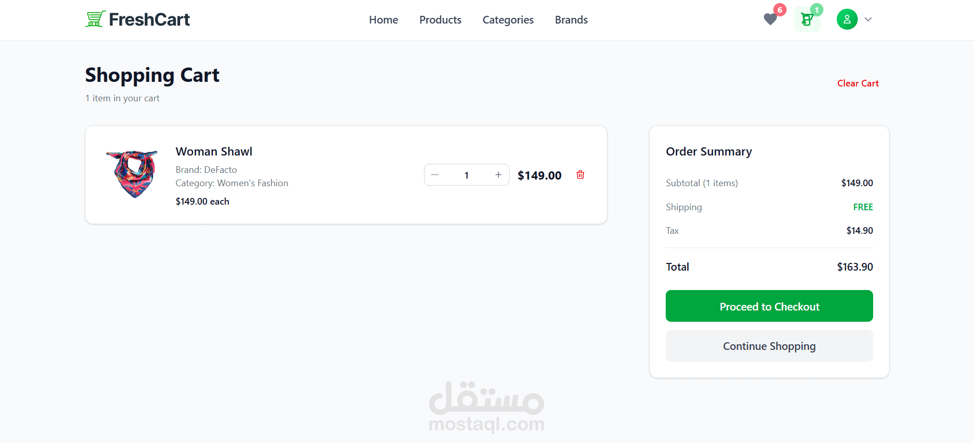 عربة تسوق (Shopping Cart) مع إمكانية إضافة حذف المنتجات وتحديث الكميات.