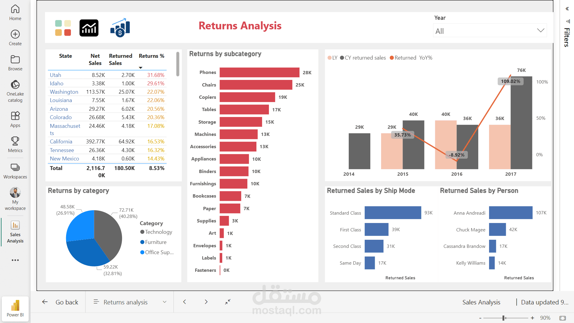 •نسبة المرتجعات Returns عالية وصلت لـ 180K حوالي 8.5% من إجمالي المبيعات، وده بيأثر سلبًا على الربحية.