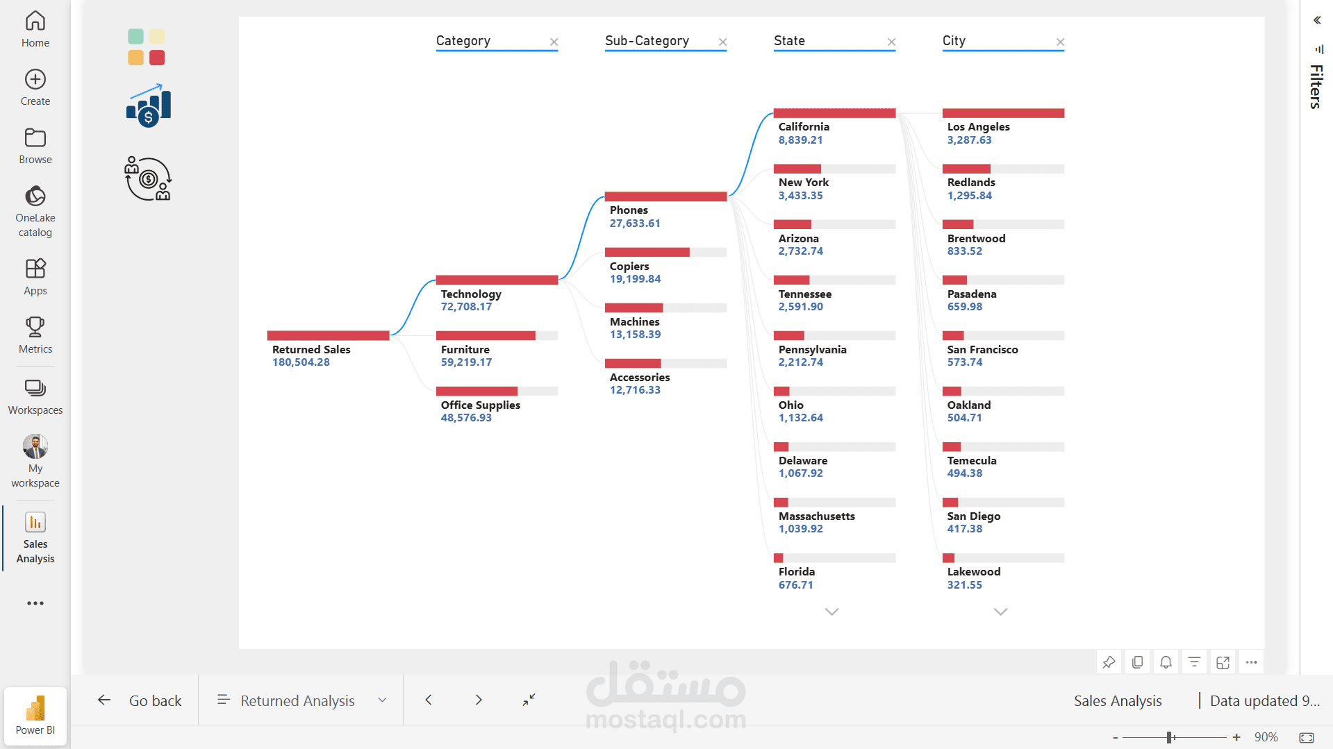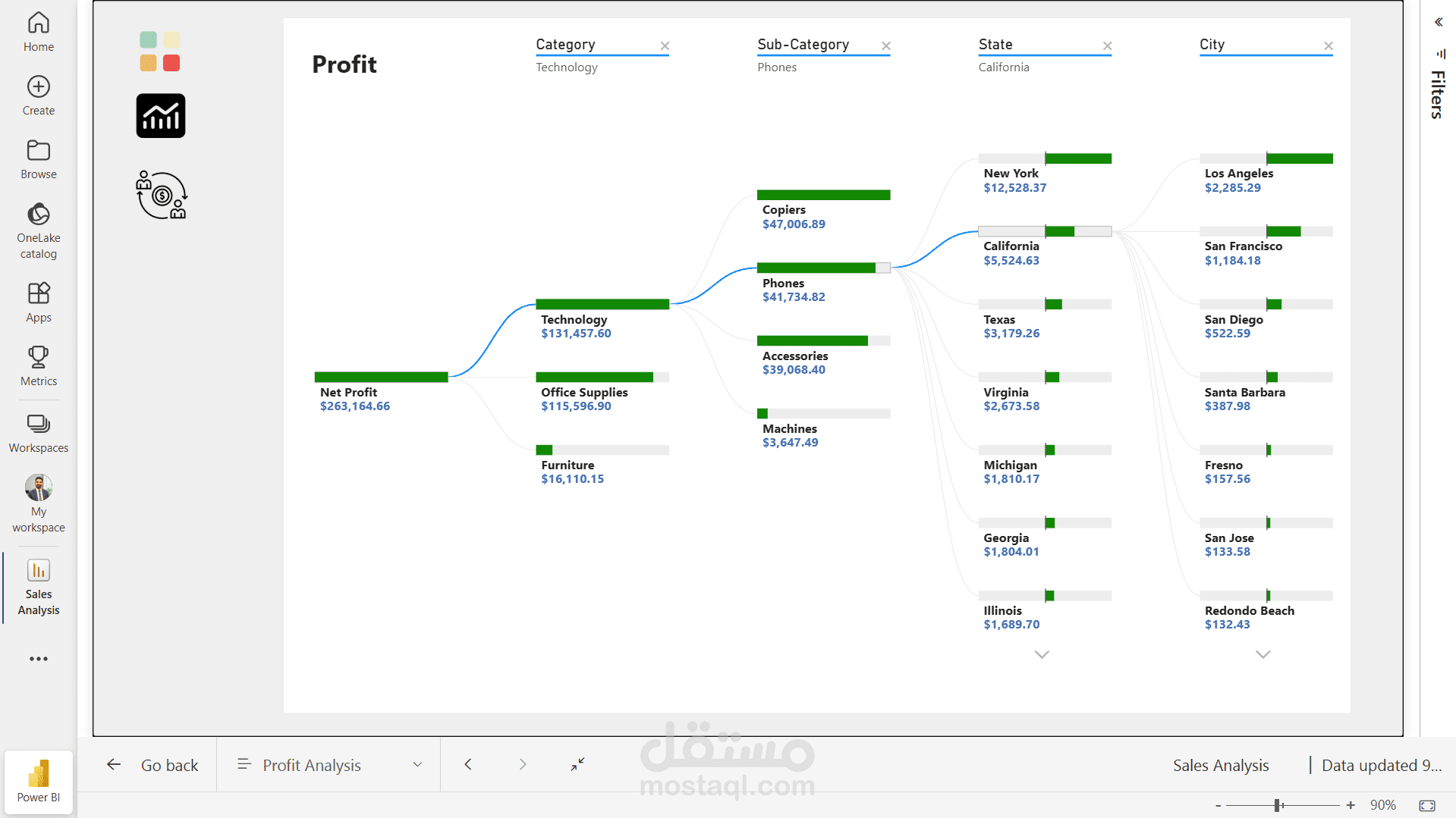 • Decomposition Tree: لتفكيك الأرباح حسب Category → Sub-Category → State → City → يكشف أين تتركز المشاكل بدقة.