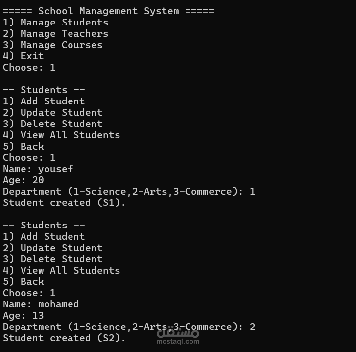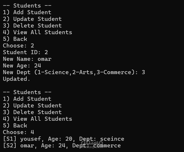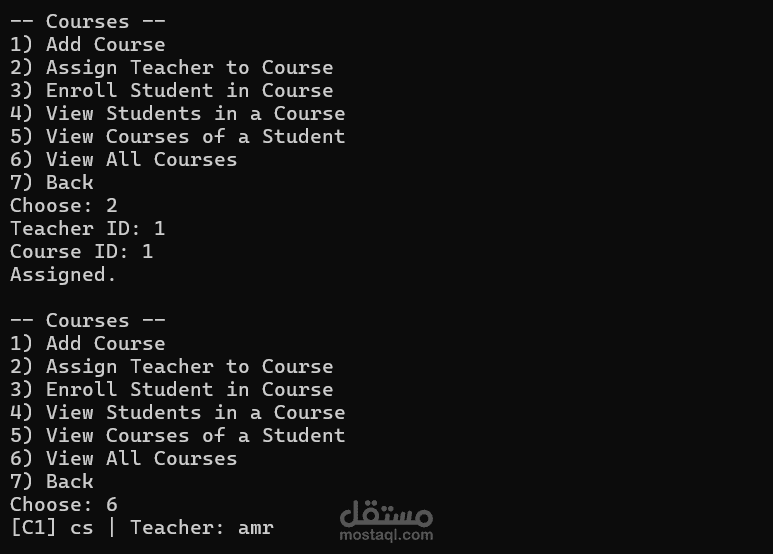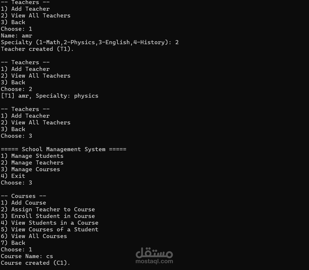 A C# console-based School Management System that manages students, teachers, and courses. It supports adding, updating, listing, and deleting records, enrolling students in courses, and assigning teachers to courses. The system also allows viewing students per course and courses per student while ensuring data consistency