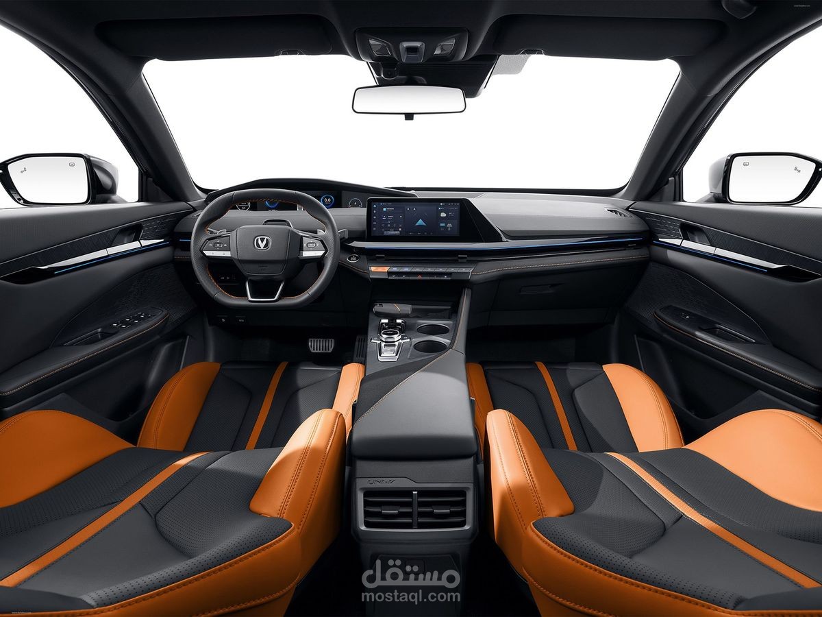 من ناحية الأبعاد، يبلغ طول شانجان UNI-V حوالي 4680 مم، وعرضها 1838 مم، وارتفاعها 1430 مم، مع قاعدة عجلات تصل إلى 2750 مم، مما يمنح السيارة رحابة داخلية جيدة مقارنة بفئتها. تصميم المقصورة الداخلية يجمع بين الطابع العصري والتقنيات المتقدمة، حيث تأتي بمقاعد رياضية مكسوة بالجلد الفاخر، مع دعم جانبي يوفر راحة وثبات أكبر أثناء القيادة. كما أن لوحة القيادة تحتوي على شاشتين رقمية: الأولى للعدادات بحجم 10.25 بوصة تقريبًا، والثانية لشاشة المعلومات والترفيه بقياس 12.3 بوصة تدعم نظامي Apple CarPlay وAndroid Auto. إضافة إلى ذلك، هناك شاحن لاسلكي، نظام صوتي عالي الجودة، وإضاءة محيطية داخلية تضفي أجواء مميزة.