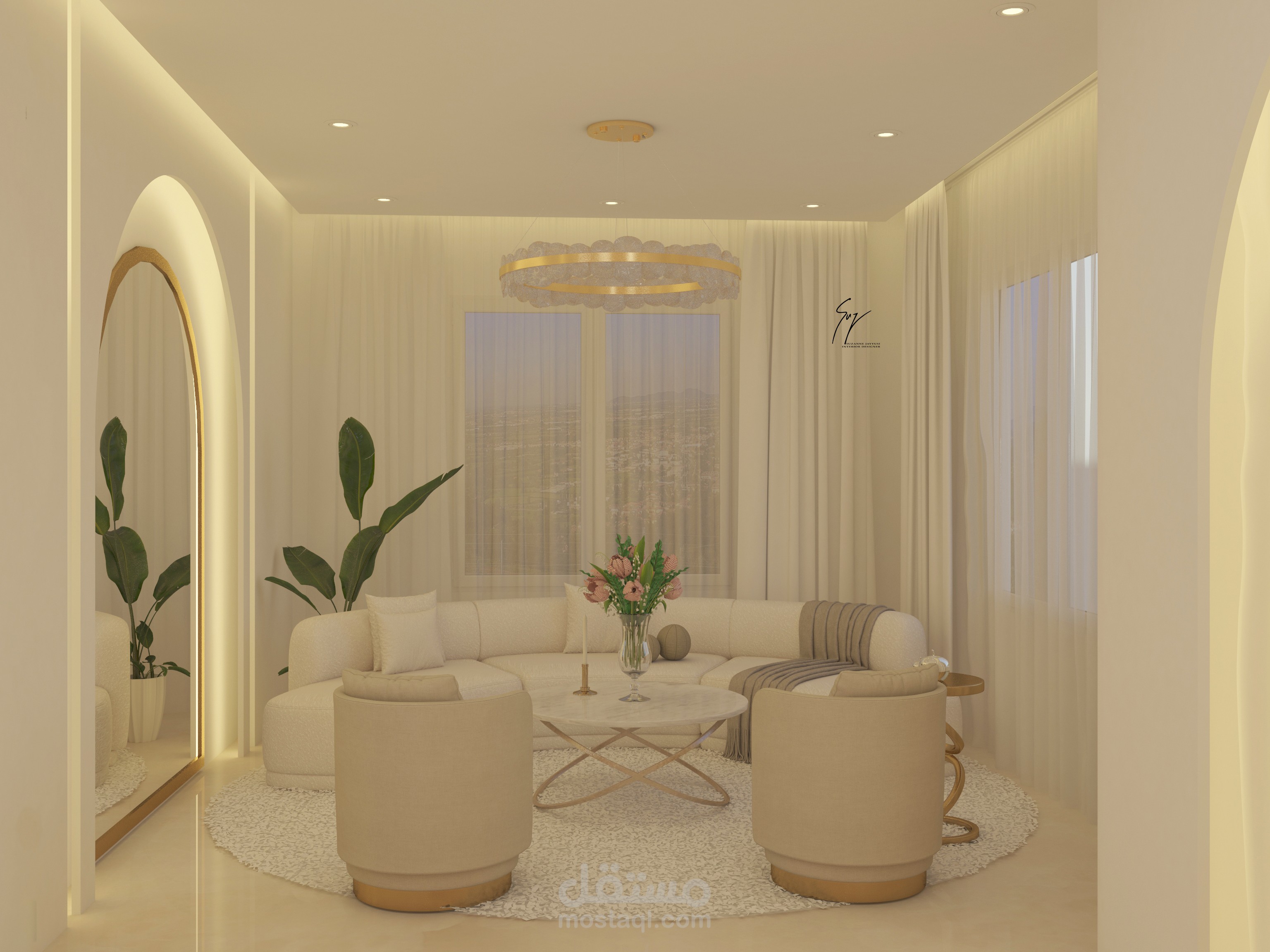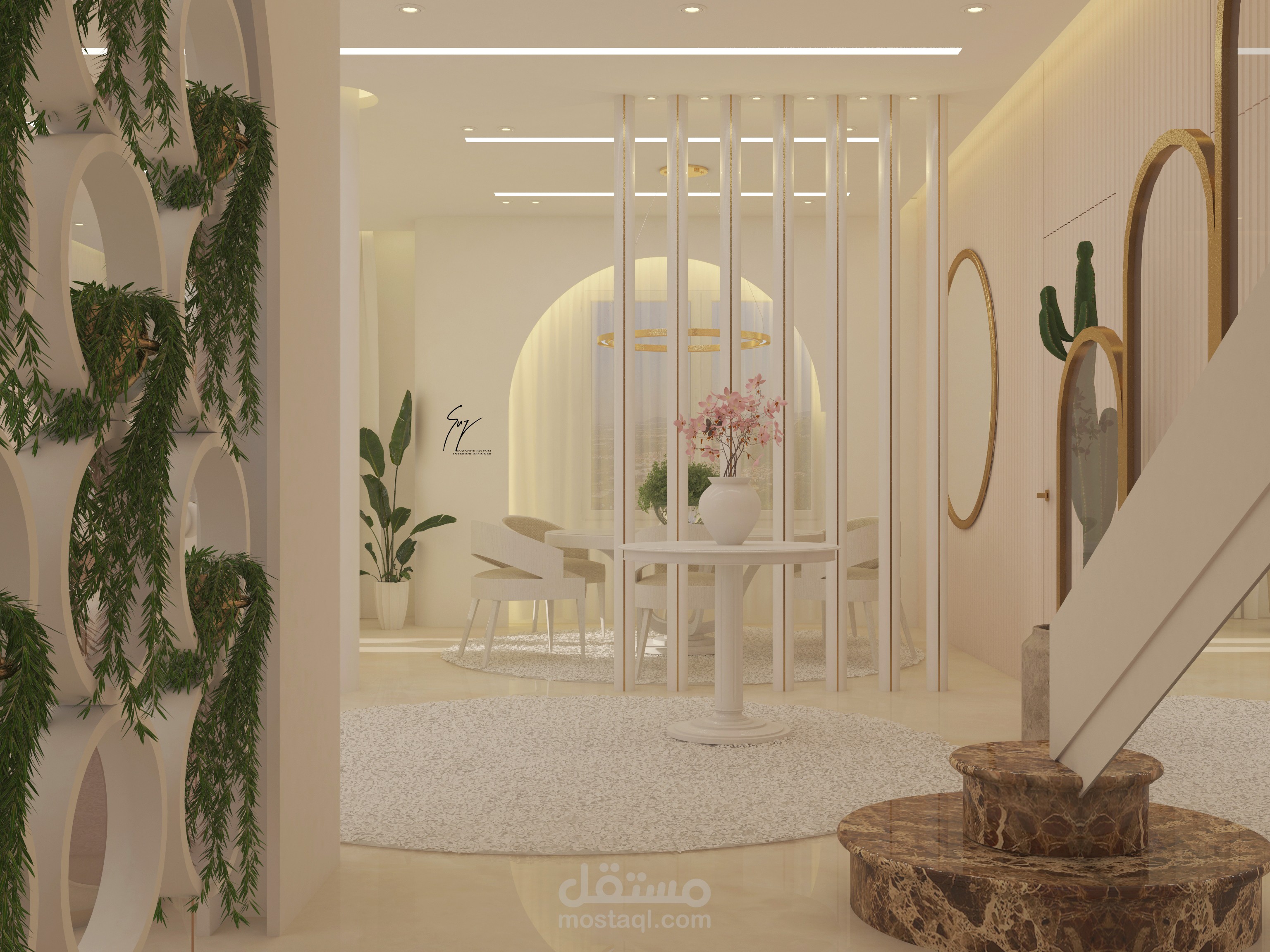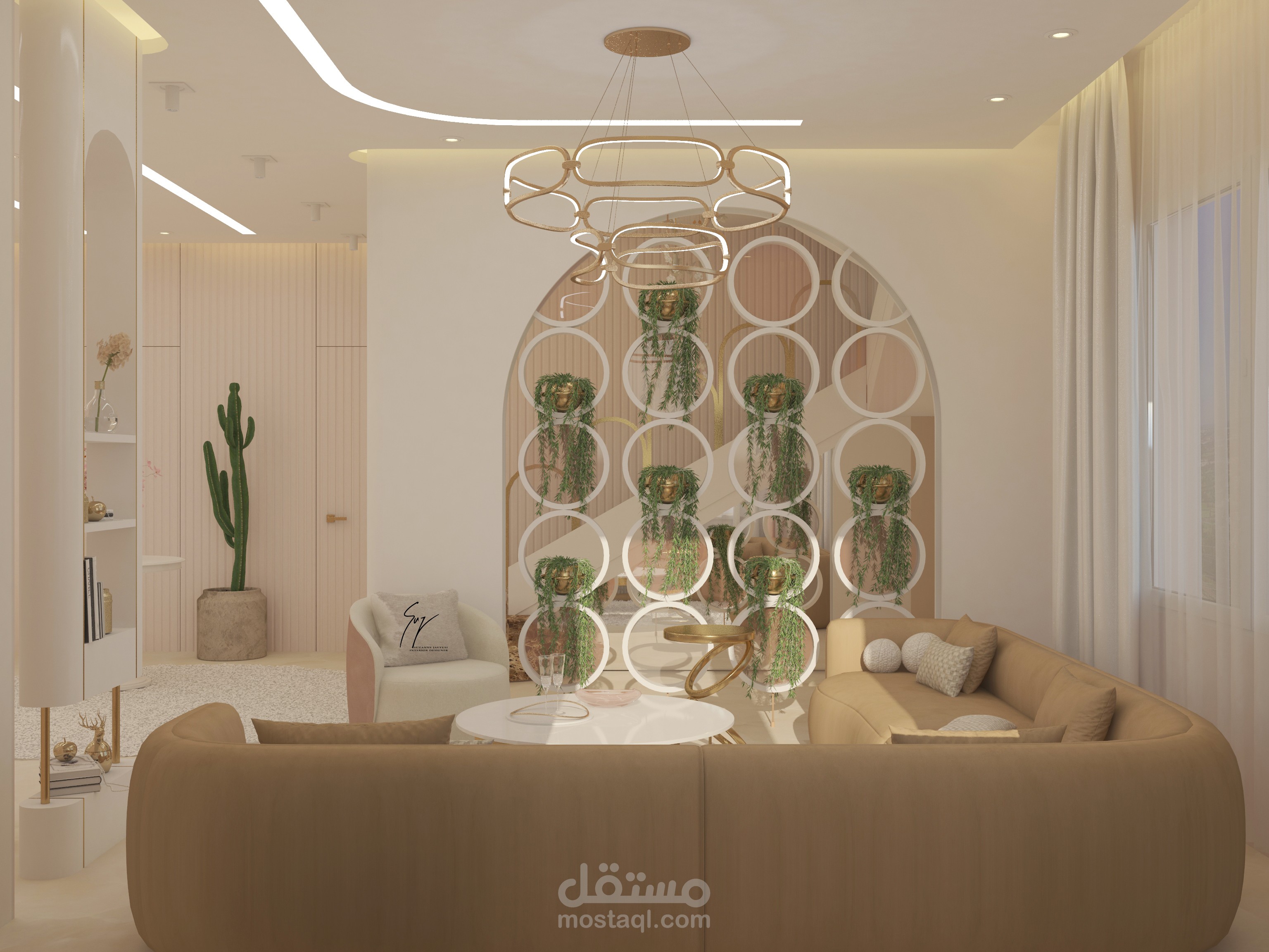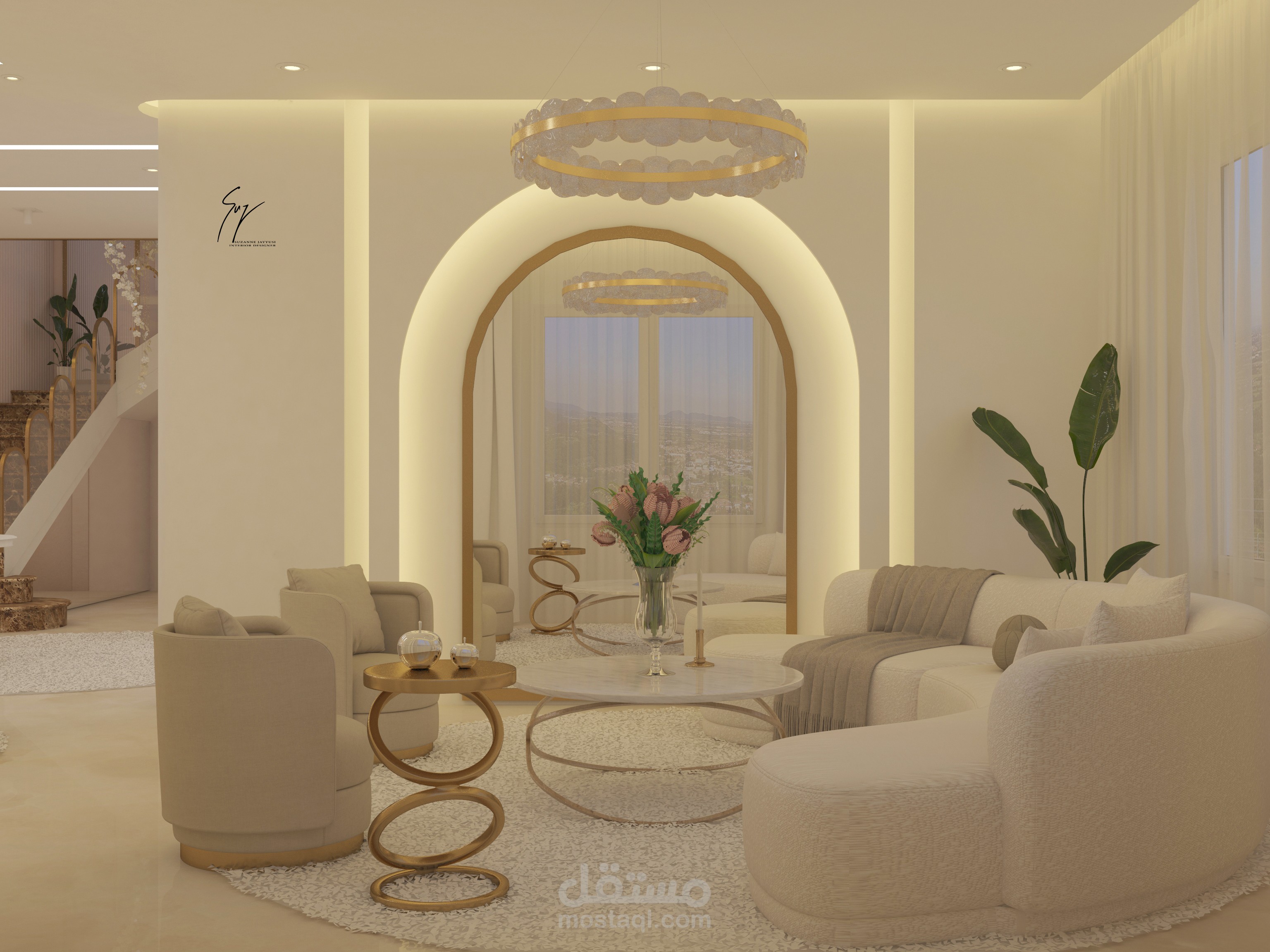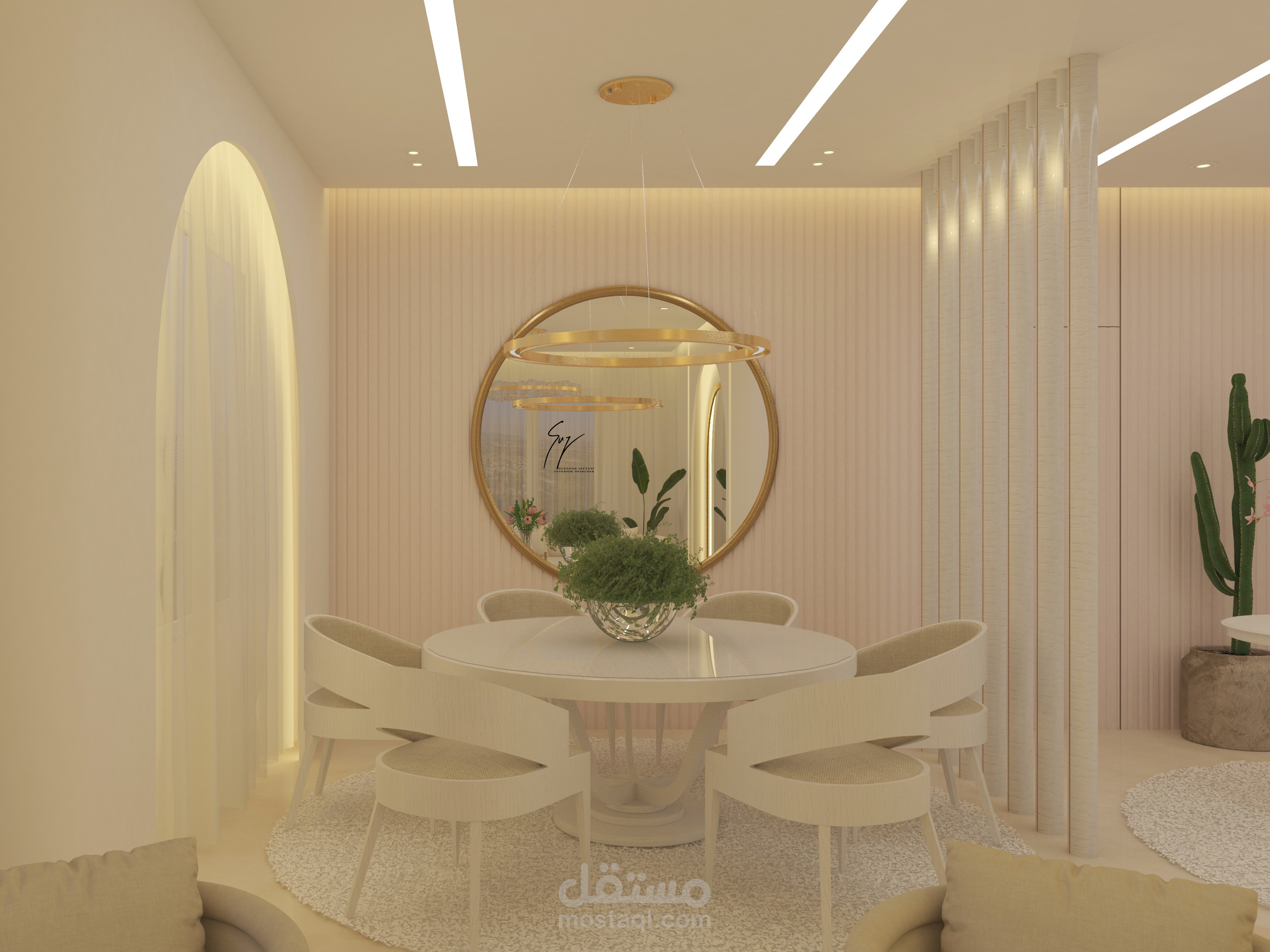 صالونات وسفرة في فيلا بنمط موردن وألوان مريحة جدا وهادئة. استخدام الدائرة يعطي احساس بالانسجام والامان والتواصل ووداعة المكان وترحاب ساكنيه. يمكنك القول أن هذا العمل طبيعي حسي فاخر لكن بنكهة (كيوت) بشكل او باخر.
