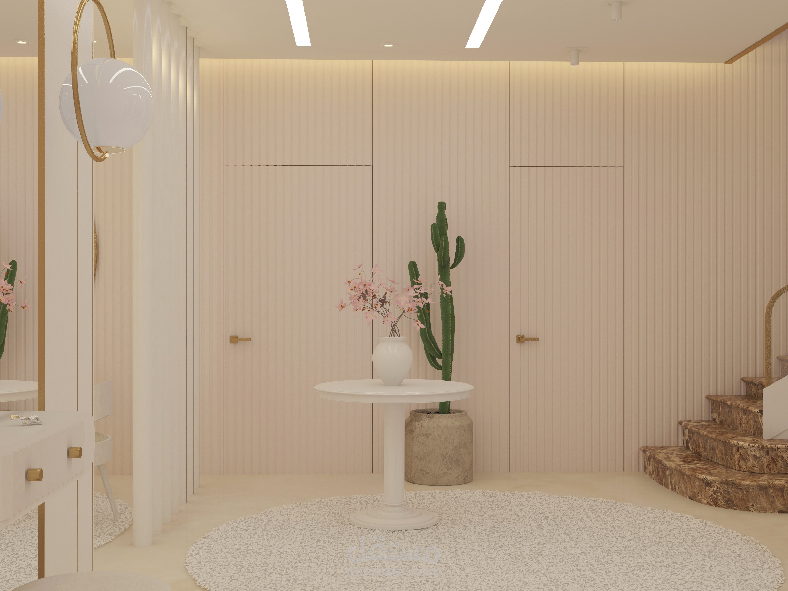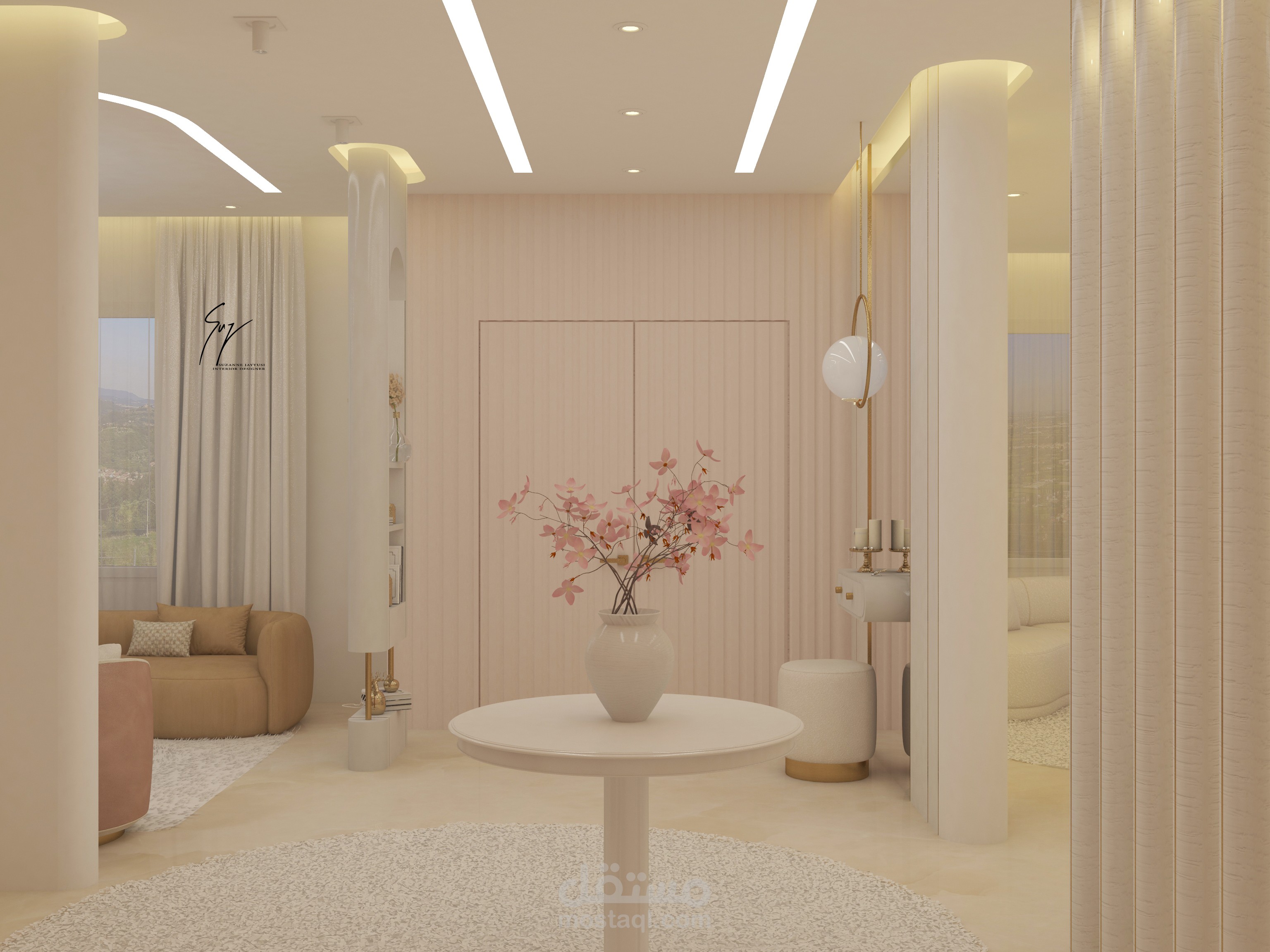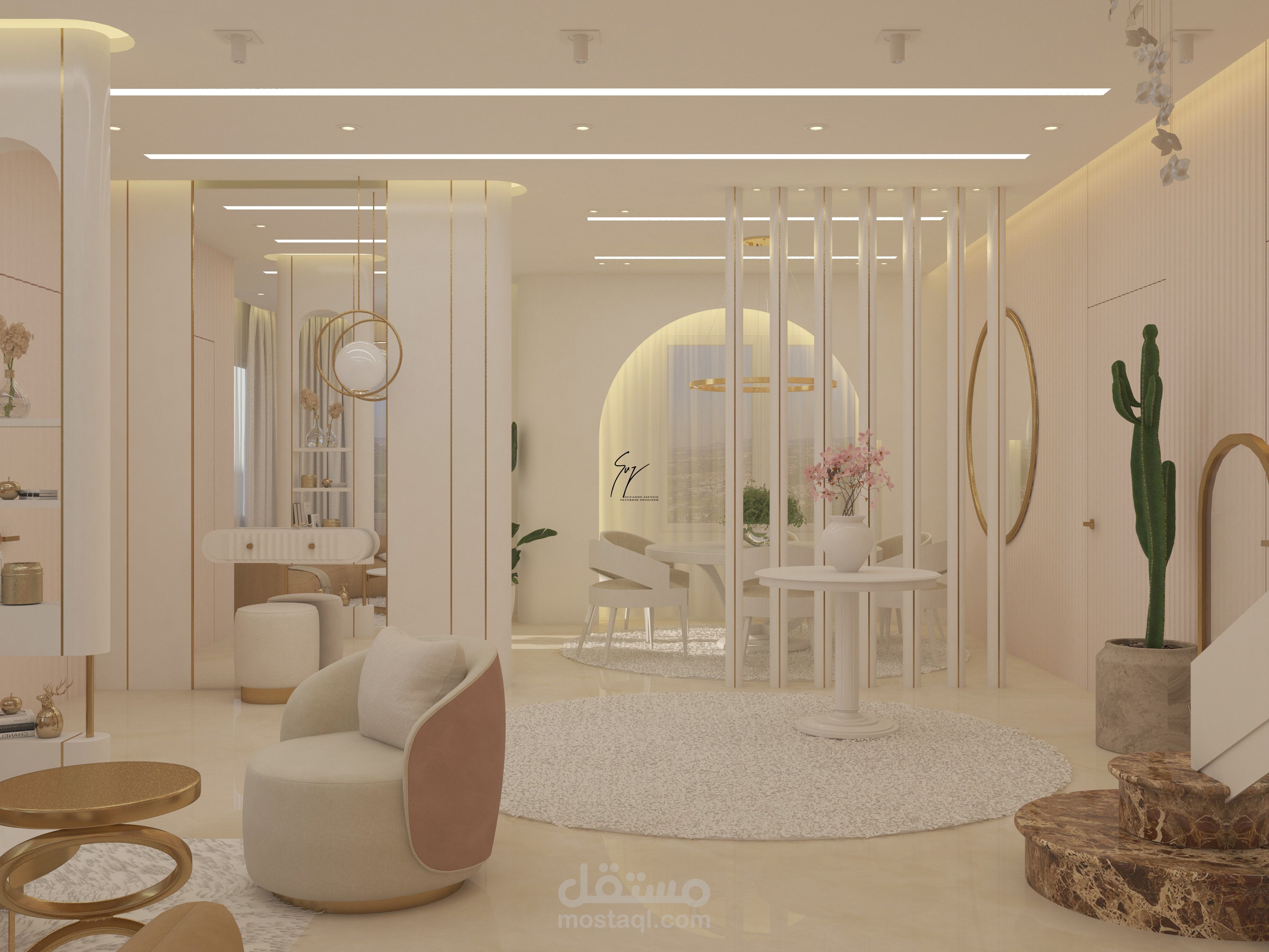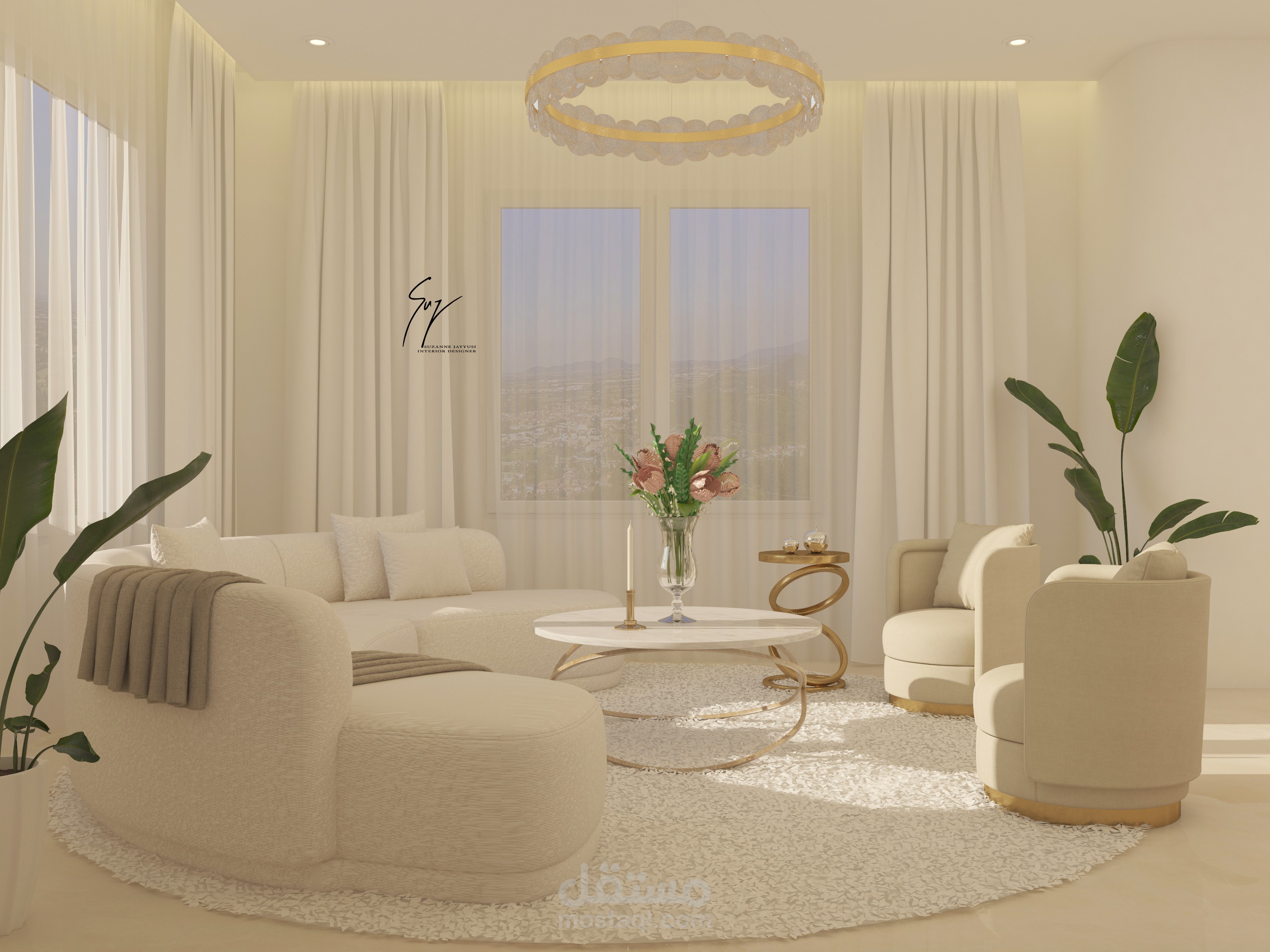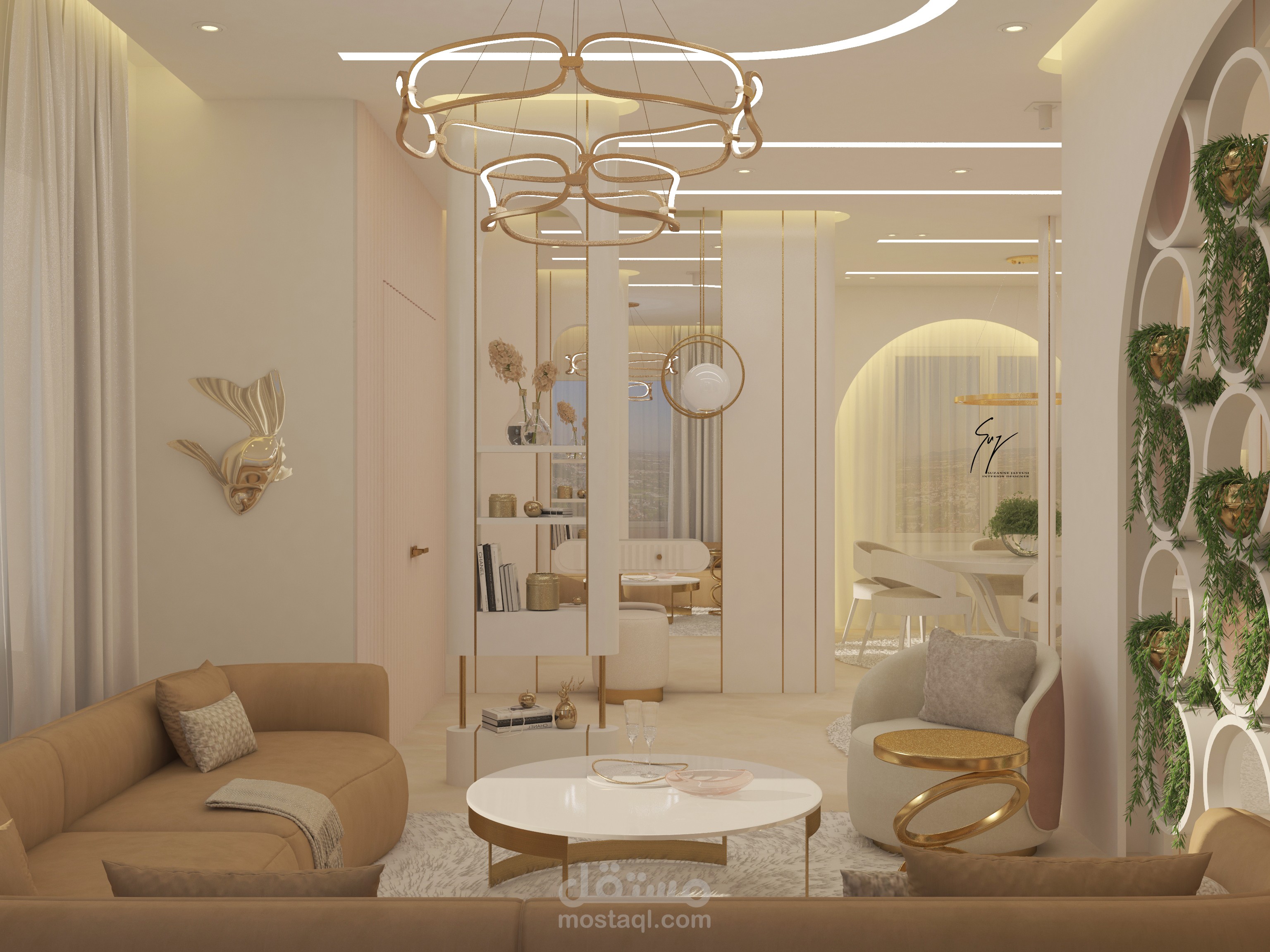 صالونات وسفرة في فيلا بنمط موردن وألوان مريحة جدا وهادئة. استخدام الدائرة يعطي احساس بالانسجام والامان والتواصل ووداعة المكان وترحاب ساكنيه. يمكنك القول أن هذا العمل طبيعي حسي فاخر لكن بنكهة (كيوت) بشكل او باخر.