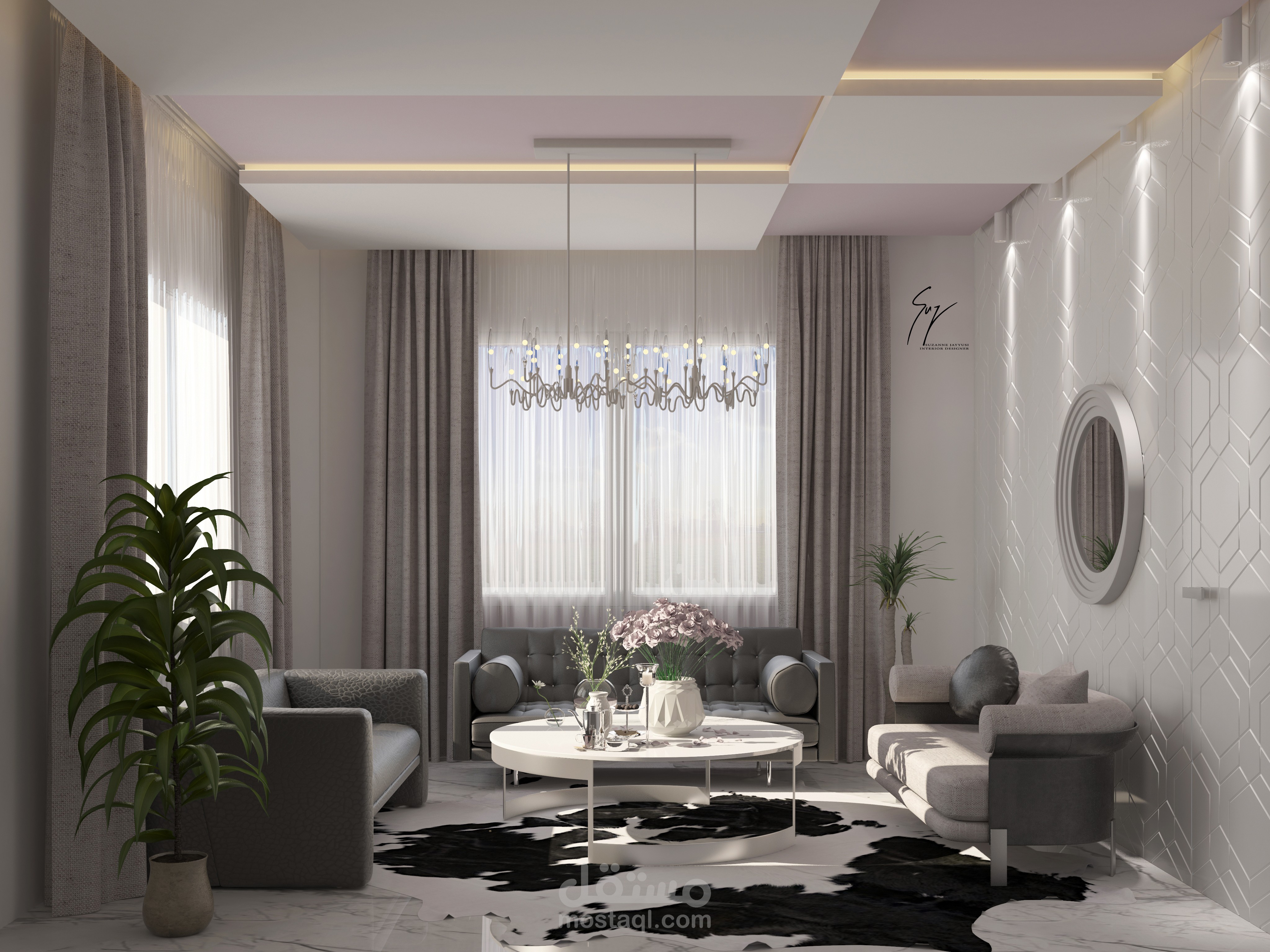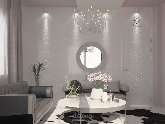 صالون استقبال ضيوف مودرن تظهر فيه الرزانة والجدية لكن مع ألوان ناعمة.