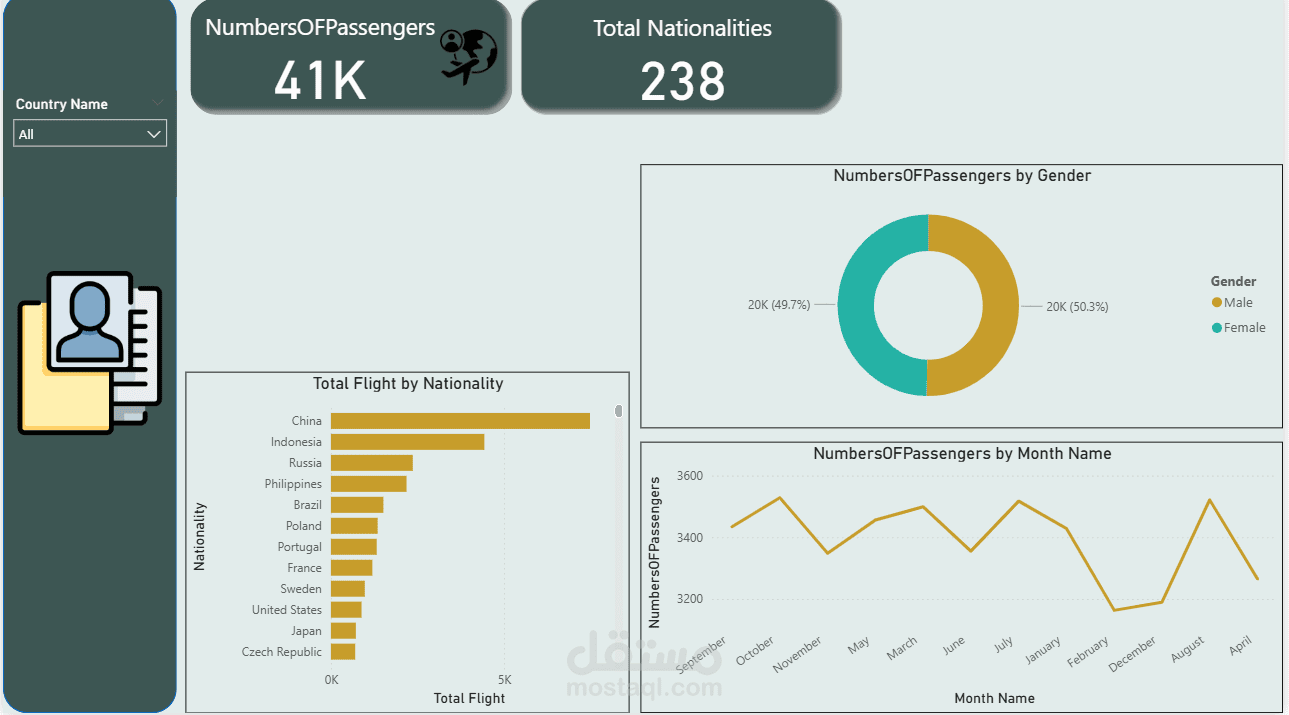 تحليل الركاب: عرض بيانات الركاب حسب الجنسية والجنس (ذكر/أنثى) مع متابعة الاتجاهات الشهرية.