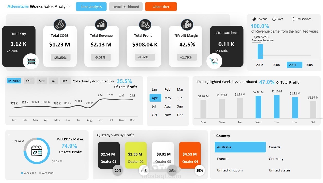 KPIs رئيسية: Total Quantity, Total COGS, Total Revenue, Total Profit, Profit Margin, Total Transactions