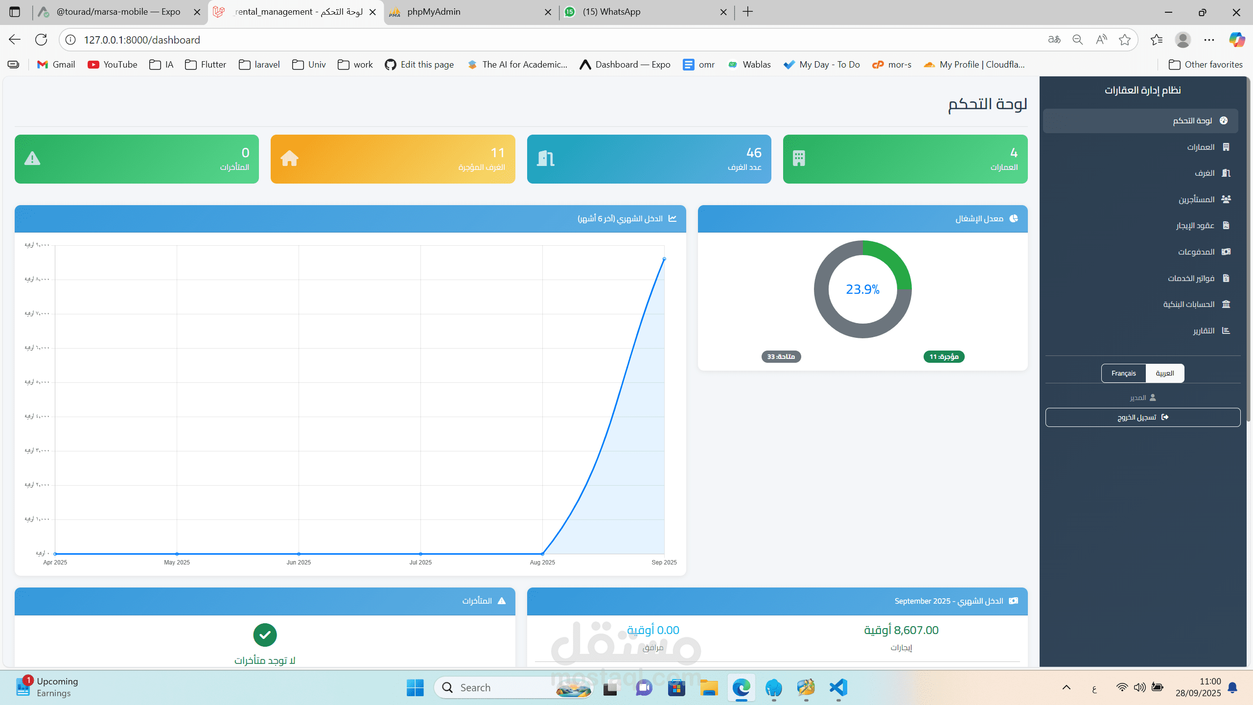لوحة تحكم (Dashboard): تعرض إحصائيات (عدد العمارات، الغرف المكراة، الغرف الفارغة، المداخيل الشهرية).