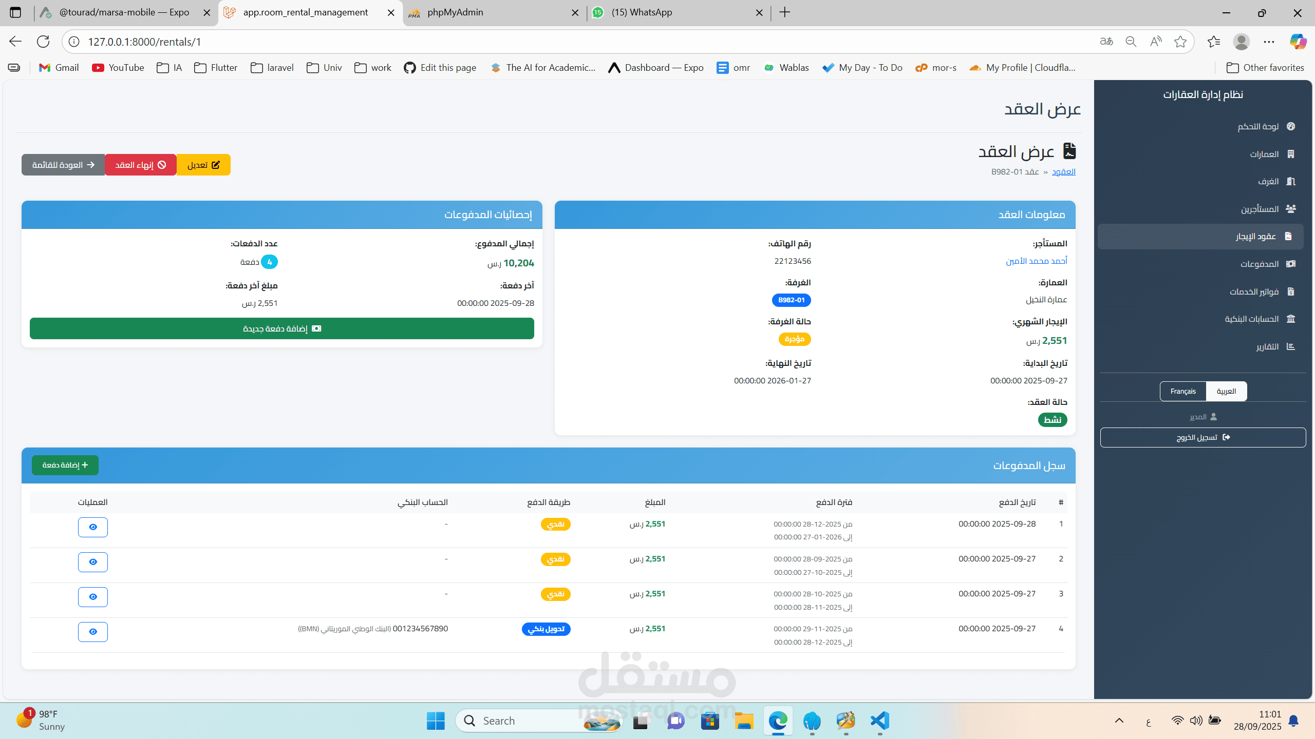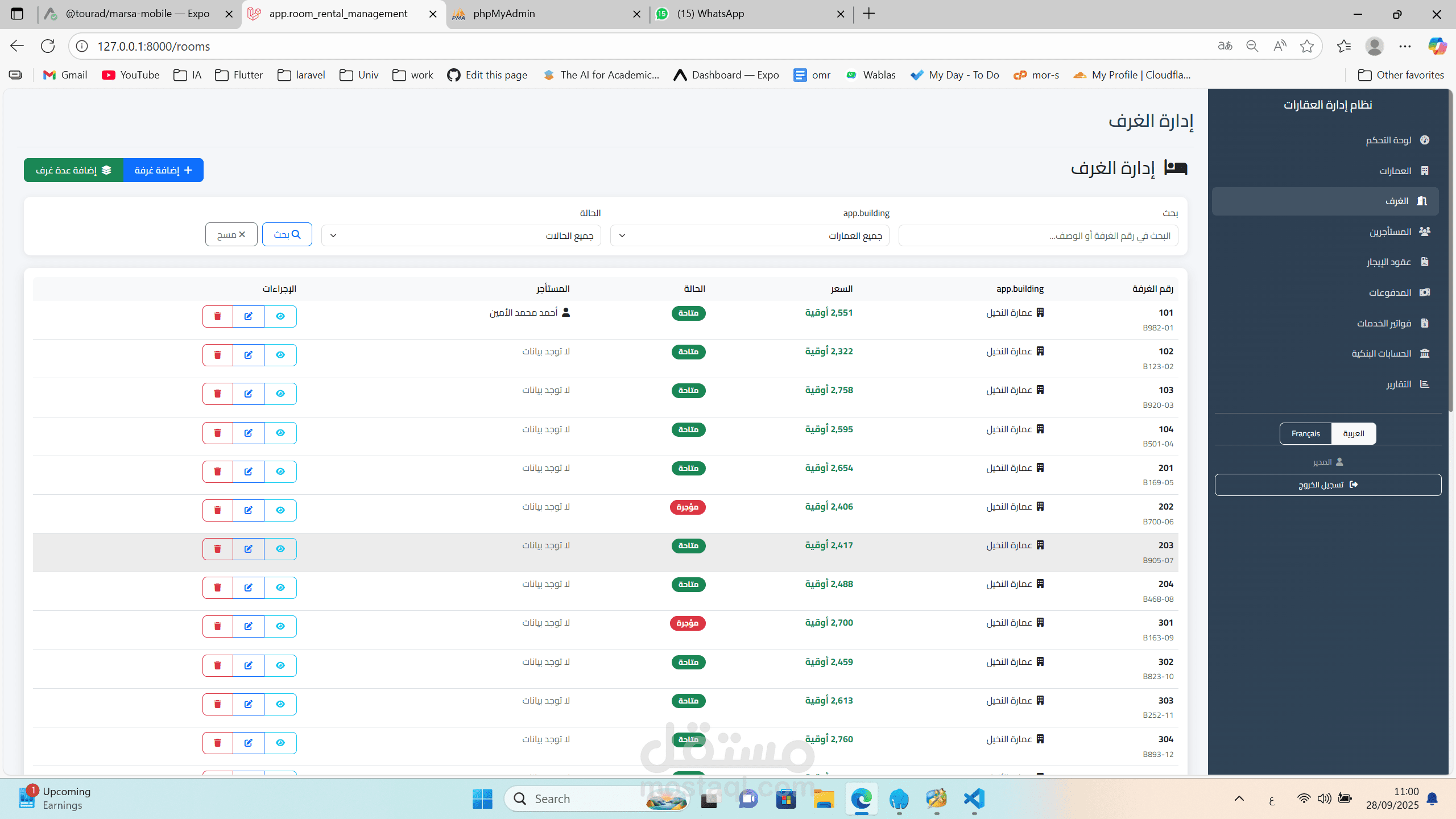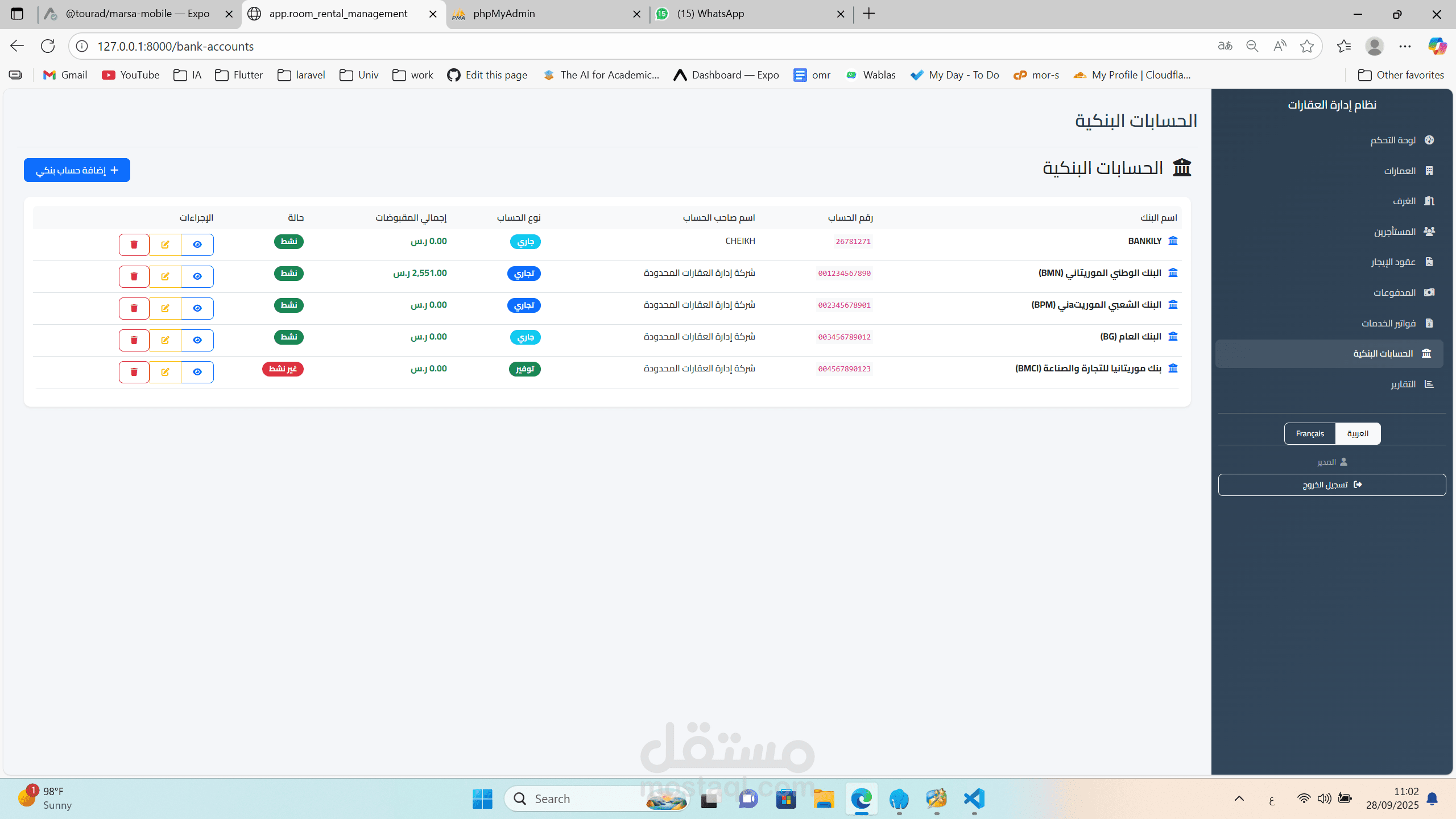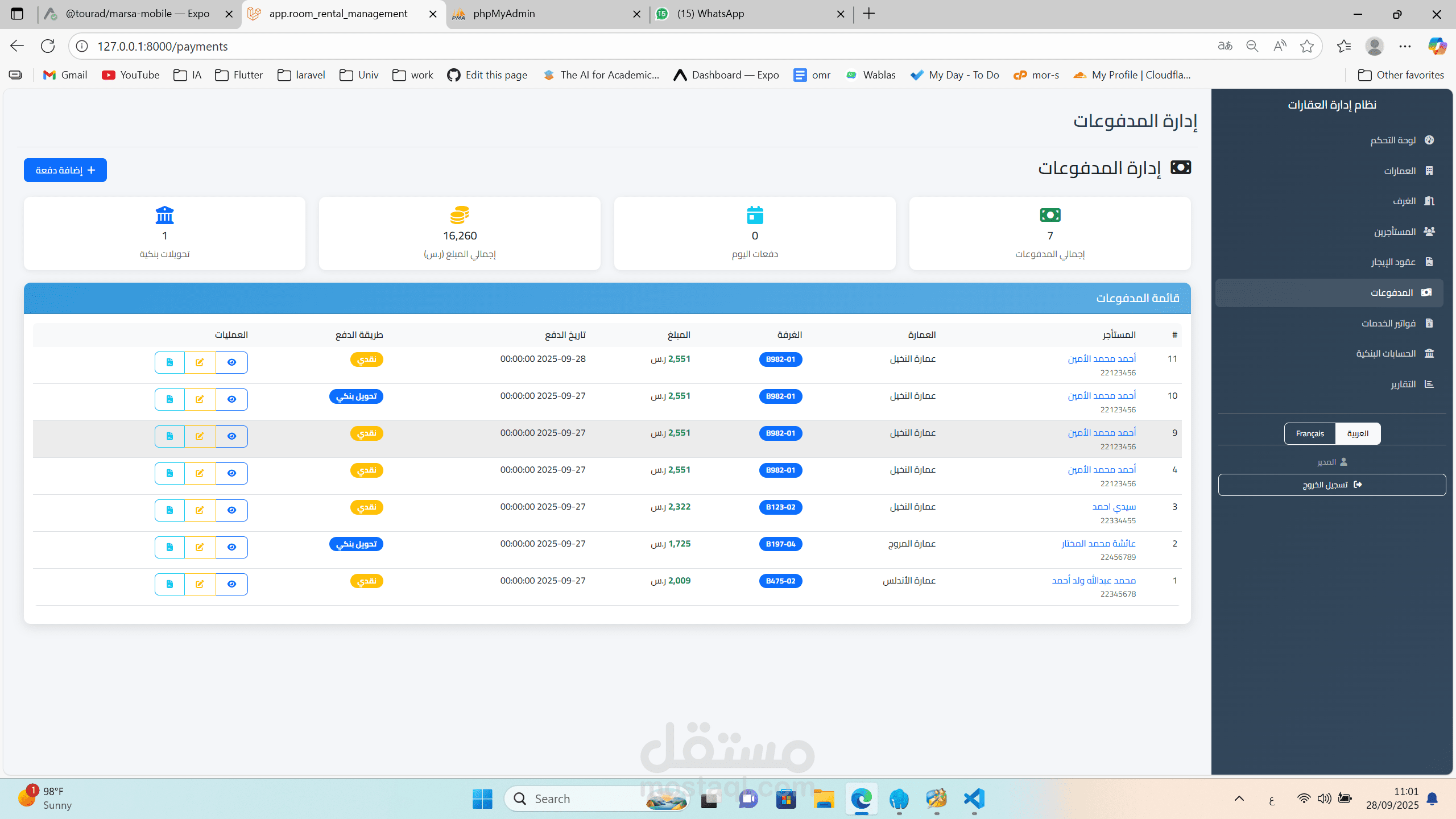 تطوير نظام ويب لإدارة كراء الغرف في العمارات، مع متابعة دفعات الإيجار الشهرية، وفواتير الماء والكهرباء كل شهرين، بالإضافة لتوليد تقارير احترافية (PDF) عن حالة الكراء والمديونيات.