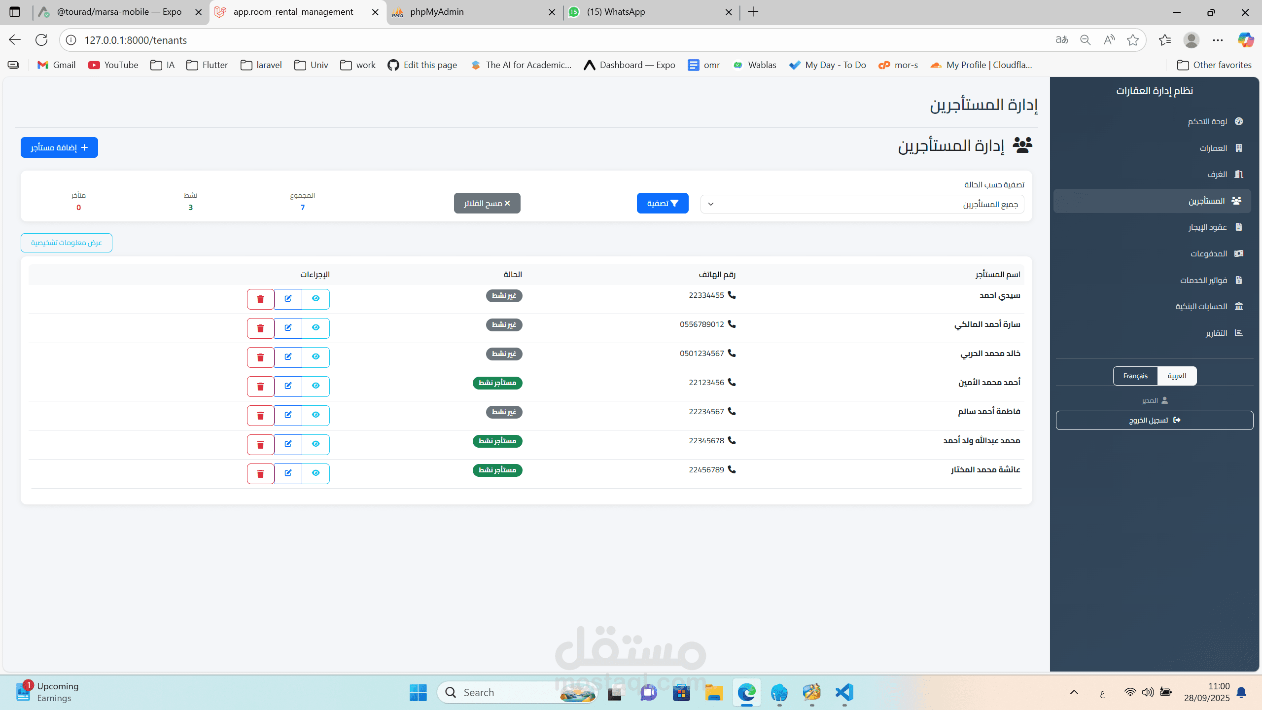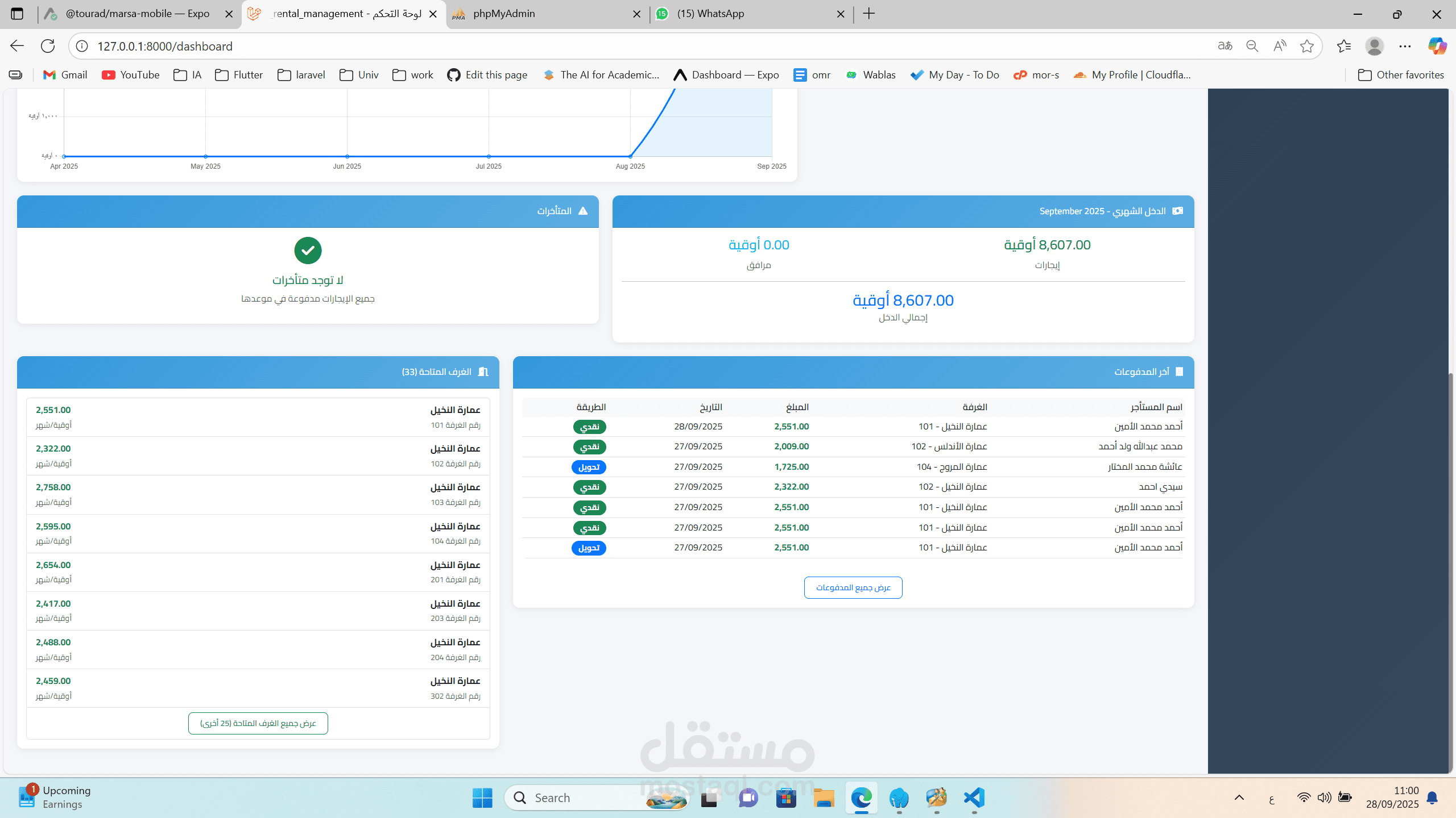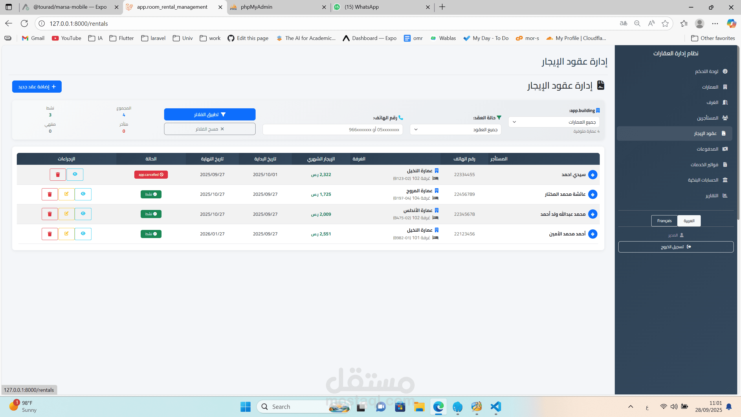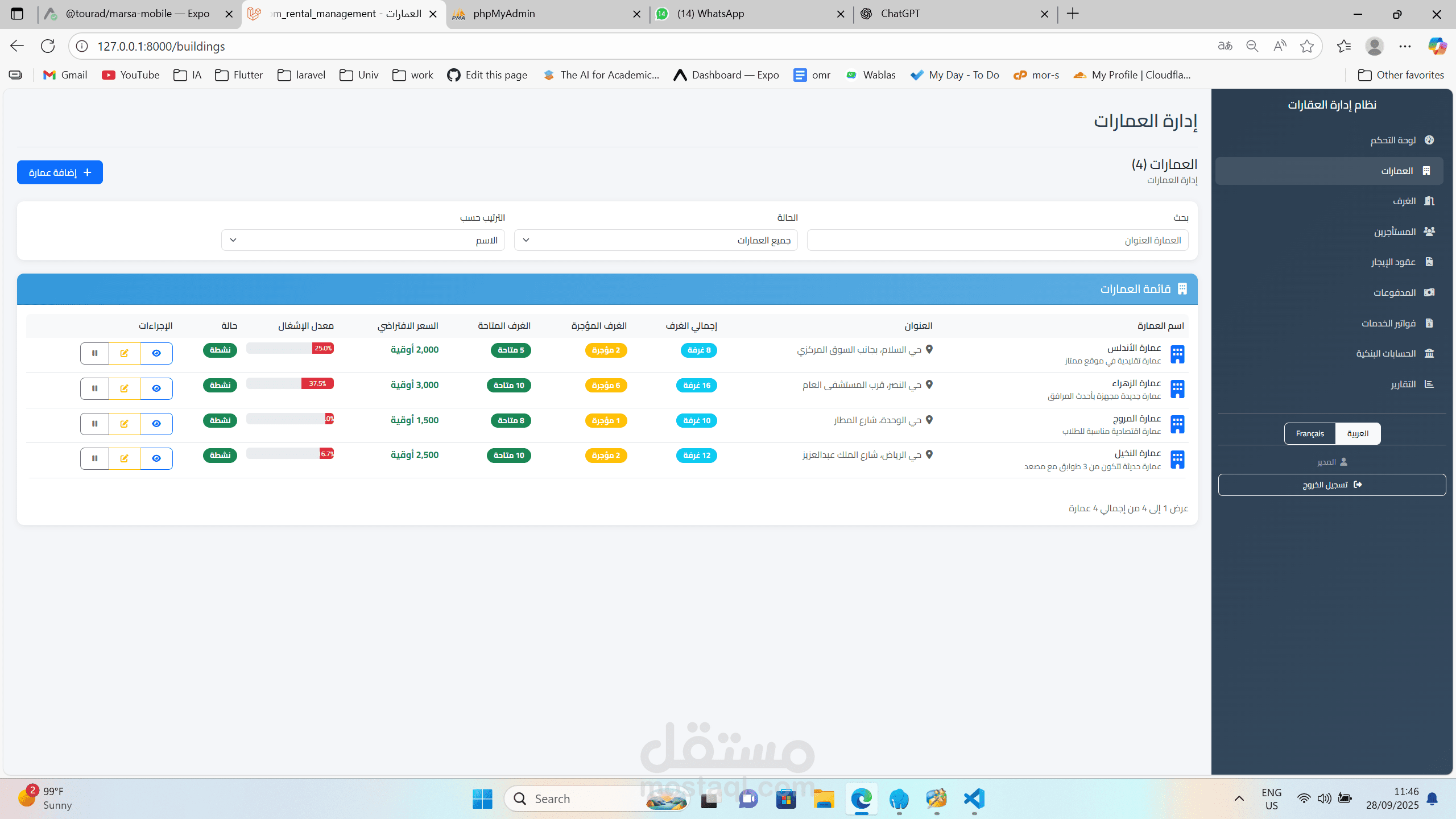 تطوير نظام ويب لإدارة كراء الغرف في العمارات، مع متابعة دفعات الإيجار الشهرية، وفواتير الماء والكهرباء كل شهرين، بالإضافة لتوليد تقارير احترافية (PDF) عن حالة الكراء والمديونيات.