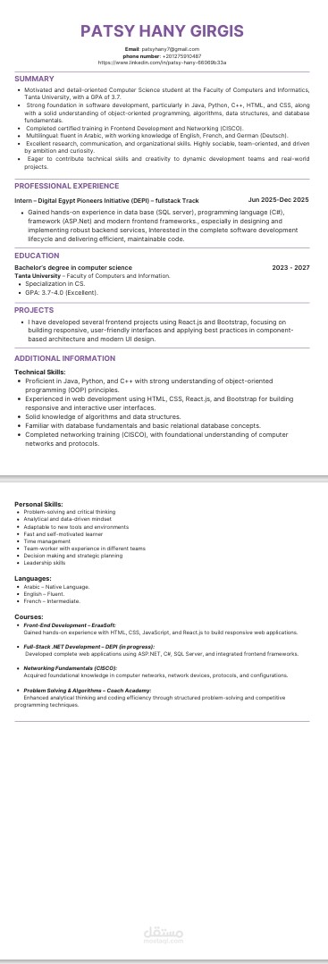 قمت بإعداد وتصميم سير ذاتية احترافية تناسب مختلف المجالات المهنية، مع التركيز على إبراز مهارات وخبرات العميل بطريقة منظمة وجذابة تسهّل عملية القبول في الوظائف.