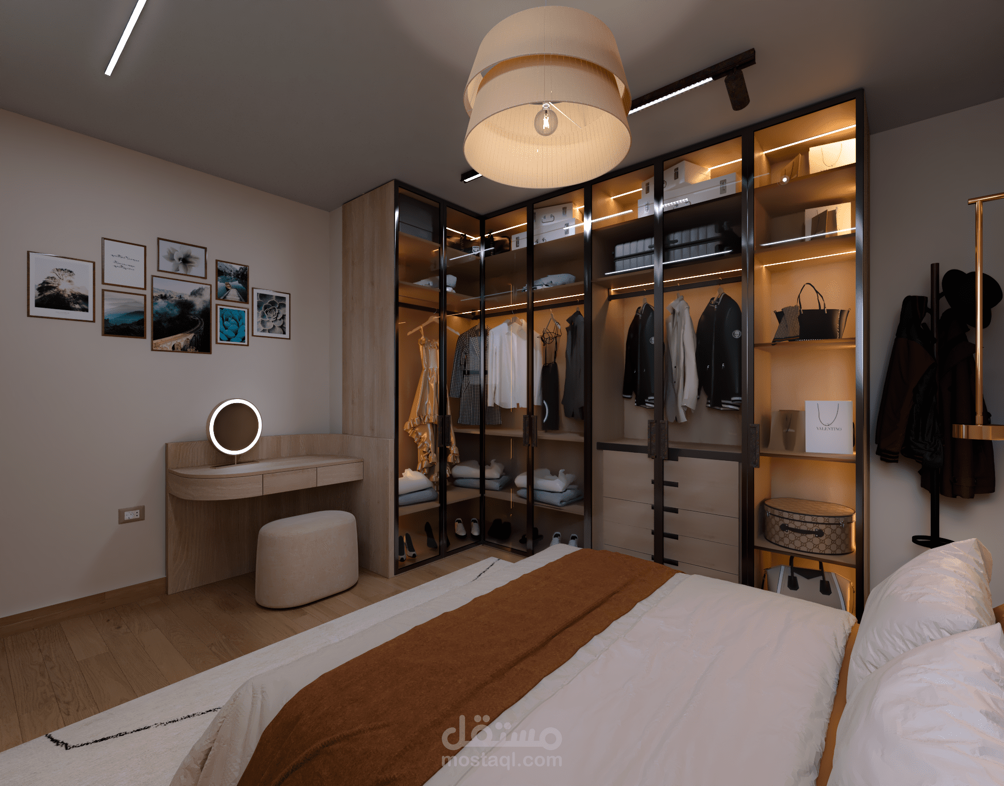غرفة نوم ماستر بتصميم عصري يجمع بين الفخامة والراحة. تم اختيار الألوان بعناية لخلق أجواء هادئة ومريحة، مع توزيع إضاءة مدروس يبرز جمال التفاصيل. الأثاث مصمم ليحقق التوازن بين العملية والأناقة، مما يجعل الغرفة مساحة مثالية للاسترخاء.