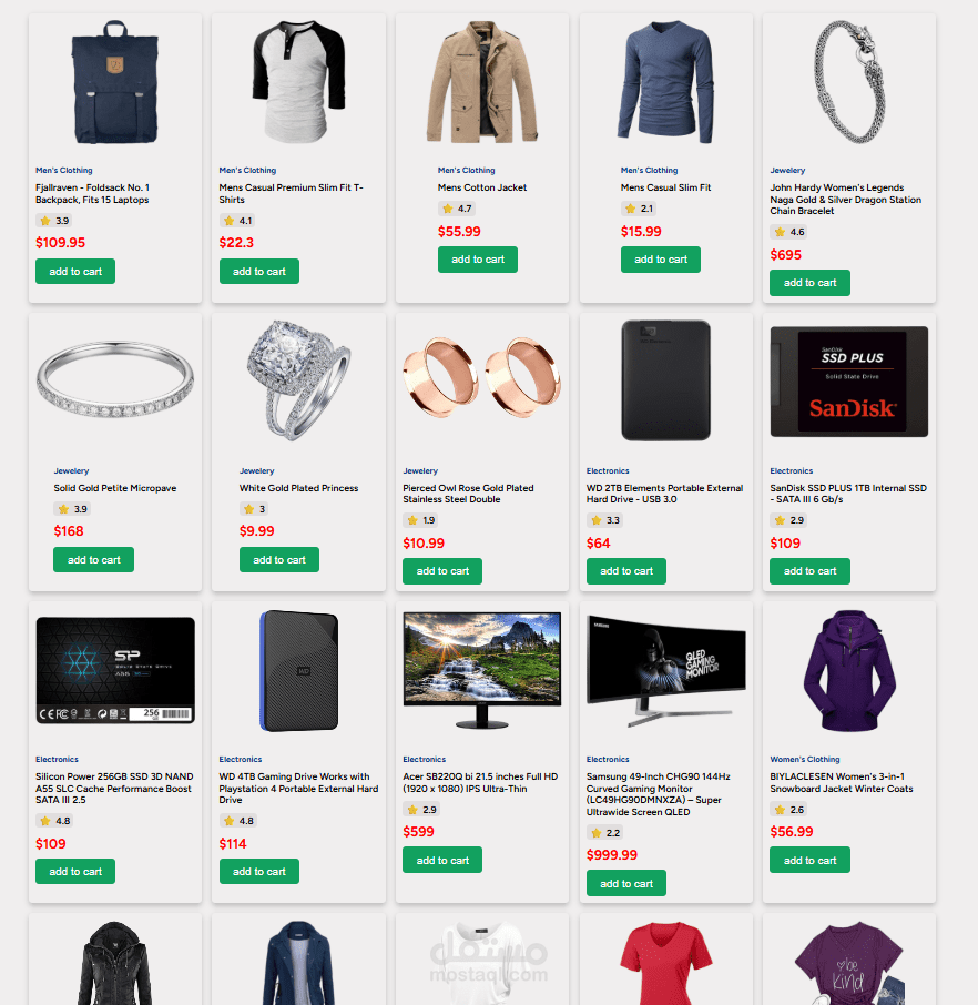 تم تصميم المتجر ليكون منظمًا في شكل بطاقات (Cards) توضح تفاصيل المنتج مثل: الاسم، الفئة، السعر، التقييم وعدد النجوم، مع زر مباشر لإضافة المنتج إلى عربة التسوق.