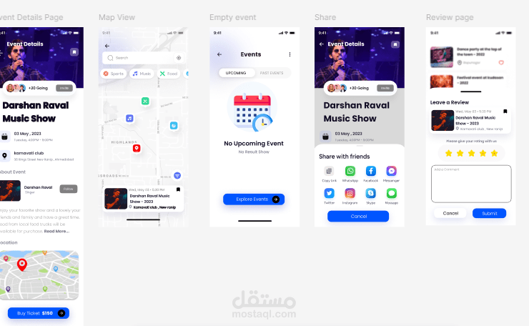 استعراض الأحداث والفعاليات القادمة مع تفاصيل شاملة (المكان، الوقت، السعر).