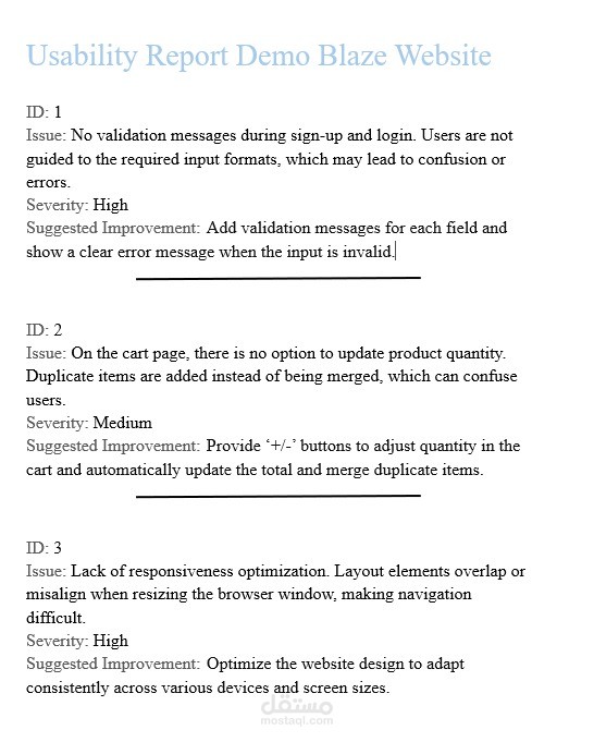 • تسليم جميع الوثائق والتقارير: Requirement Analysis، Test Cases، Execution Results، Defect Logs، Usability Report، Regression Report، JIRA Migration Proof.
