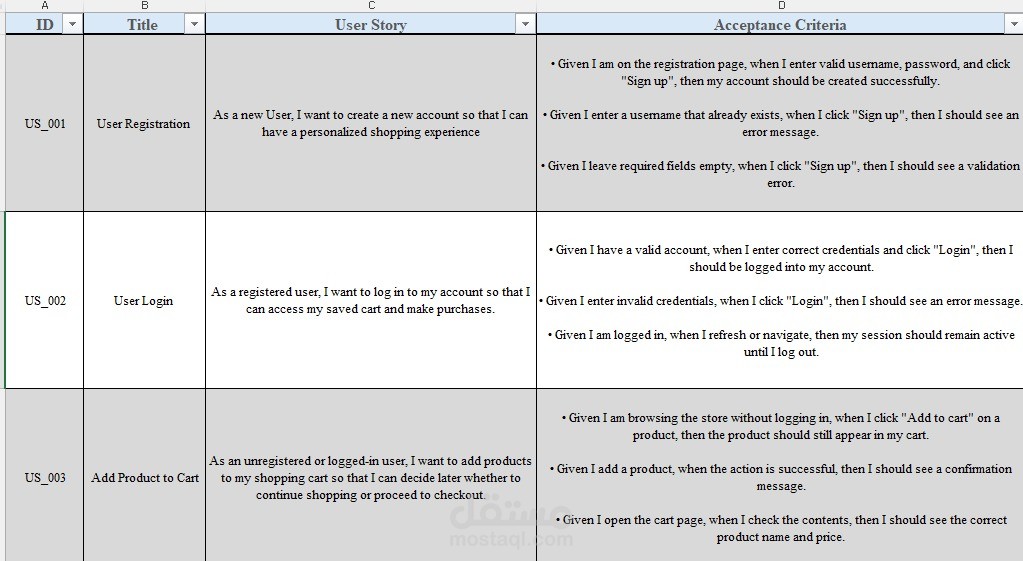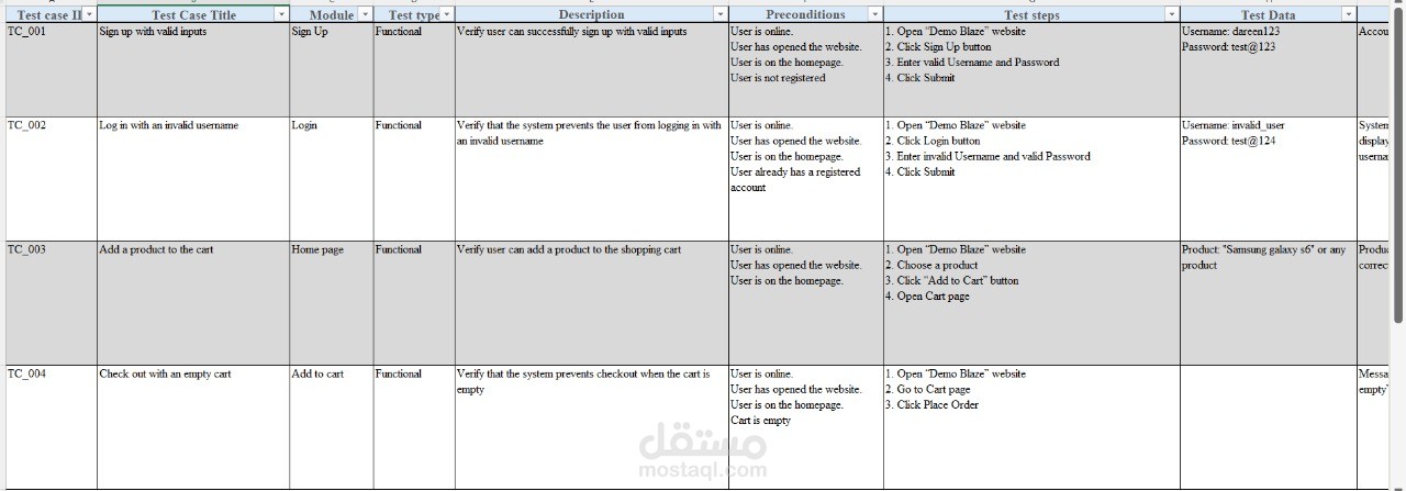 • تصميم حالات الاختبار (Test Case Design) لكل ميزة: Sign Up، Login، Product Filtering، Cart، Checkout.