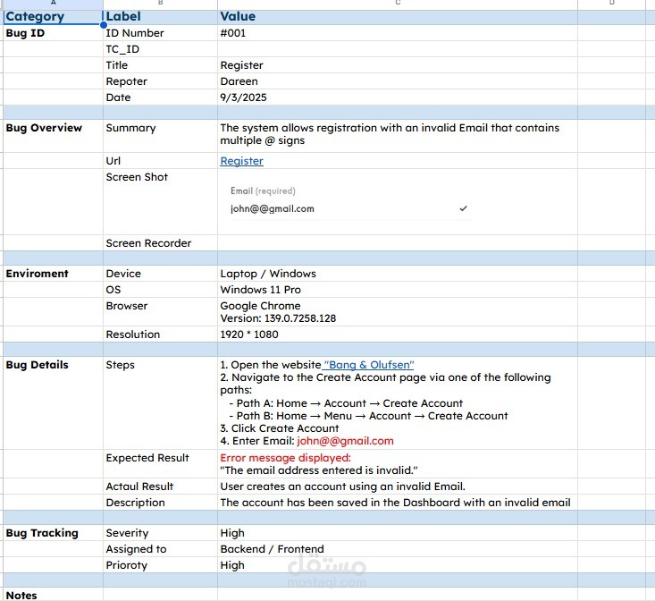 تسجيل جميع الأخطاء وإعداد تقرير تفصيلي يشمل خطوات إعادة الإنتاج ونتائج الاختبارات.