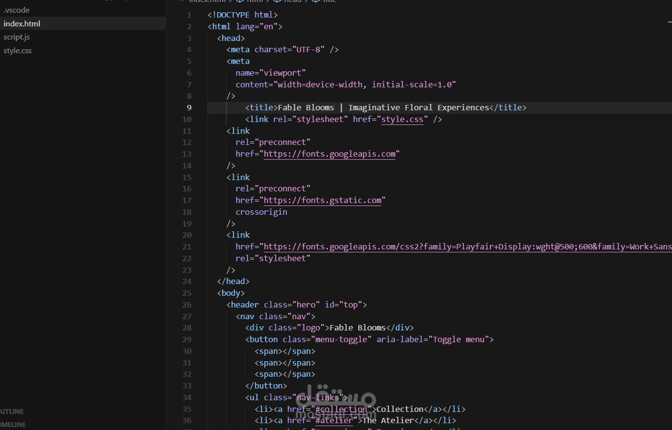 Google Fonts: استيراد خطوط Playfair Display وWork Sans.