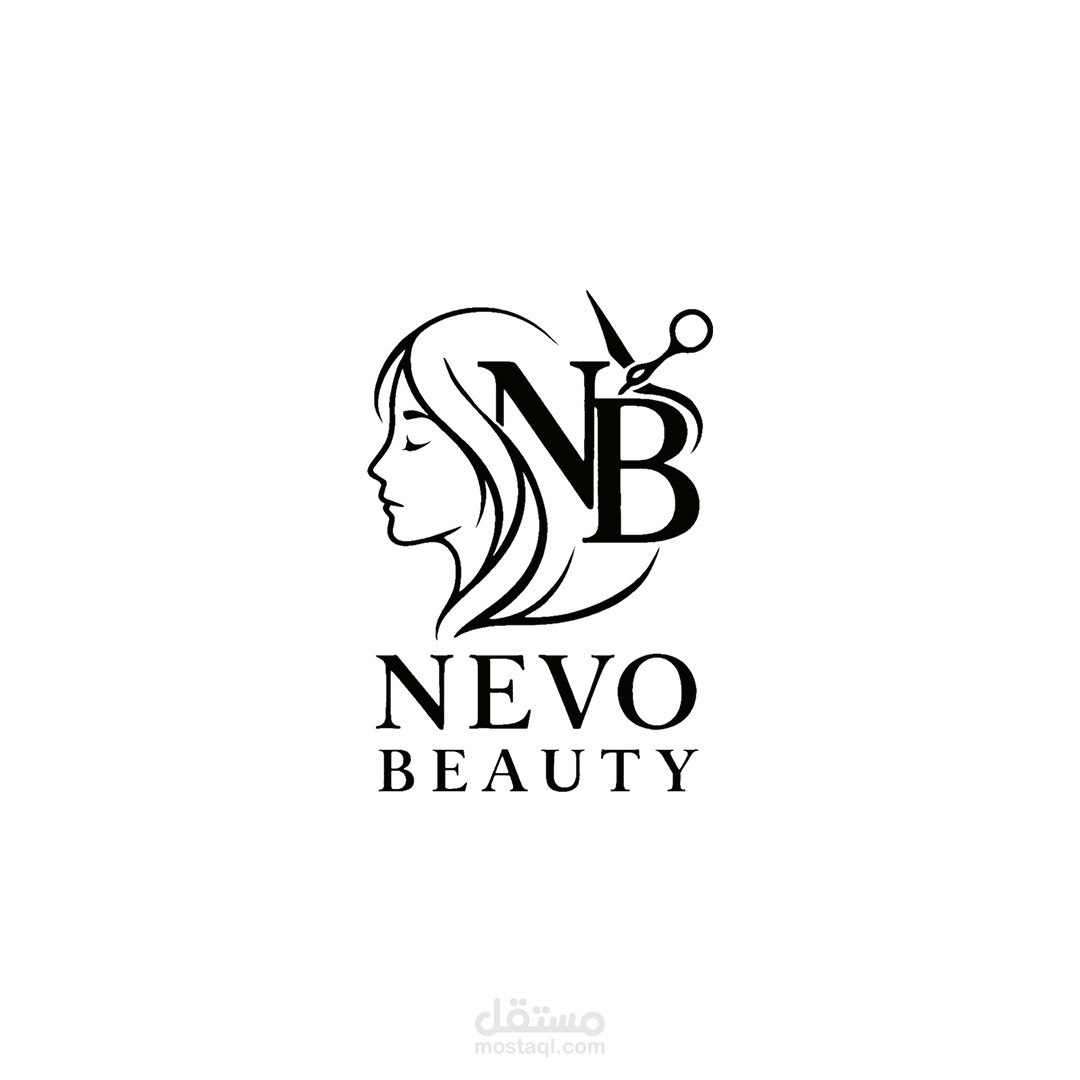 Nevo Beauty Logo: شعار صالون تجميل "Nevo Beauty"، بملامح أنثوية متداخلة مع مقص، للتعبير عن الجمال والاحترافية.