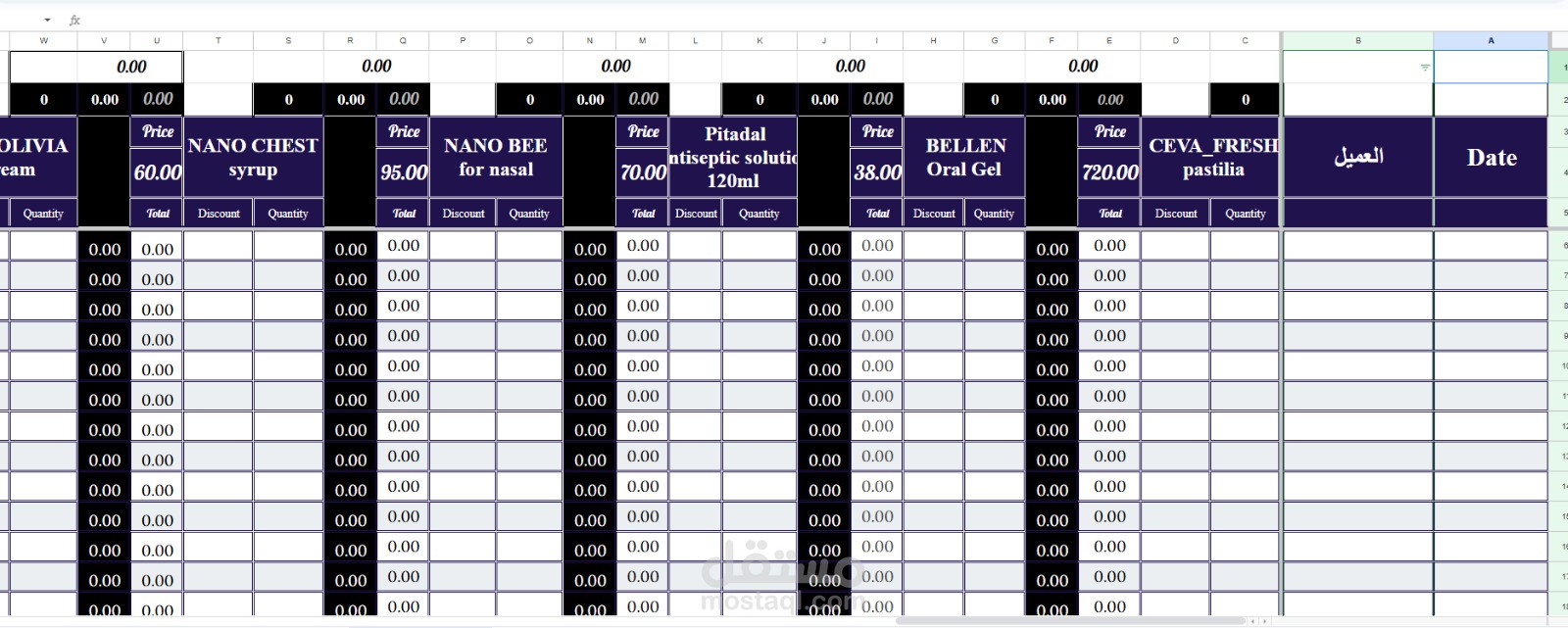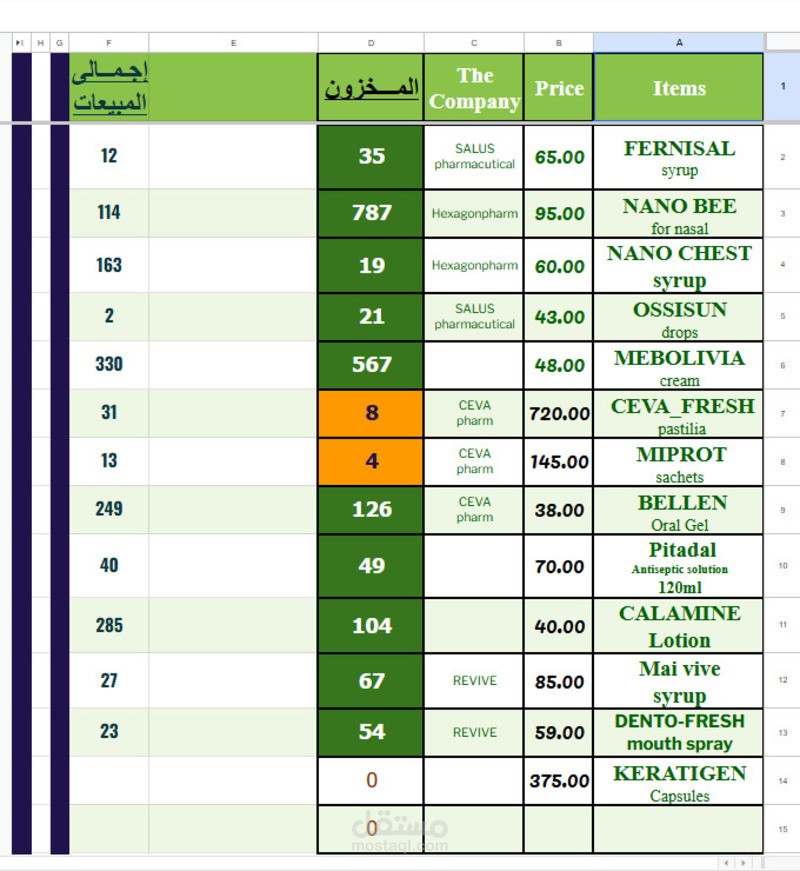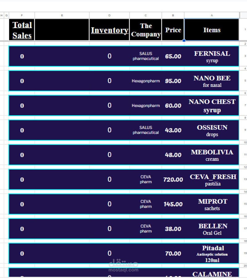 قاعدة بيانات على جوجل شيت لأدارة عمل شركة أدوية مبتدئة يحتوى على ملفات العملاء والوارد والصادر والمخزون والتحصيل وغيره من الأمور التى يتطلبها انجاز العمل .