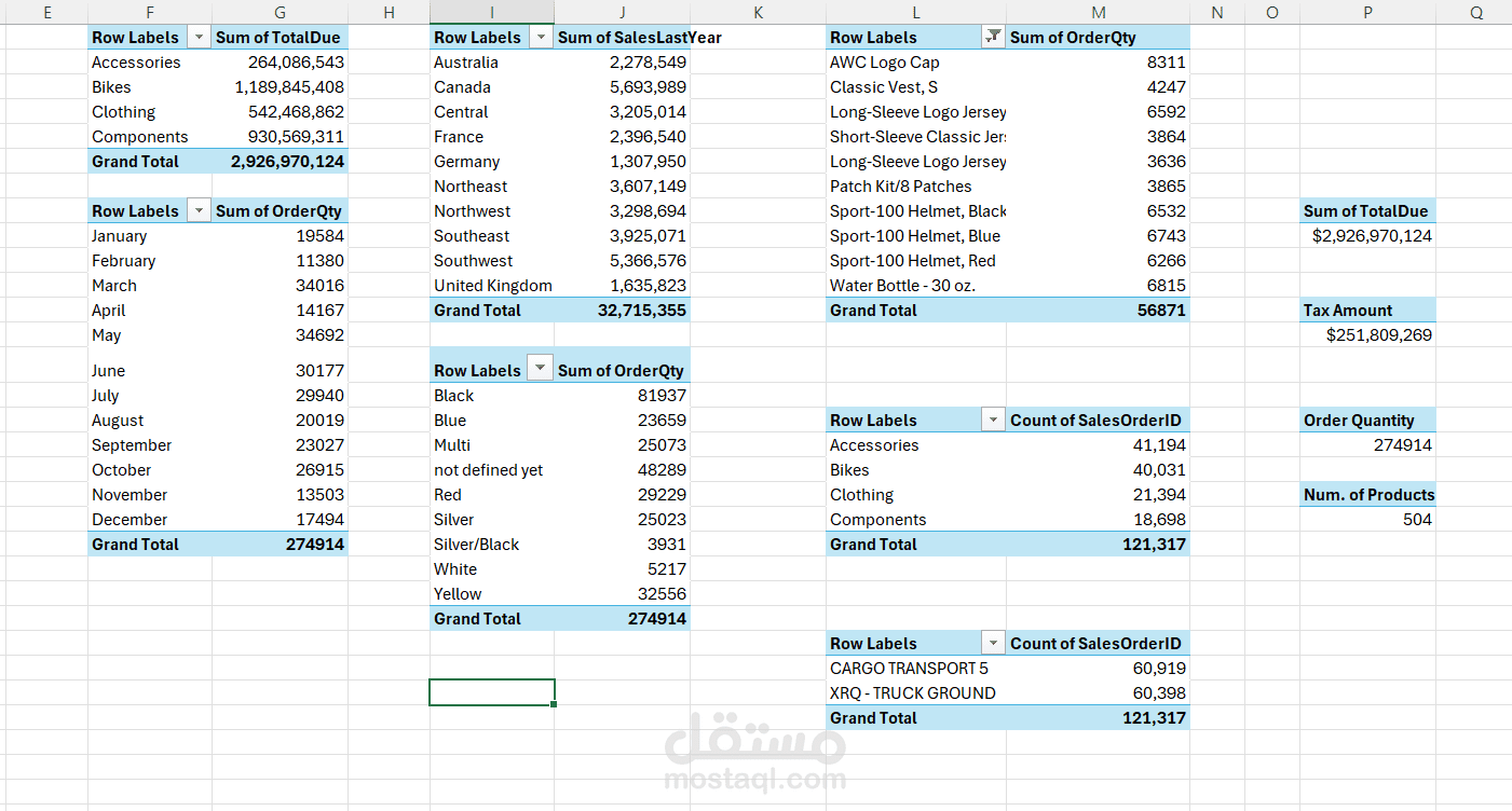 • إضافة أدوات تصفية تفاعلية (Slicers): تصفية البيانات حسب السنة، الفئة (Bikes, Accessories, Clothing, Components)، والمنطقة الجغرافية (مثل: Australia, Canada, United Kingdom).