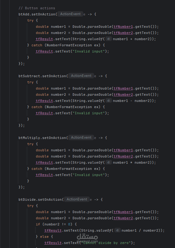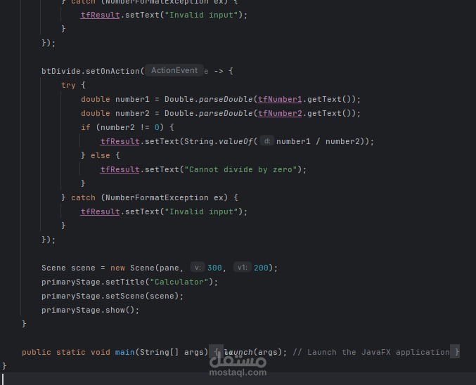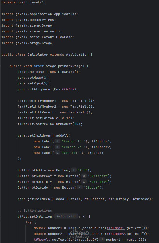 A graphical calculator application built with JavaFX. The program allows the user to input two numbers and perform basic arithmetic operations (addition, subtraction, multiplication, division). It uses a simple GUI with text fields, labels, and buttons, and includes error handling for invalid inputs and division by zero.