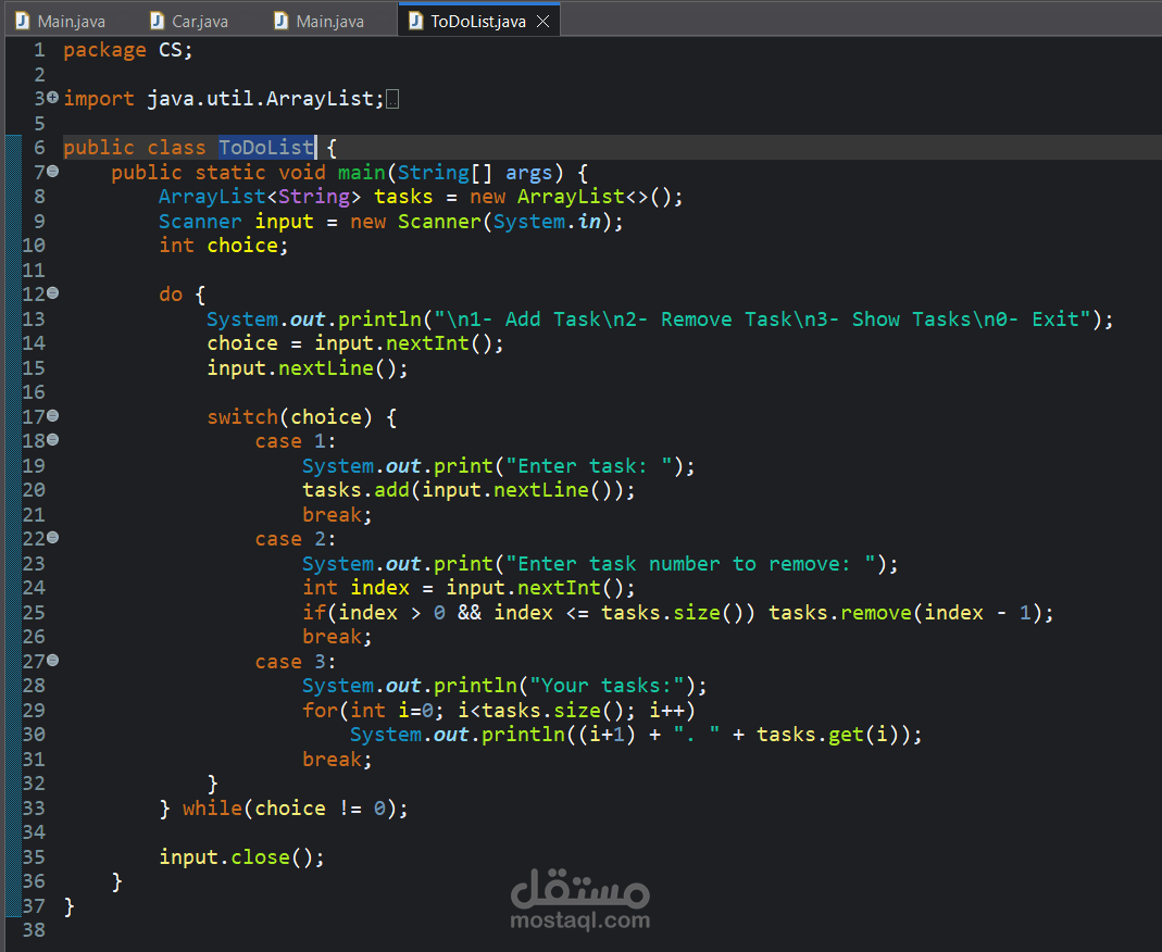 A simple console-based Java application for managing daily tasks. It allows users to add, remove, and display tasks using an interactive menu. The program is implemented with ArrayList for dynamic task storage and basic control structures for user interaction.