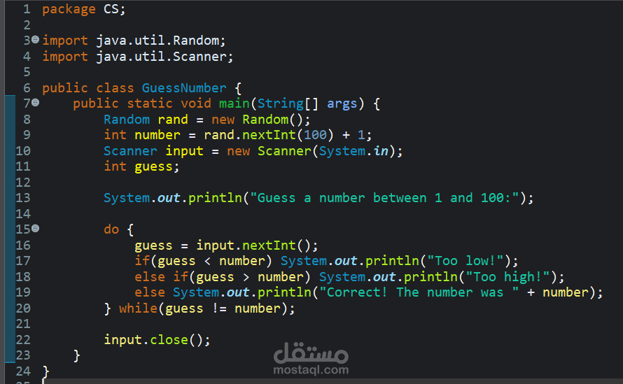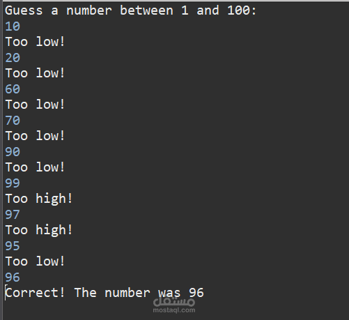 An interactive Java console game where the program generates a random number between 1 and 100, and the user tries to guess it. The program provides hints (“Too high” or “Too low”) until the correct number is guessed.