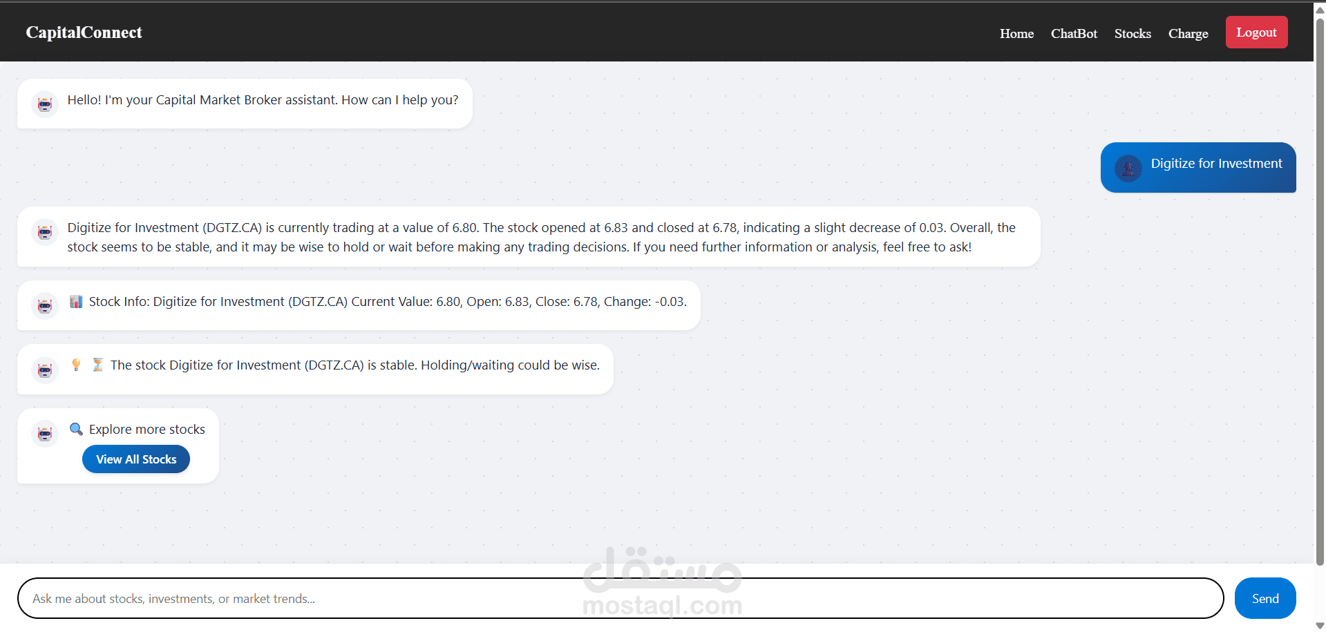 Built a stock trading assistant using Angular, .NET, MySQL, Bootstrap, and NGX Charts. The system allows users to buy and sell stocks, view livestock prices, and track their portfolio through a real-time dashboard. Integrated a chatbot that provides stock recommendations (buy/sell/hold) based on user queries, enhancing decision-making and user engagement.