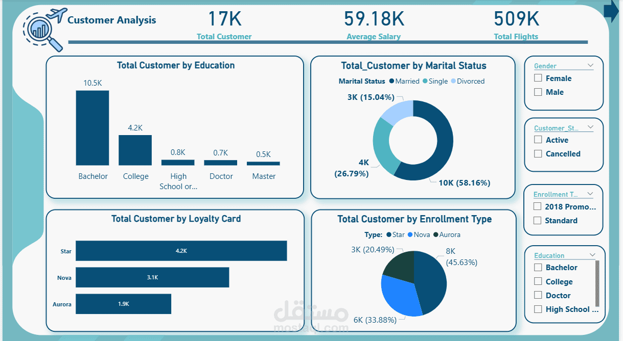 قمت بتطوير داشبورد تفاعلي خاص ببرنامج ولاء العملاء لشركة طيران، يوضح نقاط العملاء ومستويات العضوية بشكل مبسط وواضح.