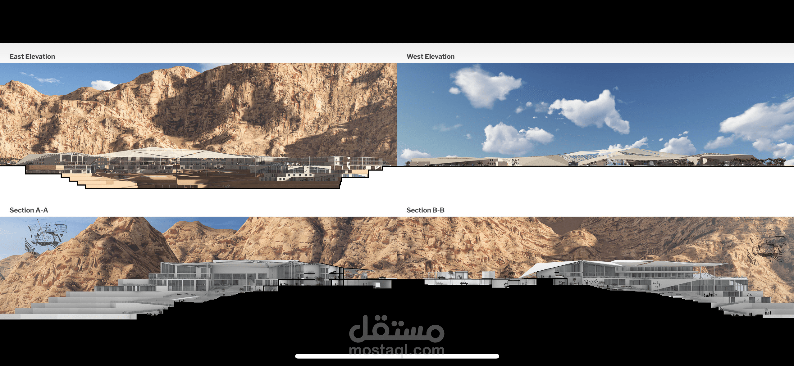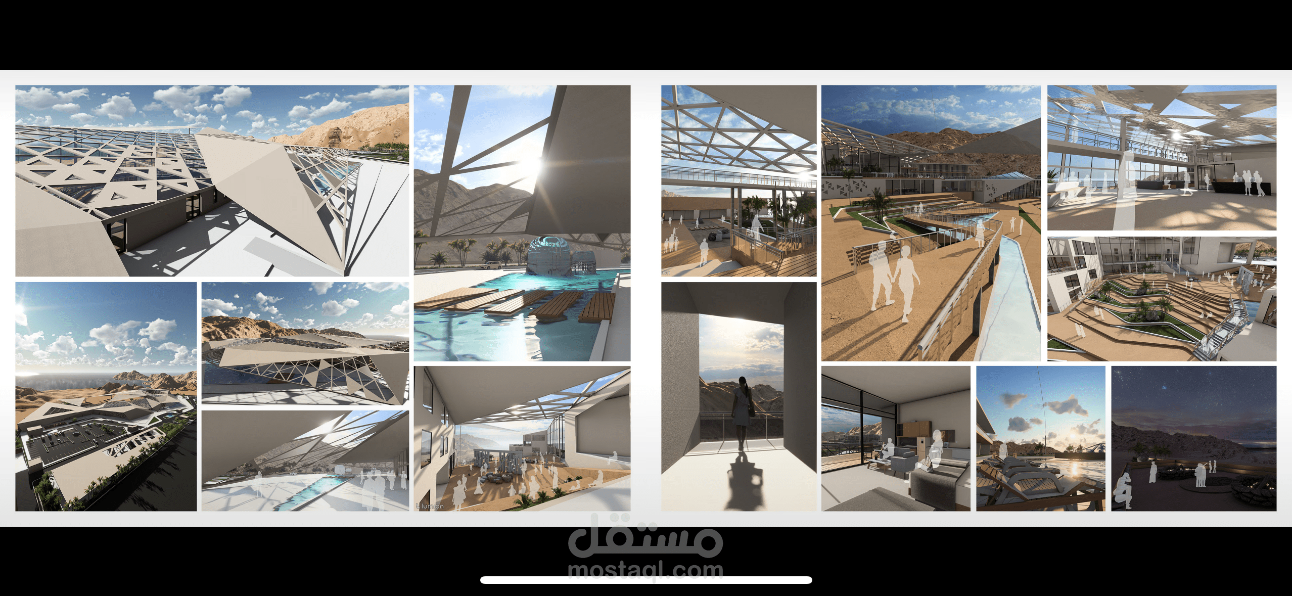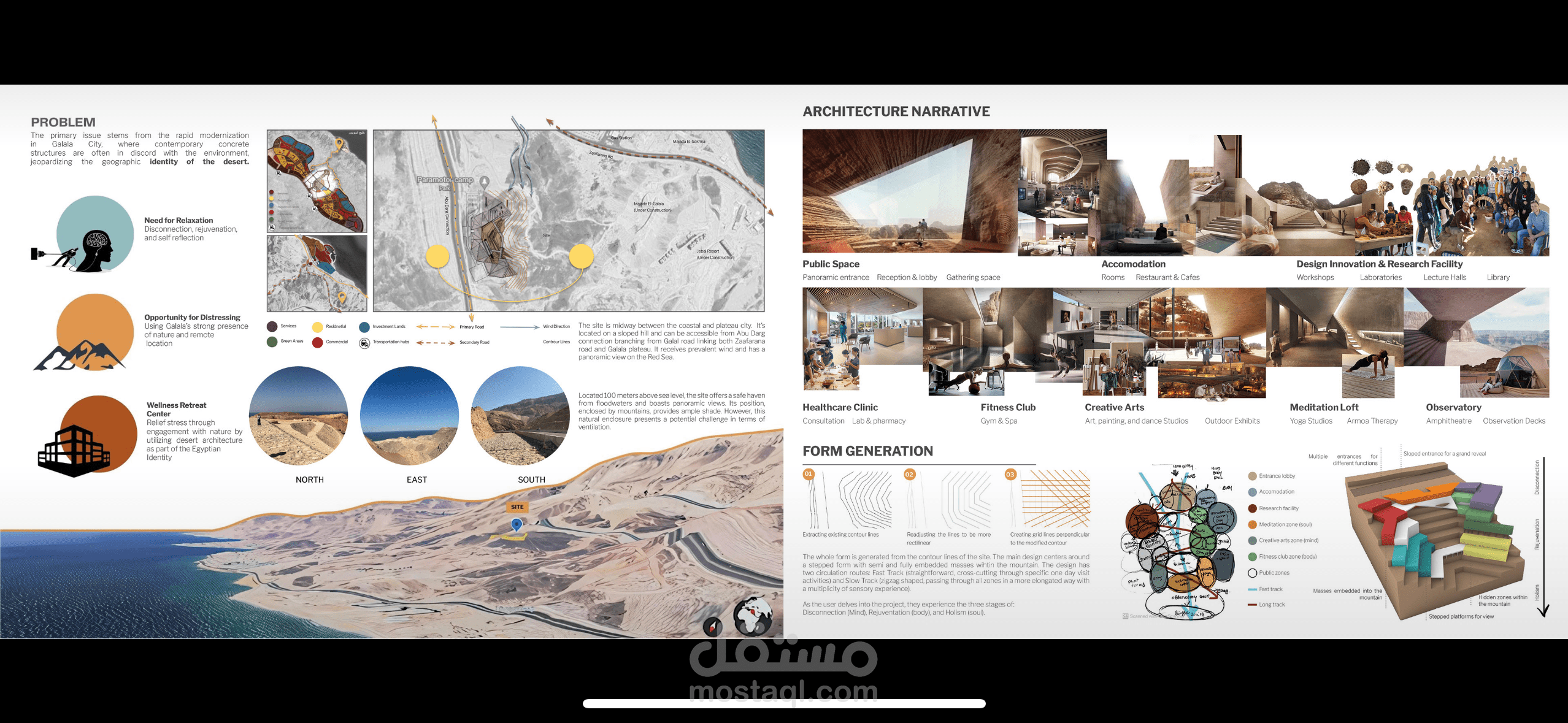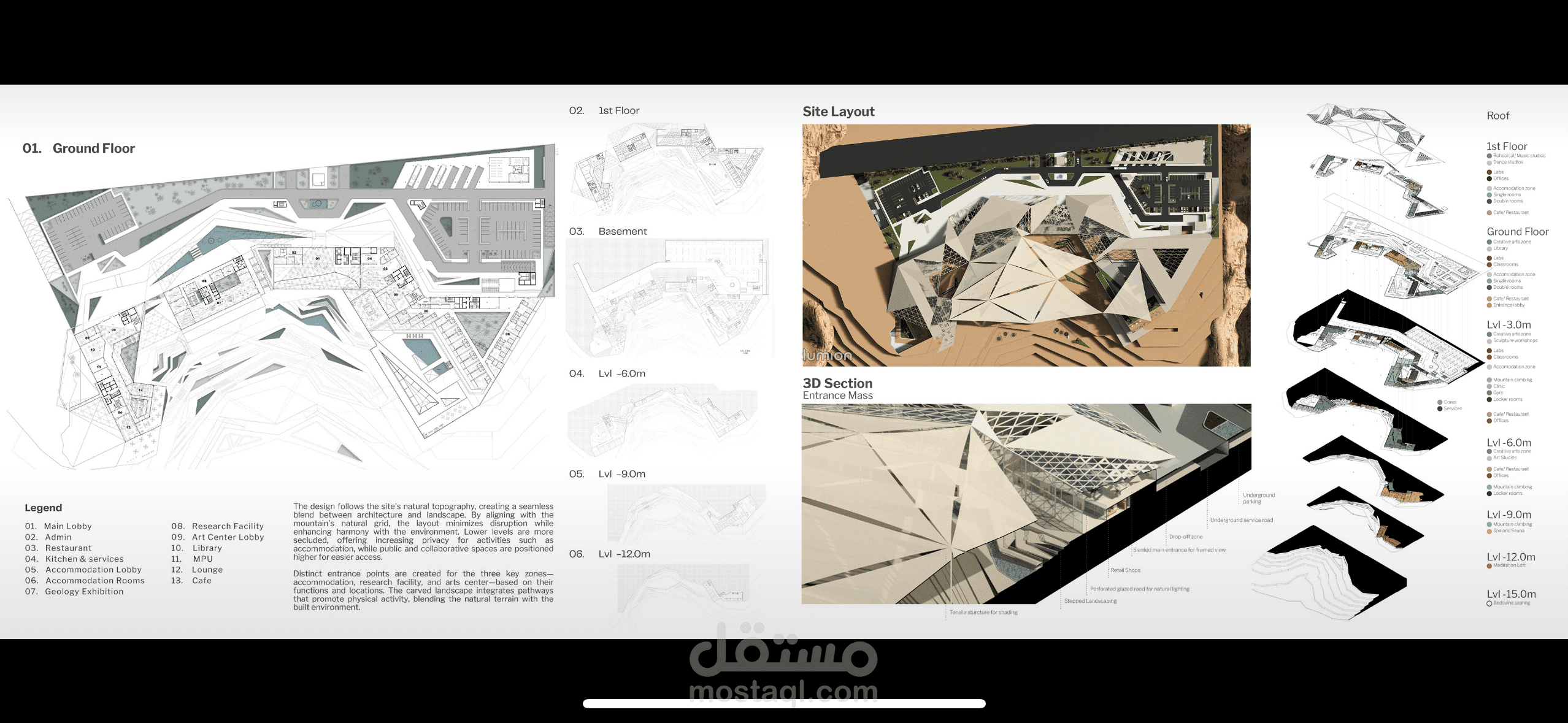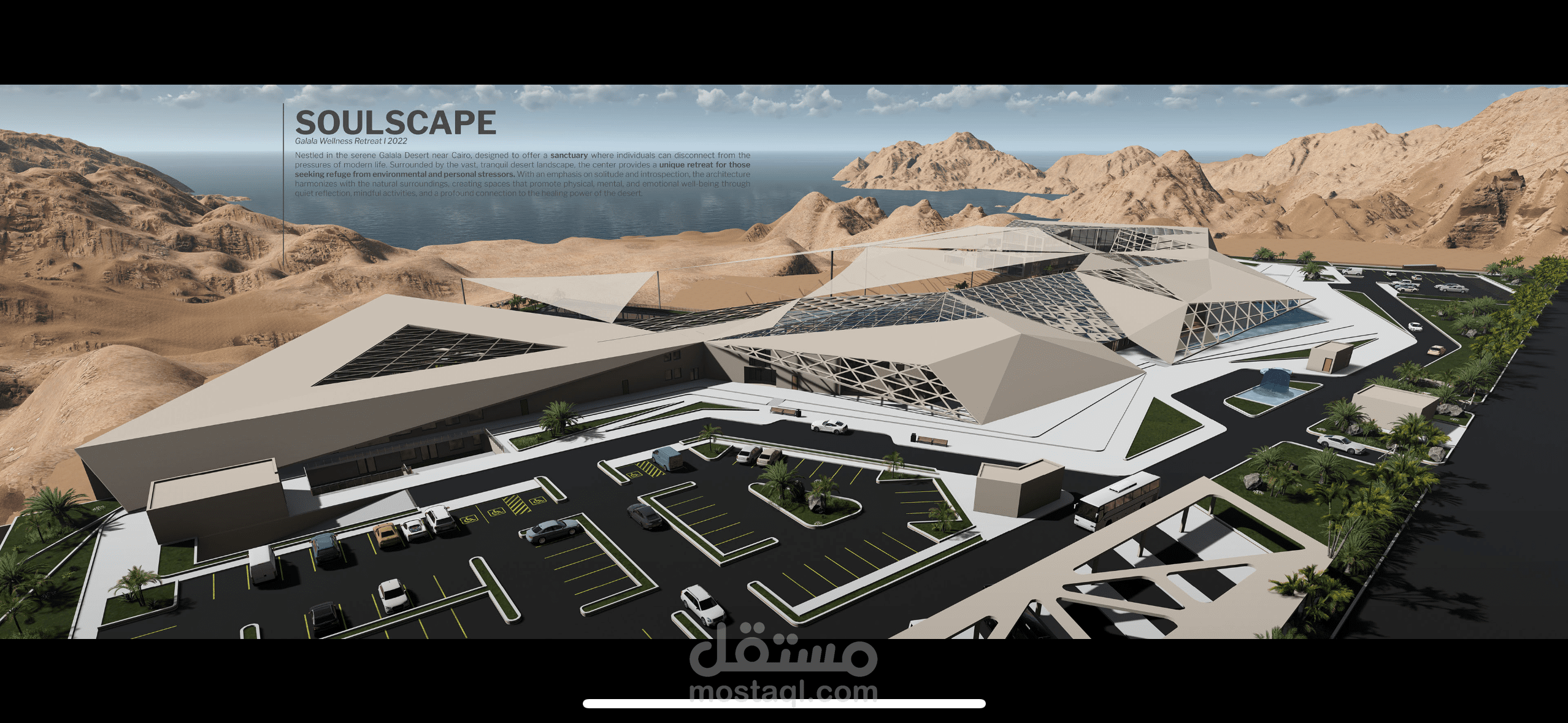 The design addresses the challenge of disconnection from nature prevalent in contemporary concrete structures. SOULSCAPE adopts an architectural vision that seamlessly merges modern design with the desert topography. The building is intelligently embedded into the rocky terrain, creating staggered levels that descend up to -15.0 meters. This integration promotes environmental harmony and creates protected, warm interior spaces that open up to panoramic views of the desert and the sea.
