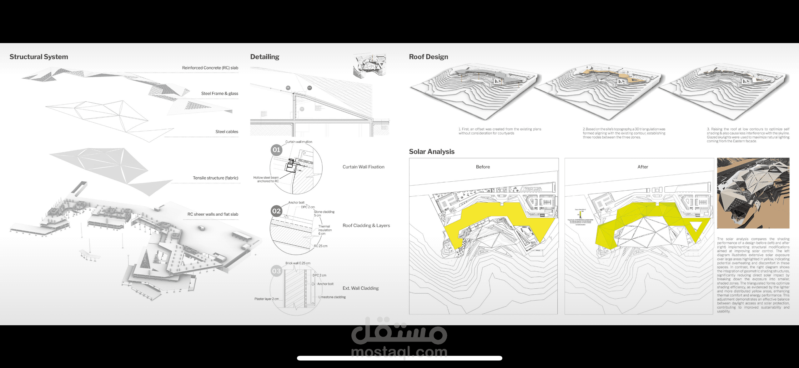 * Solar-Conscious Roof Design: The intricate roof geometry was developed to be solar-conscious, providing effective self-shading and optimizing daylight penetration from the Eastern facade. The accompanying Solar Analysis demonstrated the success of this design in significantly reducing direct solar heat gain, thus improving energy efficiency and thermal comfort.