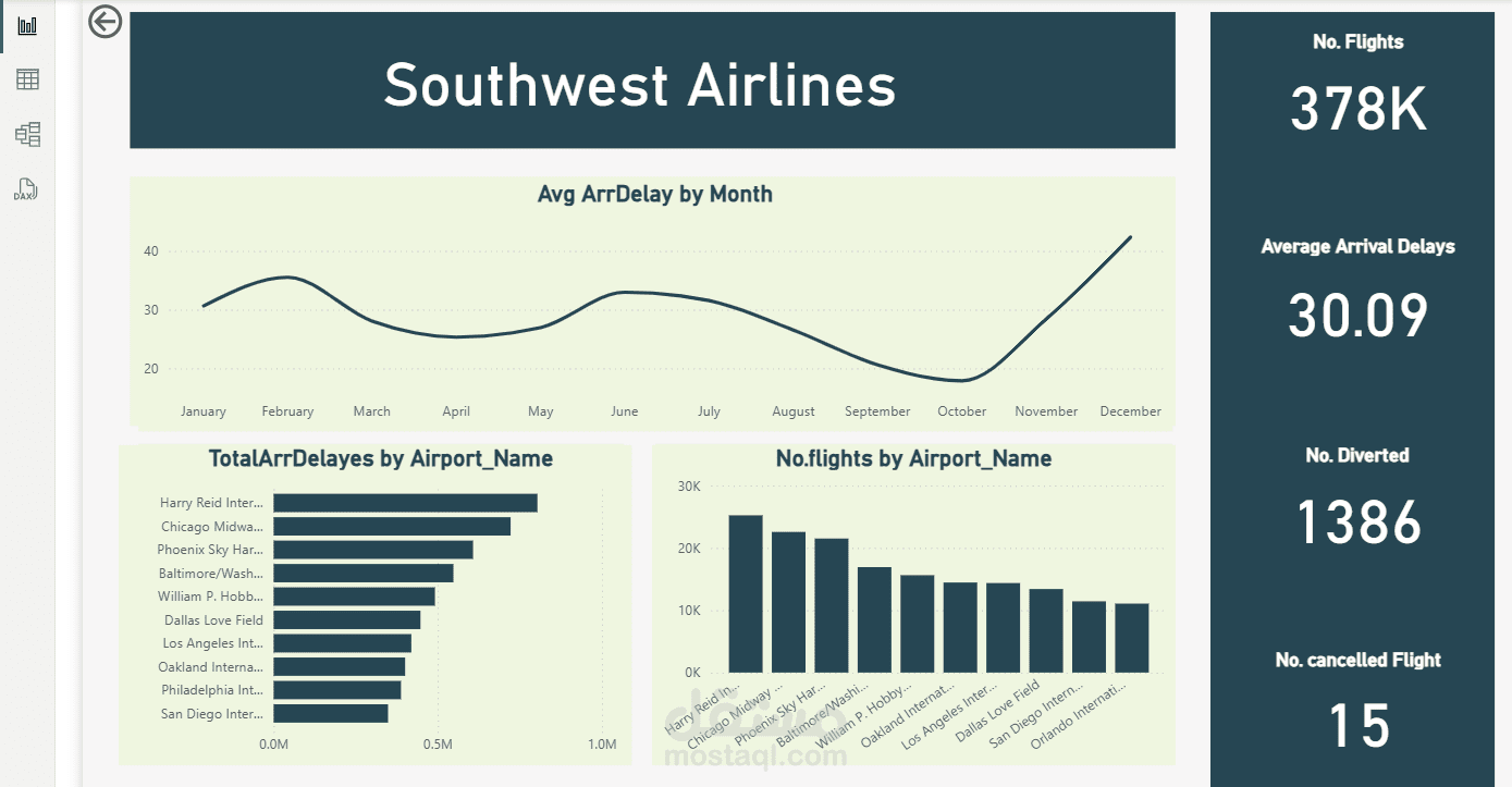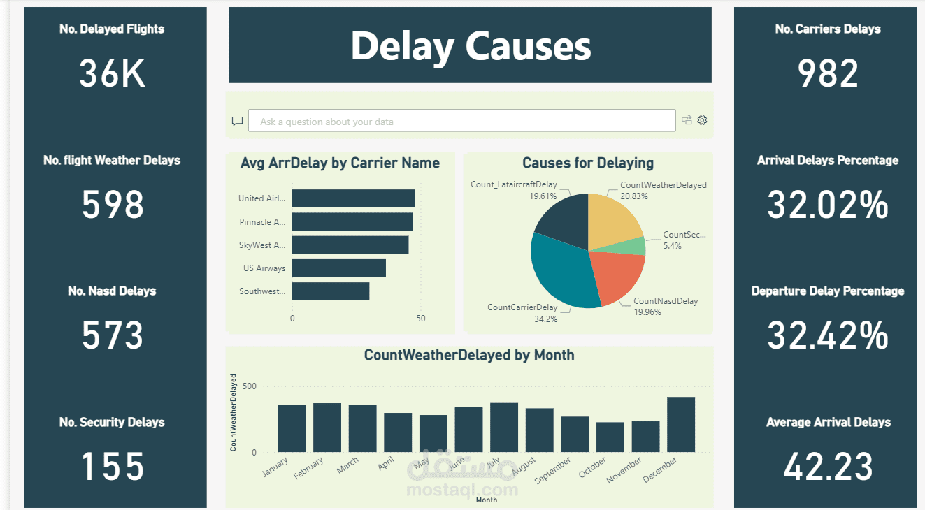 تقوم لوحة معلومات Power BI هذه بتحويل الملايين من سجلات الرحلات الجوية إلى رؤى عملية وقابلة للتنفيذ. هي تقدم نظرة شاملة وكاملة على تأخيرات الطيران، مع تحليلها حسب السبب (مثل الطقس، شركة الطيران، وغيرها)، كما تتيح للمستخدمين التعمق في الأداء التفصيلي لشركات الطيران والمطارات بشكل فردي. إنها أداة قوية مصممة للمساعدة في تحديد معوقات التشغيل الرئيسية.