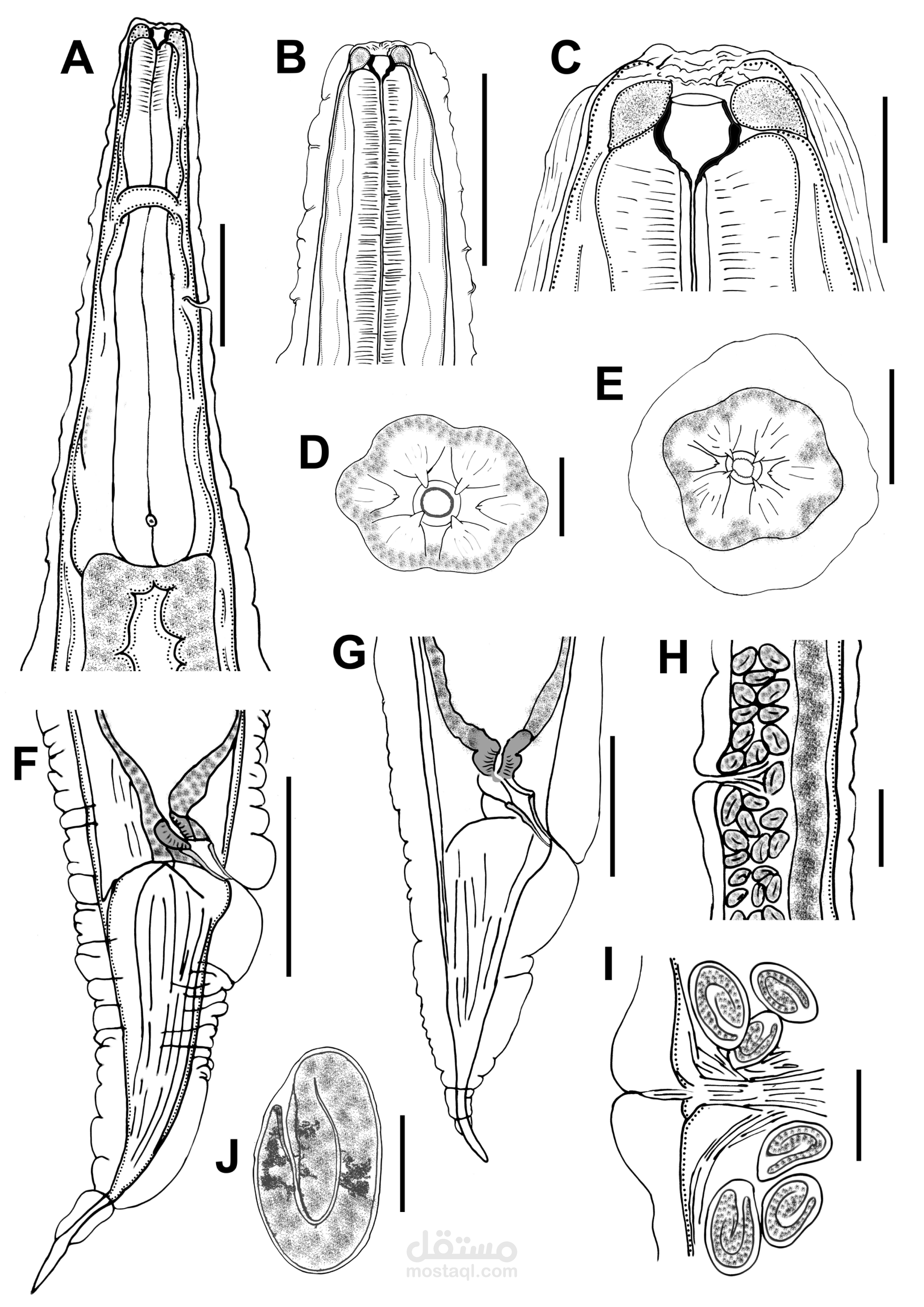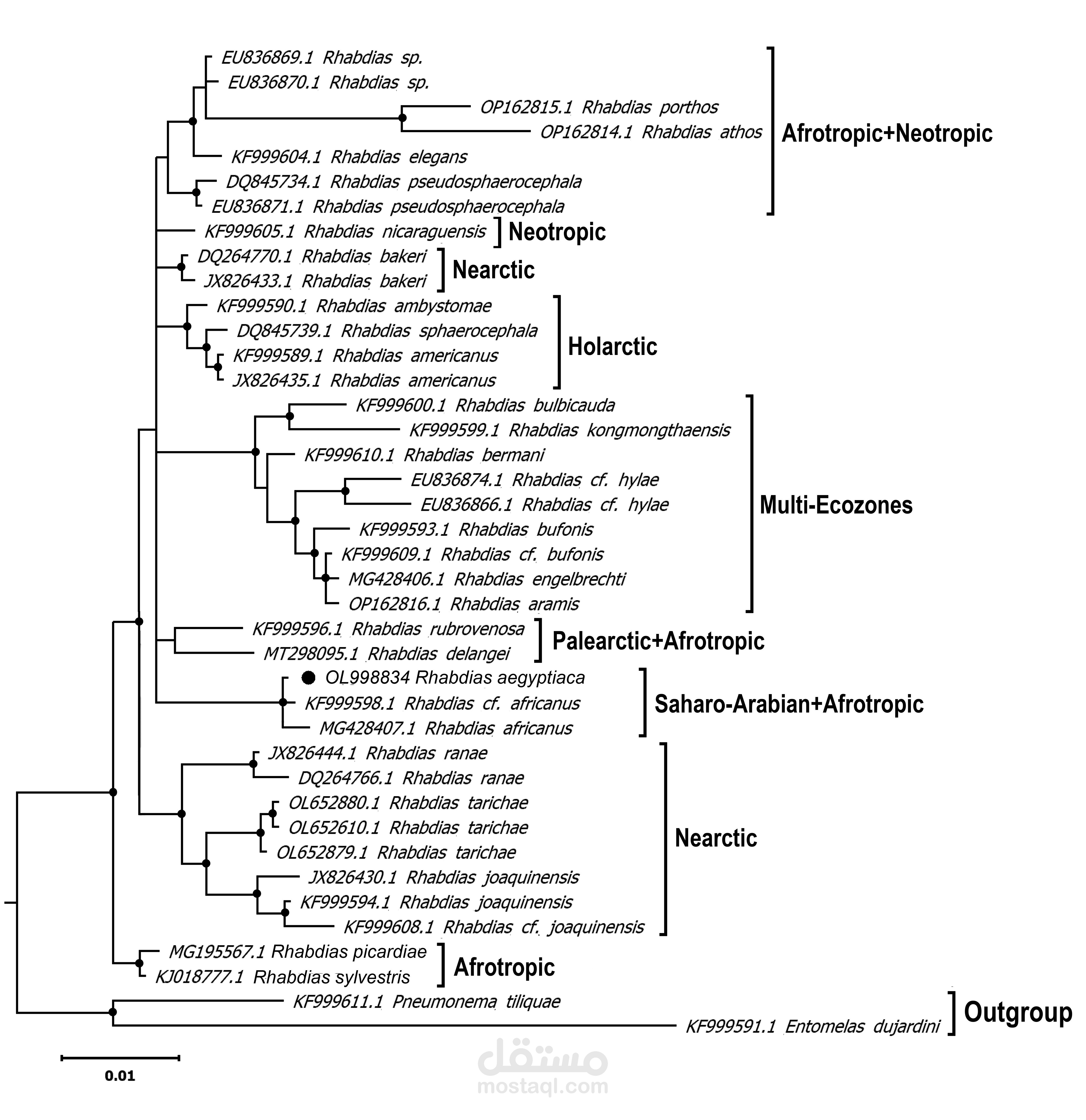 هذا العمل هو مراجعة وتوصيف تصنيفي عميق لجنس Rhabdias في شمال إفريقيا، بهدف حل الغموض التصنيفي القائم وتحديد الأنواع الحقيقية. الميزة الأساسية للعمل هي إجراء إعادة وصف شاملة للنوع الإفريقي/الصحراوي-العربي Rhabdias aegyptiaca